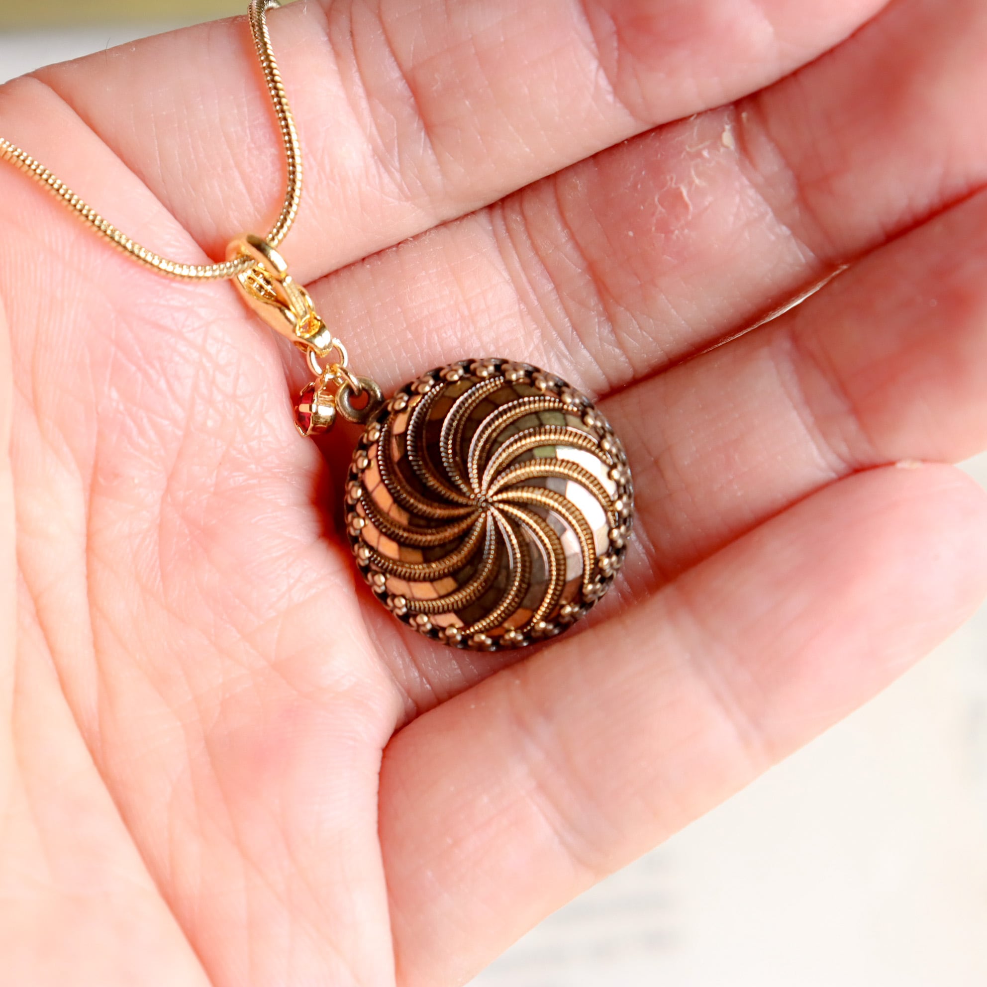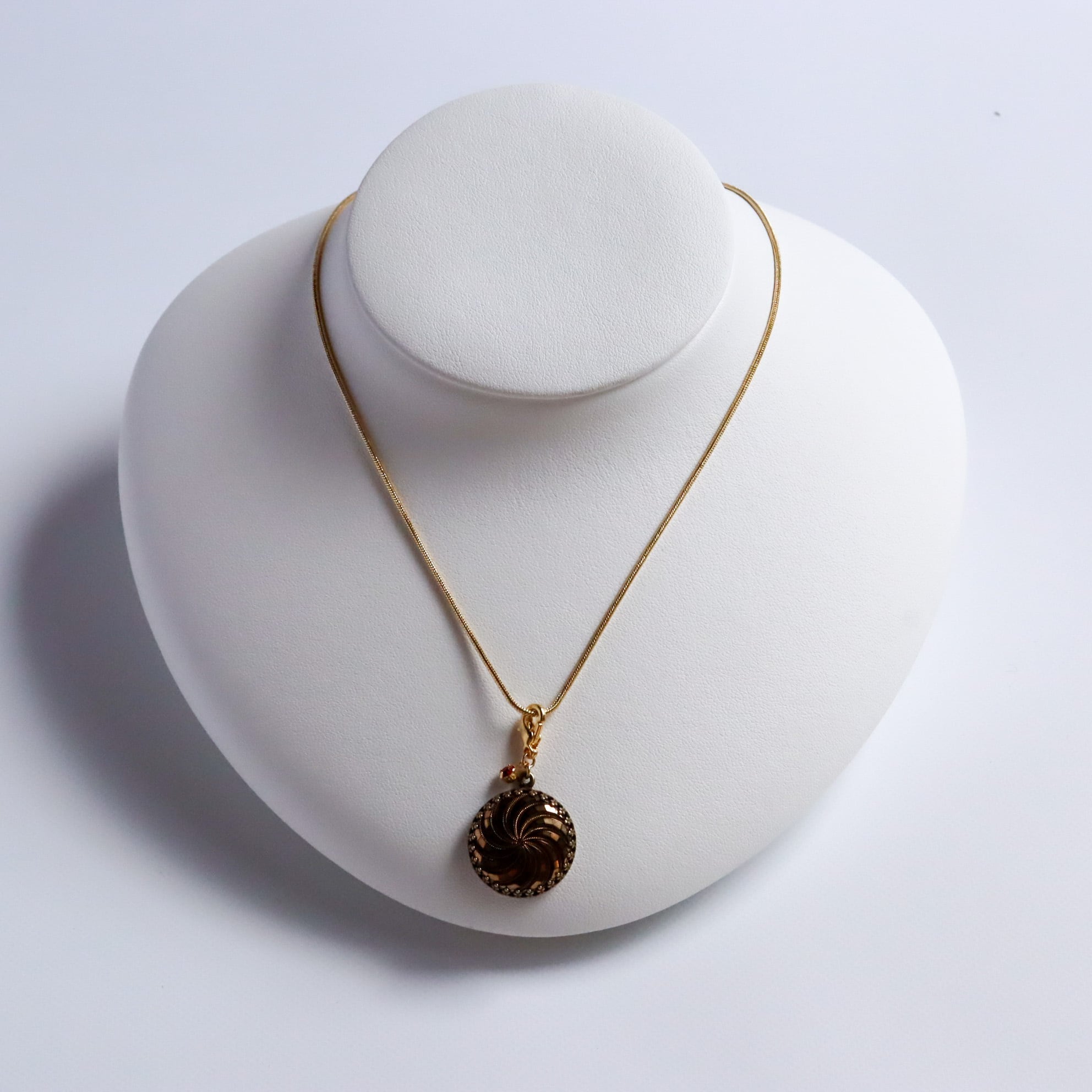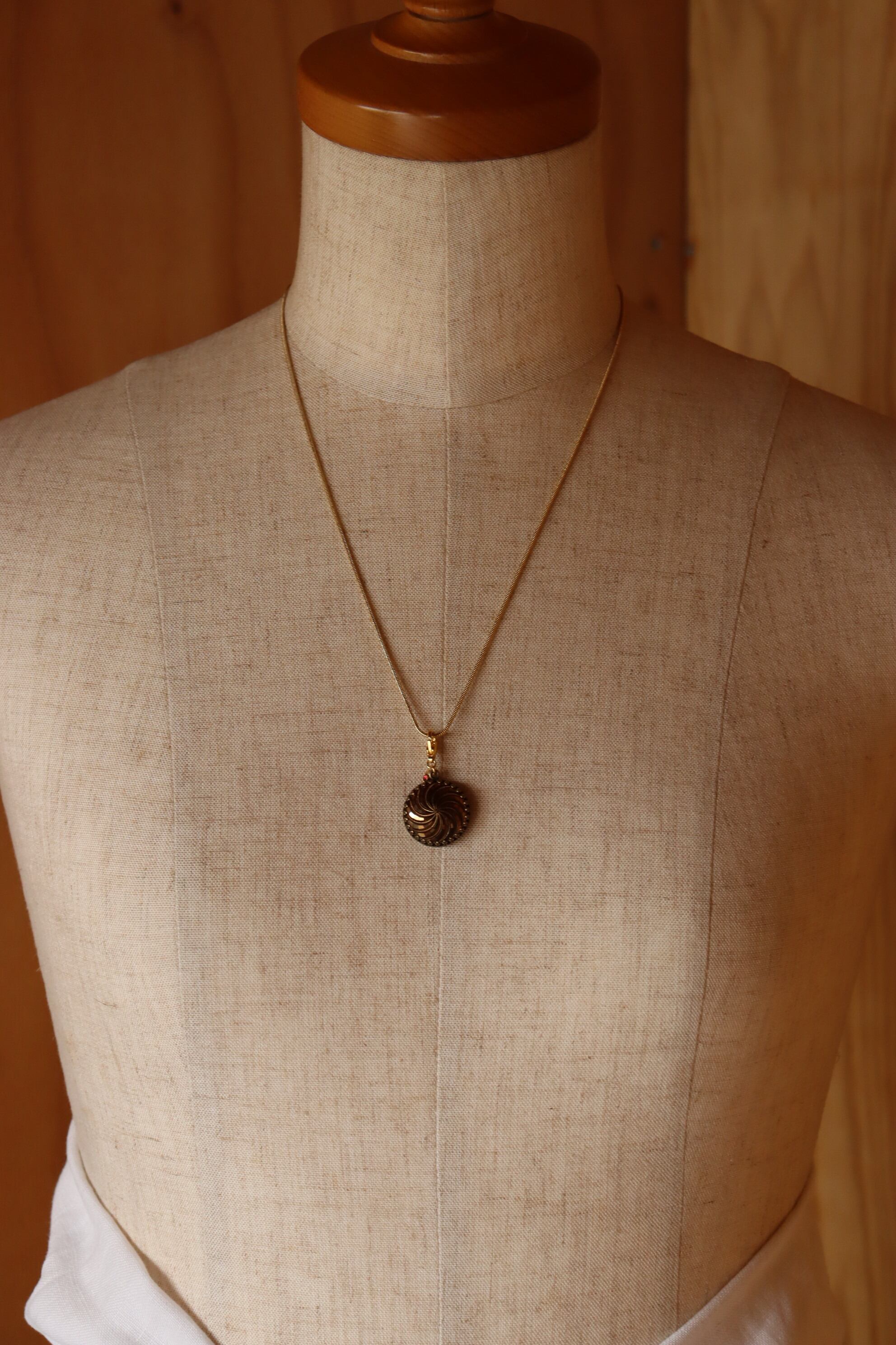 1950年、ドイツで製造されたグラスボタンを使用し、金古美色のセッティング台に仕立てたネックレスのご紹介です。