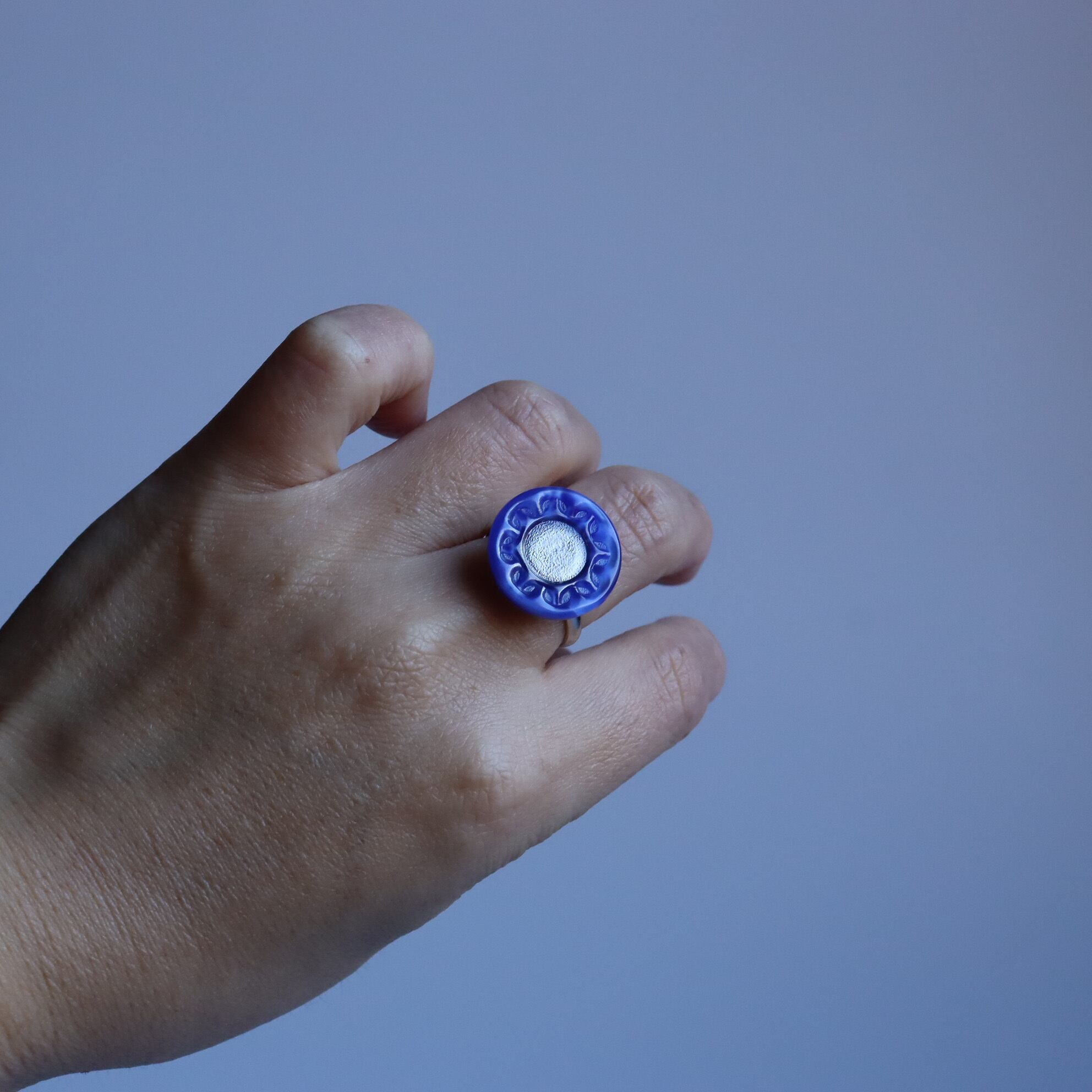 中央の大きな円は、青い花が静かに咲いているかのよう。