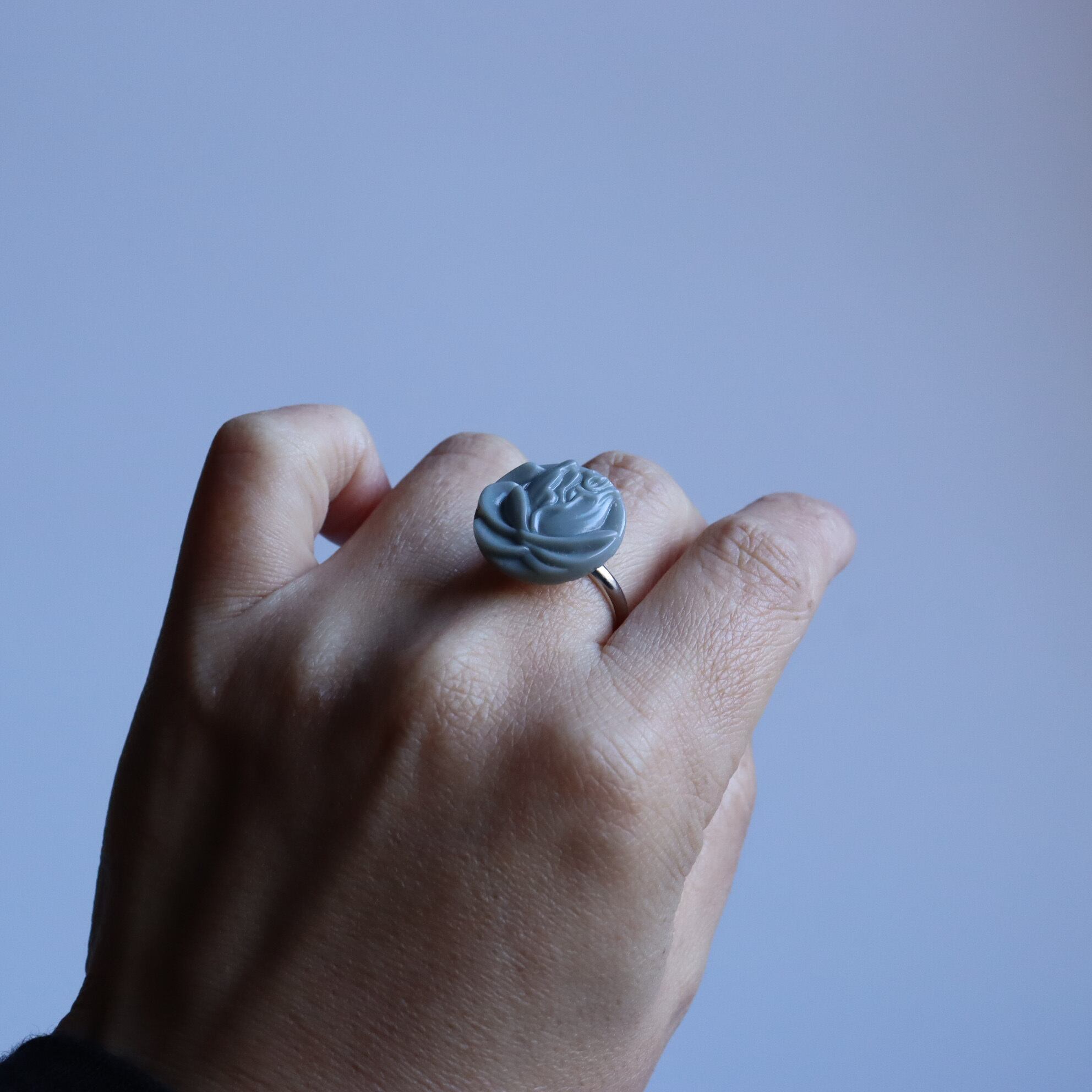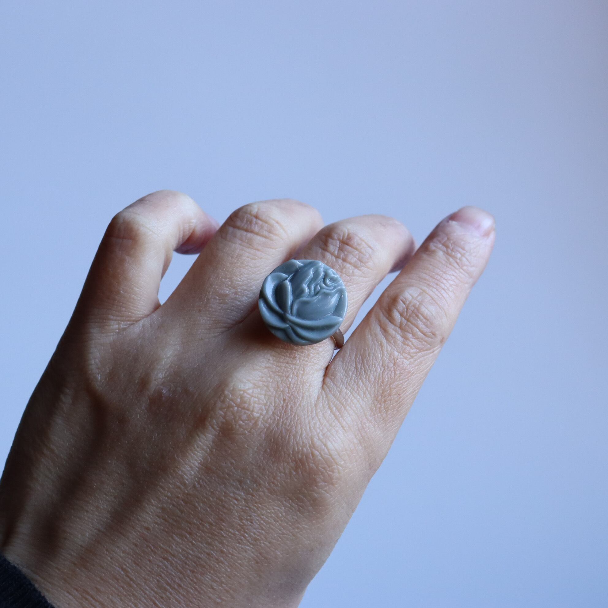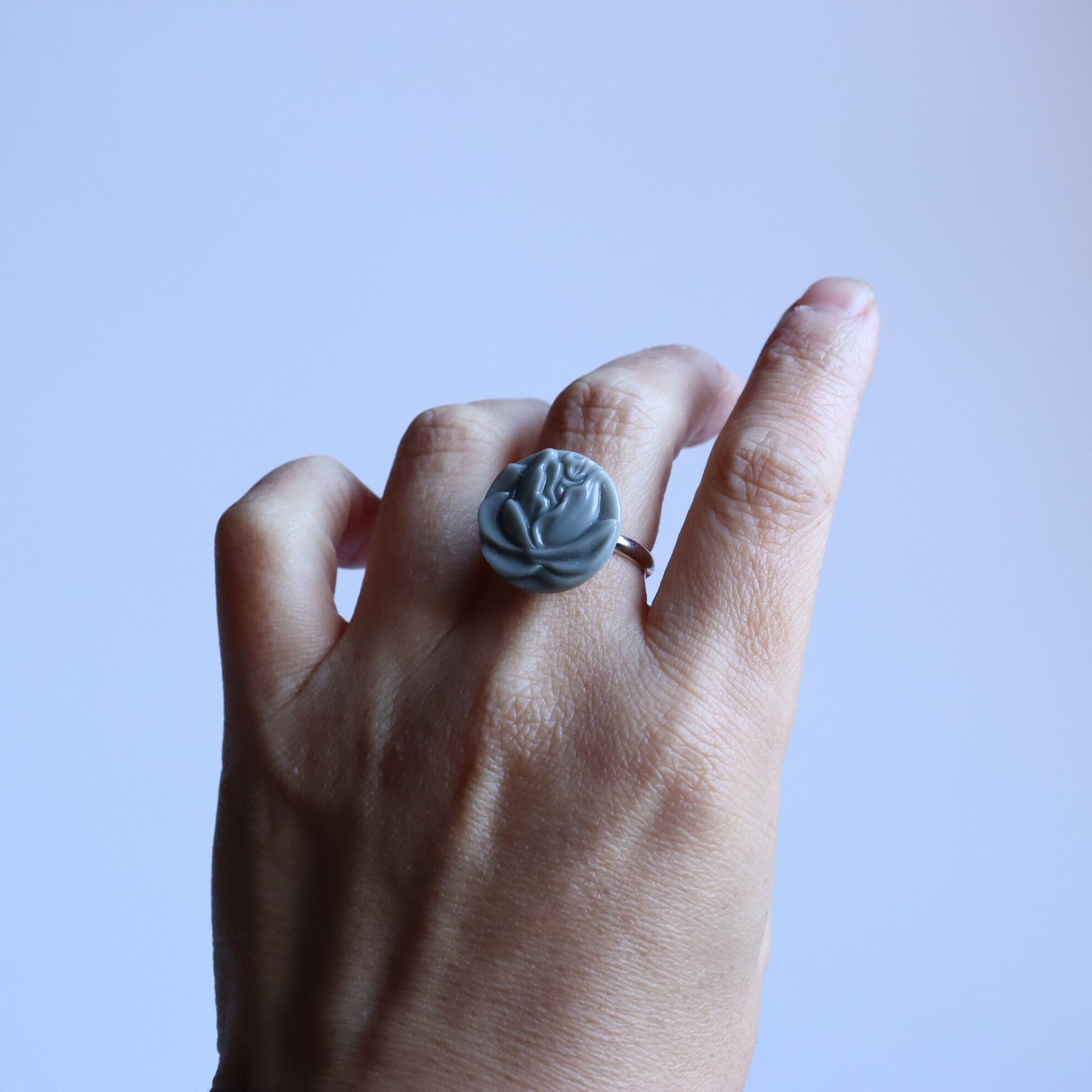 大きな一輪の薔薇が印象的なボタンリングのご紹介です。