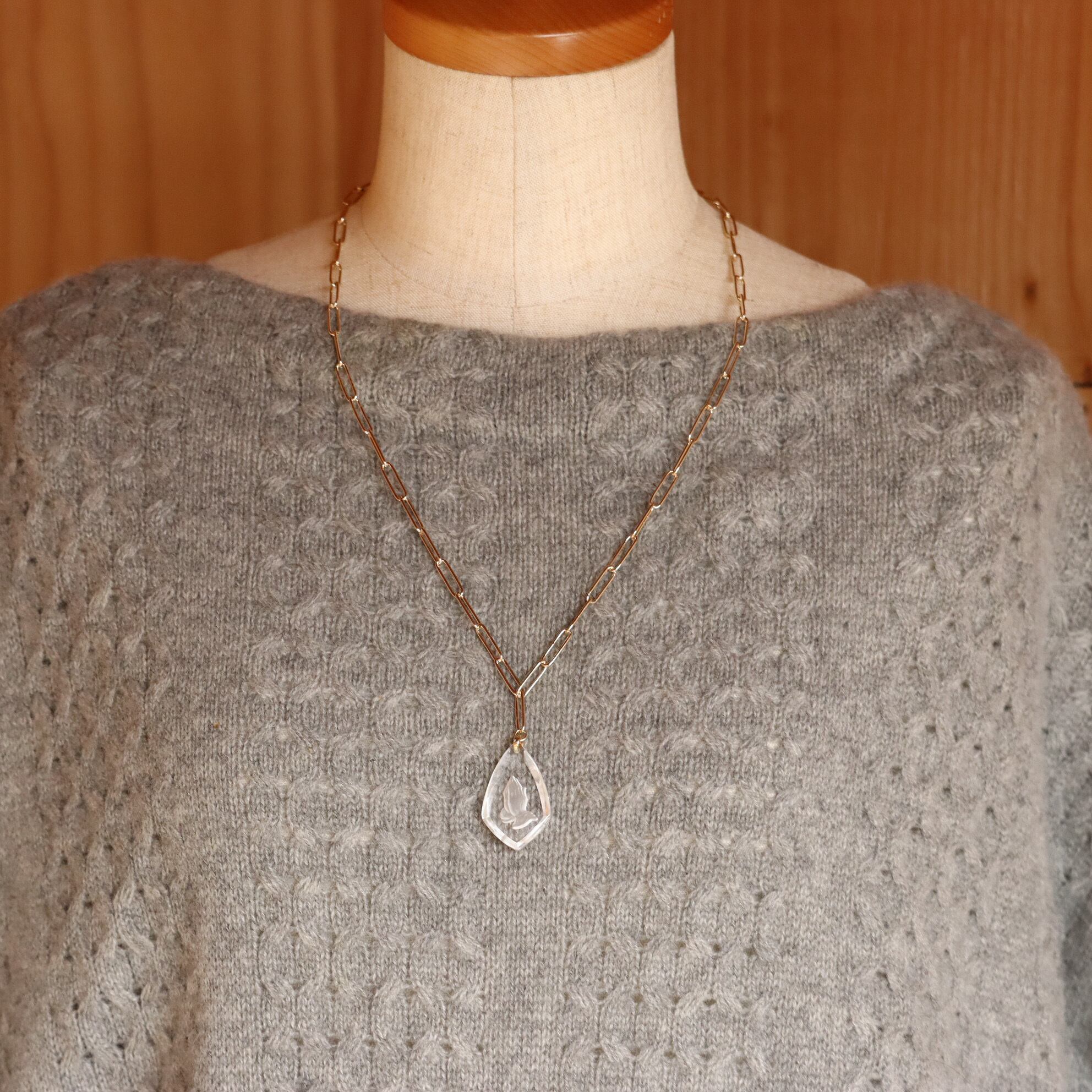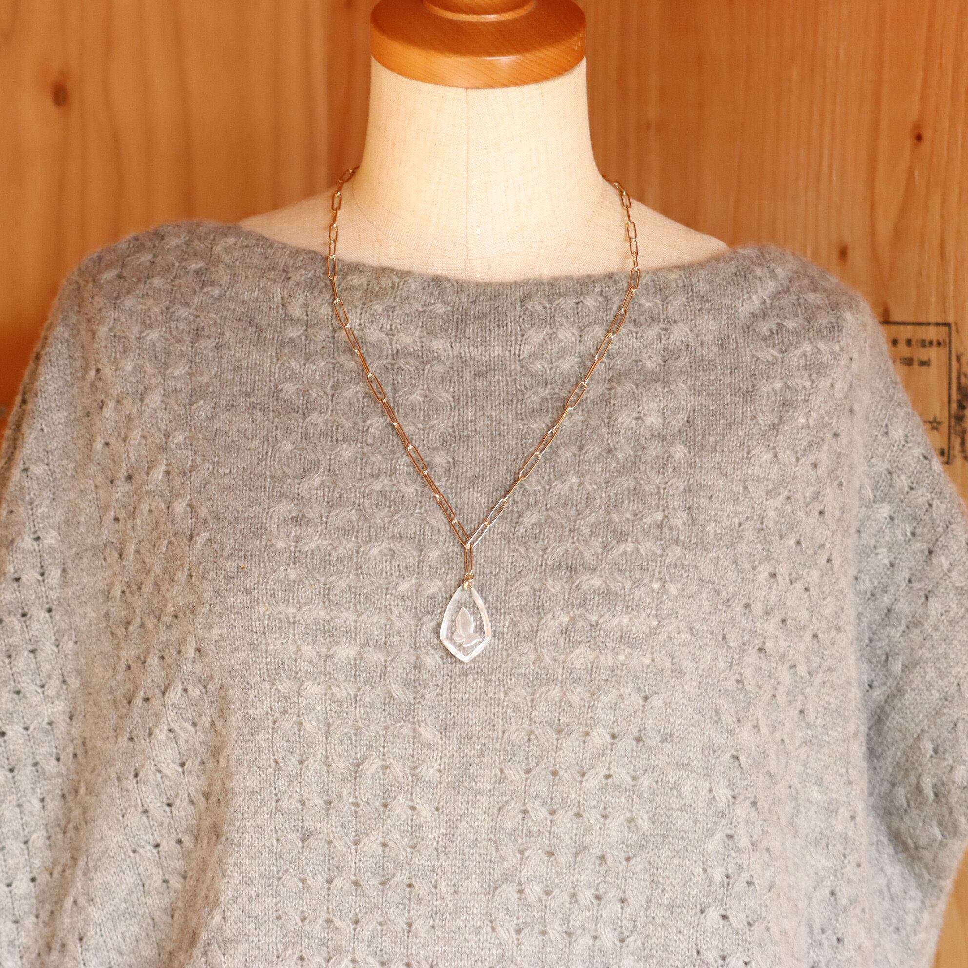 ・黒ニットやハイネックに合わせると、モチーフの透明感と彫刻がより際立ちます。