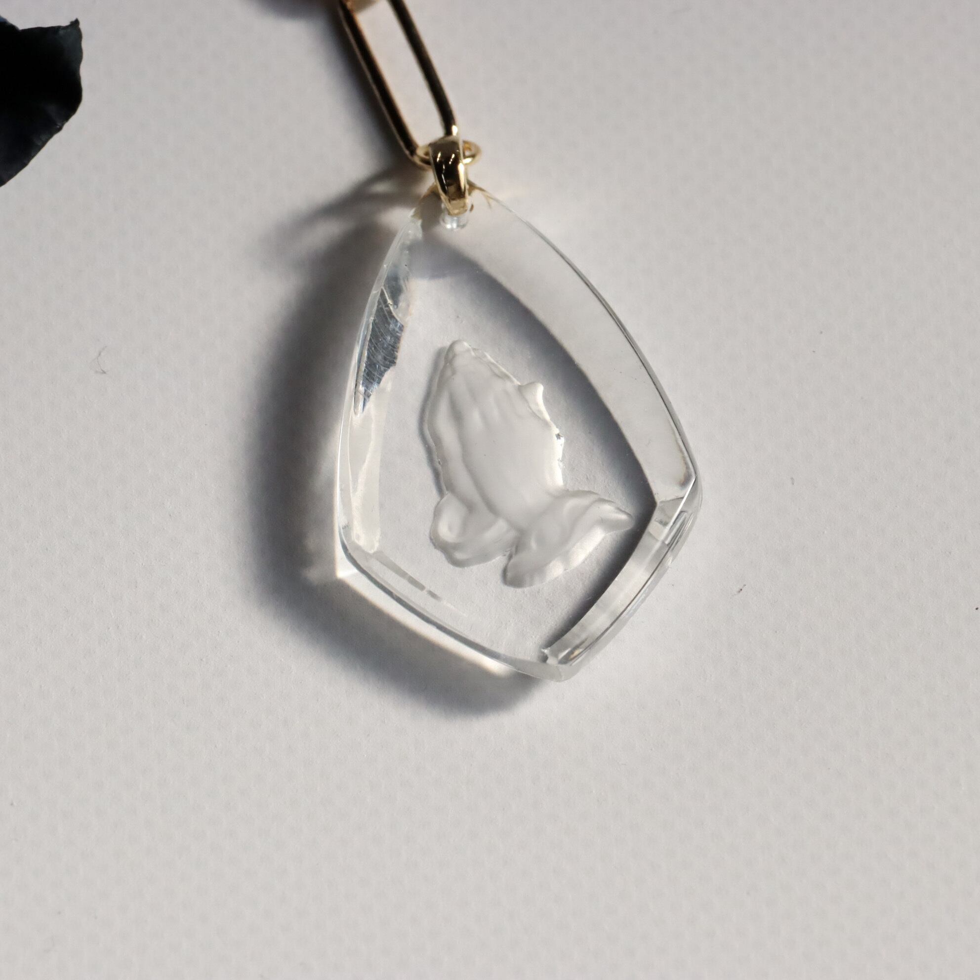 裏面から丁寧に彫り込まれた「両手を合わせる姿」は、どこか心をそっと落ち着かせてくれるような、凛とした気配をまとっています。
