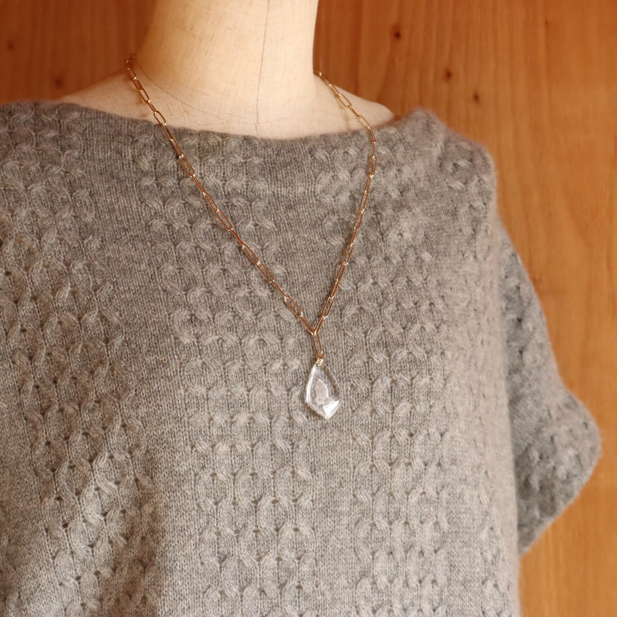 長さは60cmと少し長め。胸元で静かに揺れ、シンプルな装いに奥行きを添えてくれます。