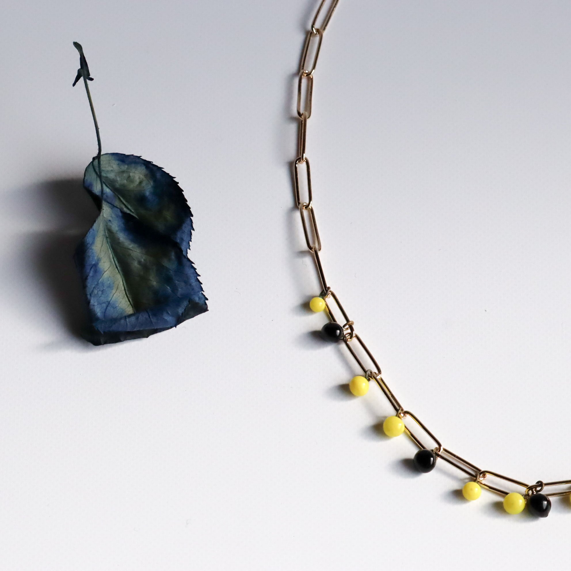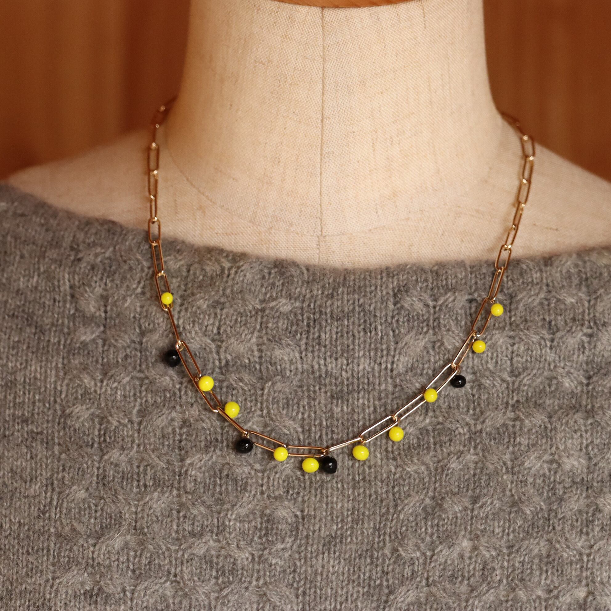 日本製のヴィンテージビーズを、大ぶりのチェーンにひとつずつ組み合わせたネックレスです。