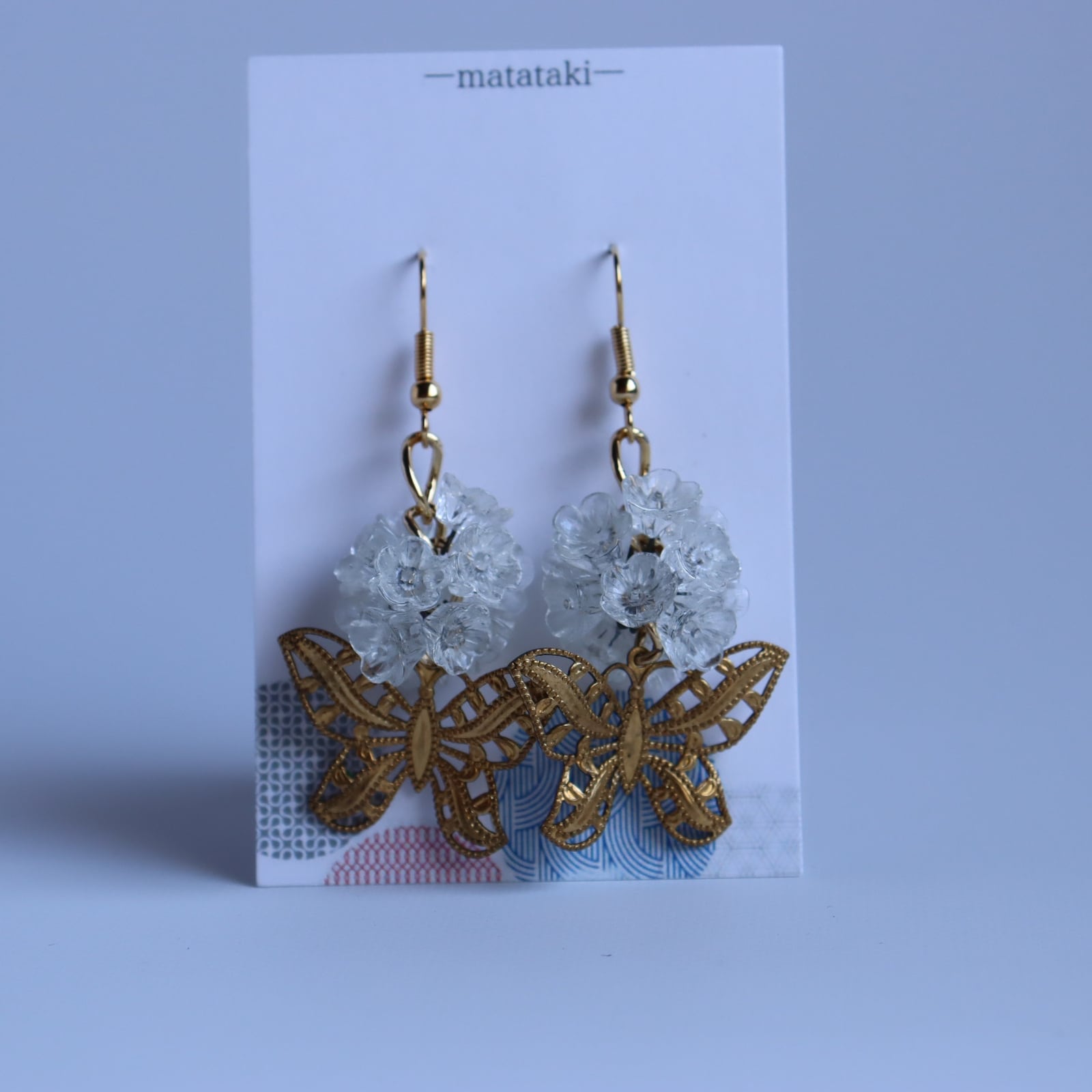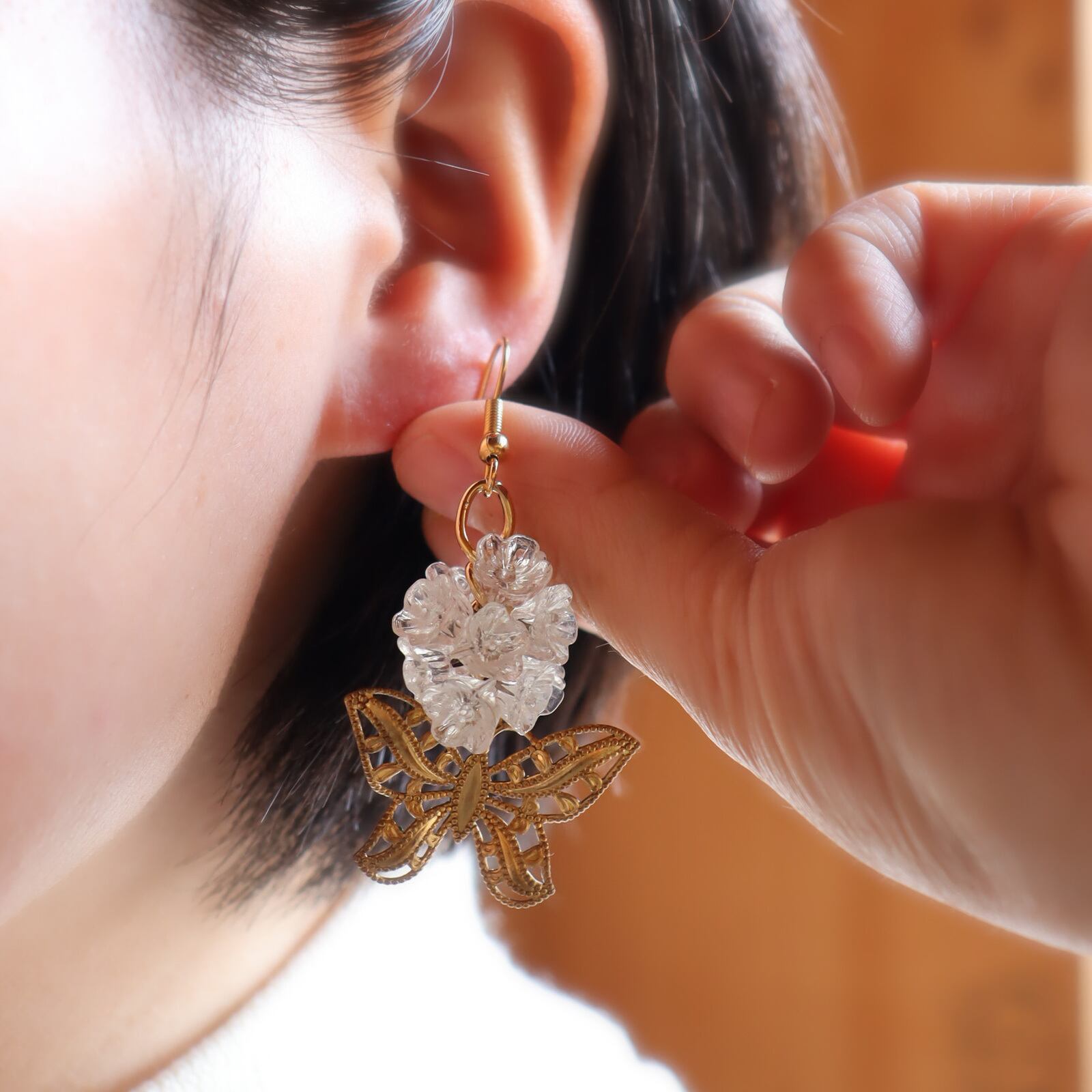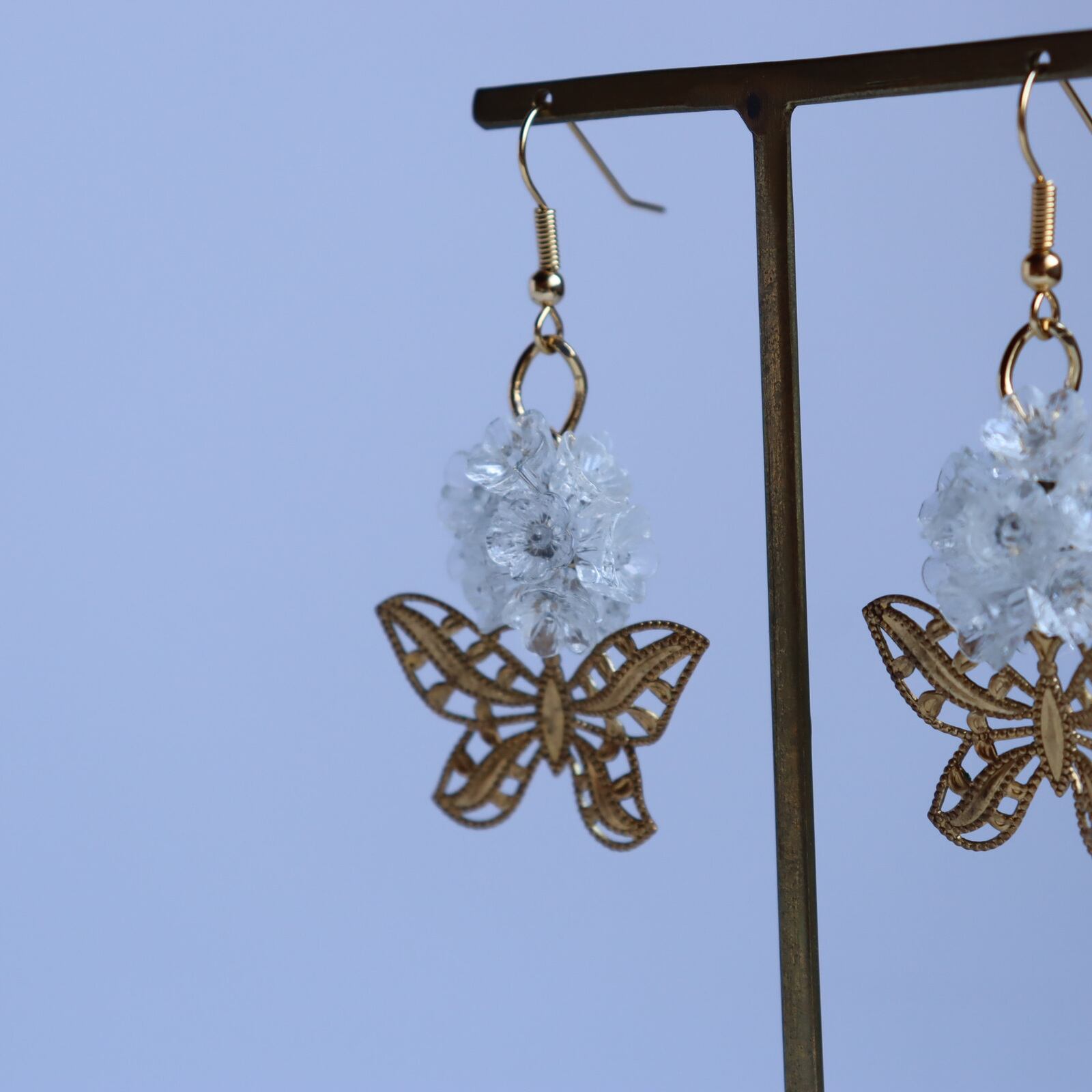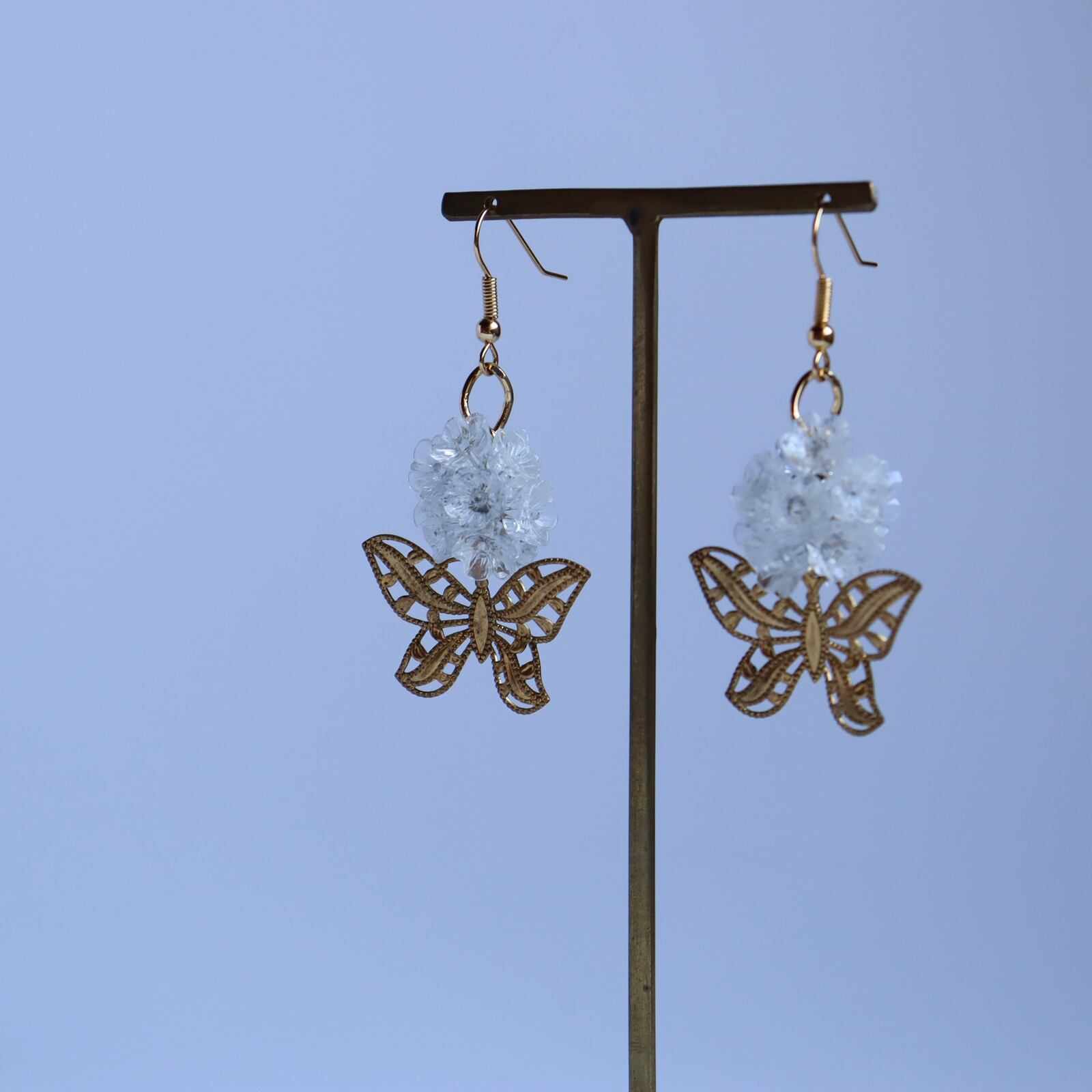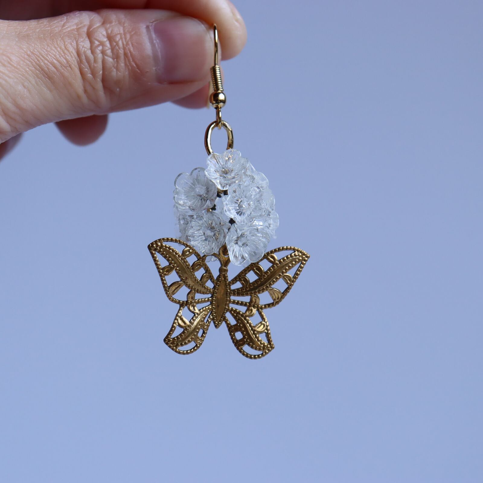 透明感のあるガラスビーズと、蝶の形をしたメタルパーツが絶妙に組み合わさり、上品で華やかな雰囲気を演出。