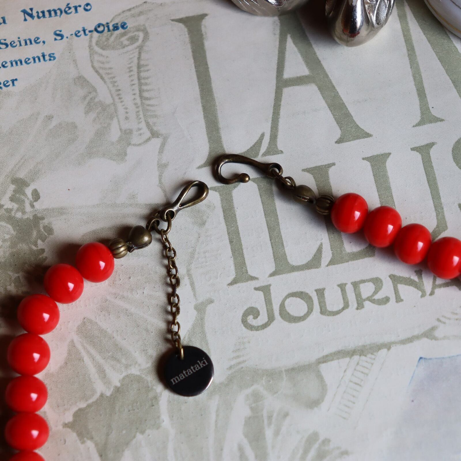 ネックレスには、ボタンのような丸型プレートに「matataki」のロゴが刻まれたオリジナルチャームを添えました。