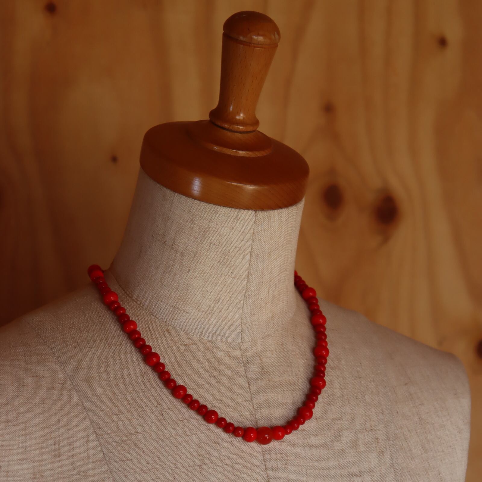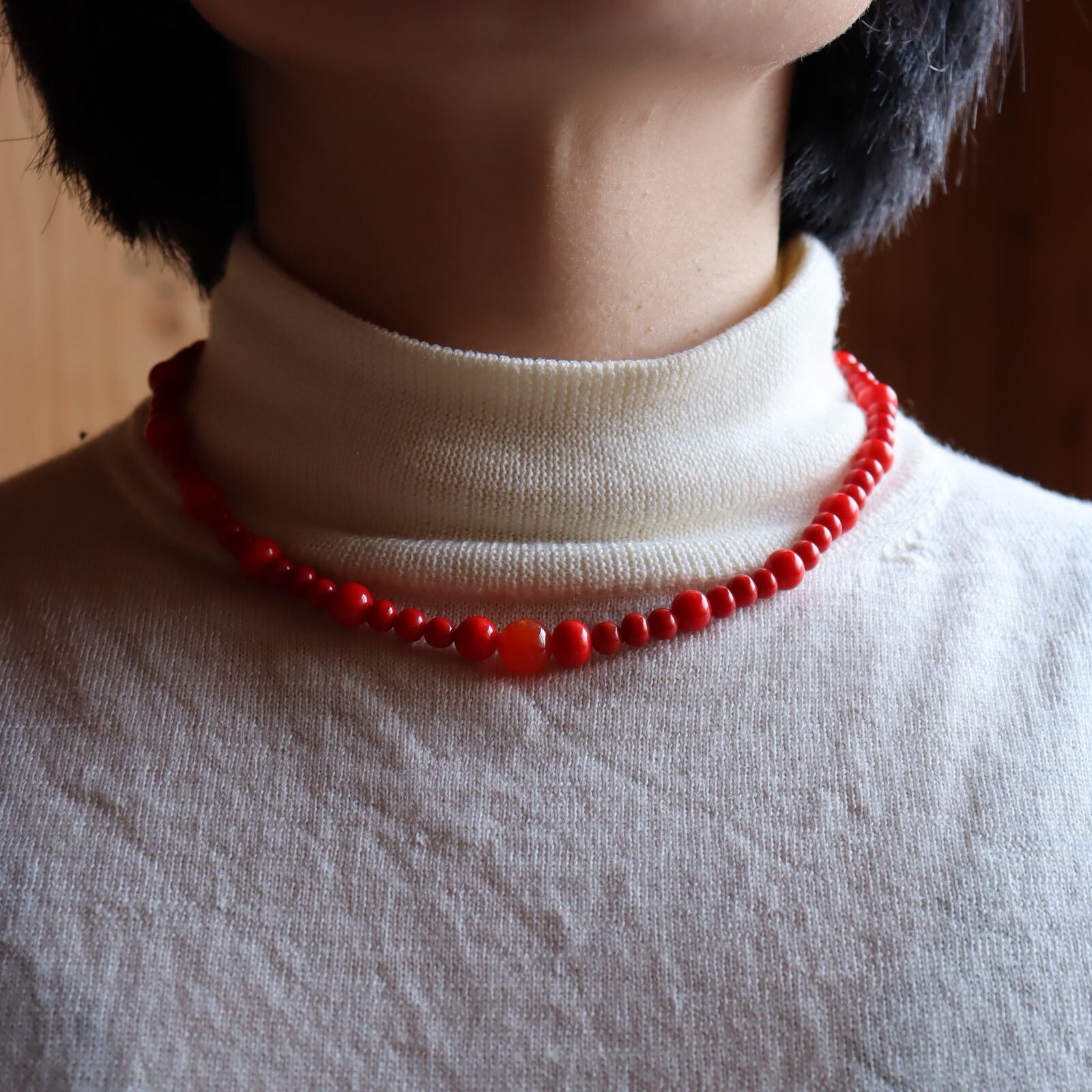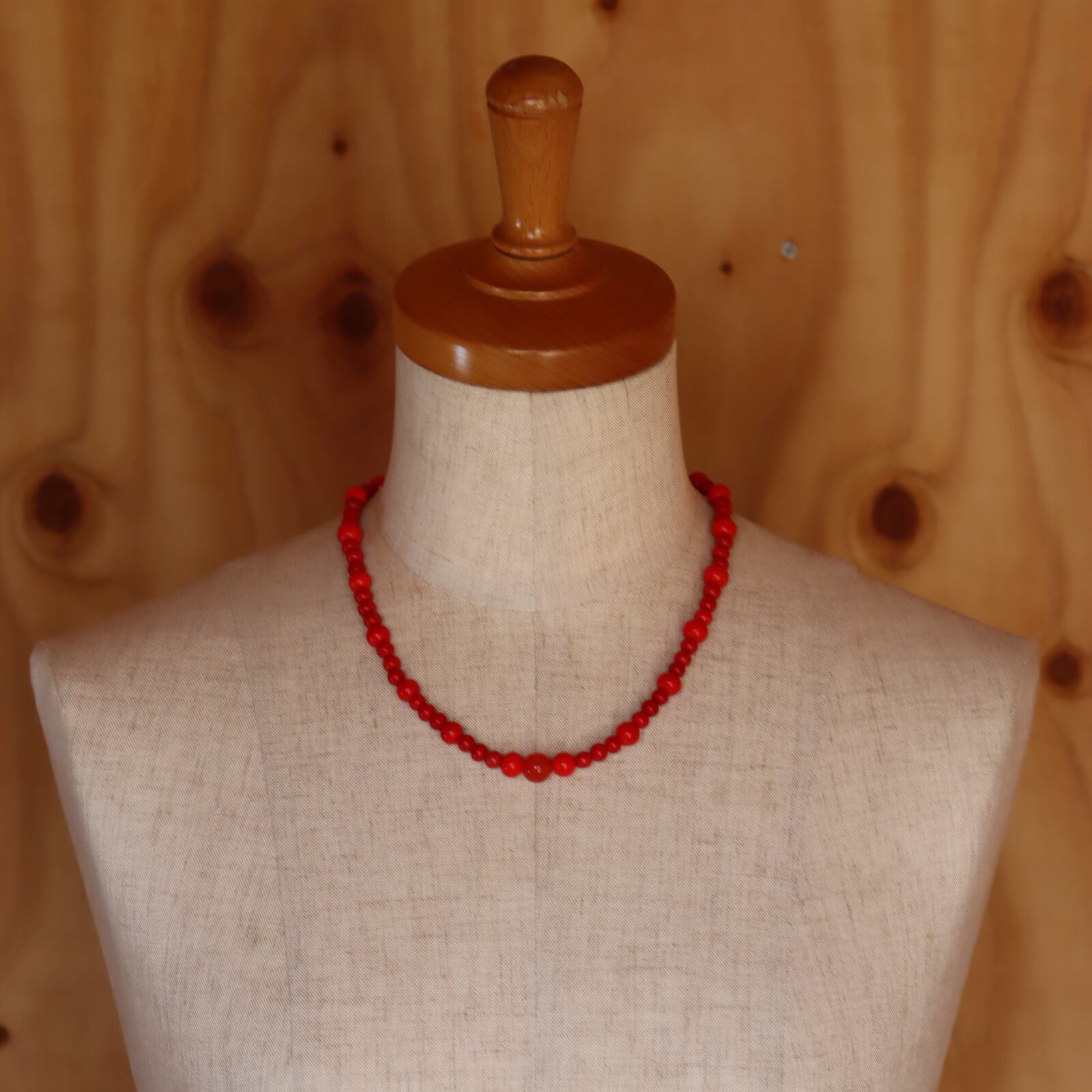 ミドルサイズのビーズ1粒に対し、ミニサイズのビーズを3粒ずつ繋いで連ねた、流れるようなリズム感のある短めのネックレスです。