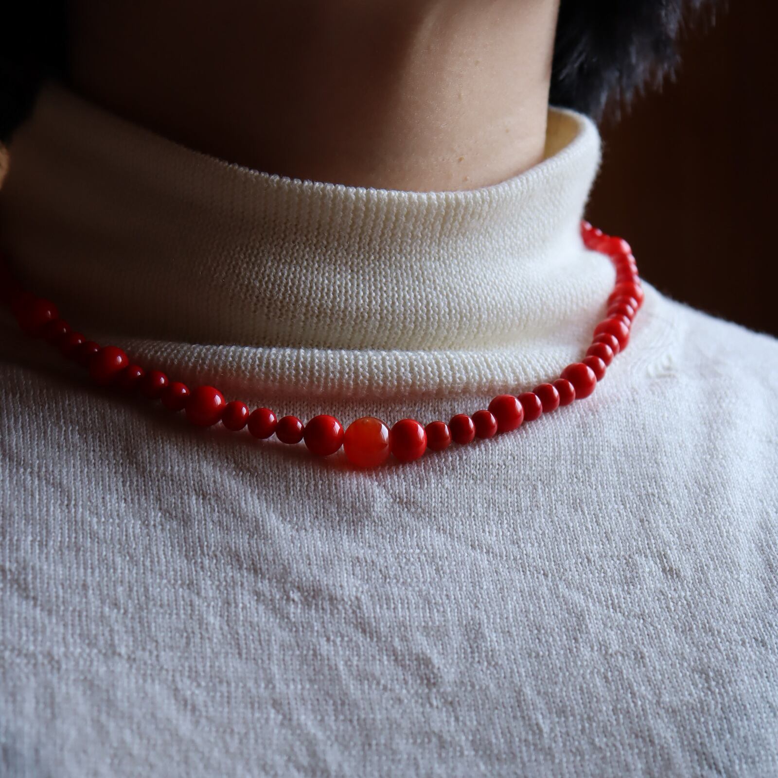 淡い白のタートルネックやハイネックのニットに合わせると、ネックレスの色彩が引き立ち、美しく映えます。