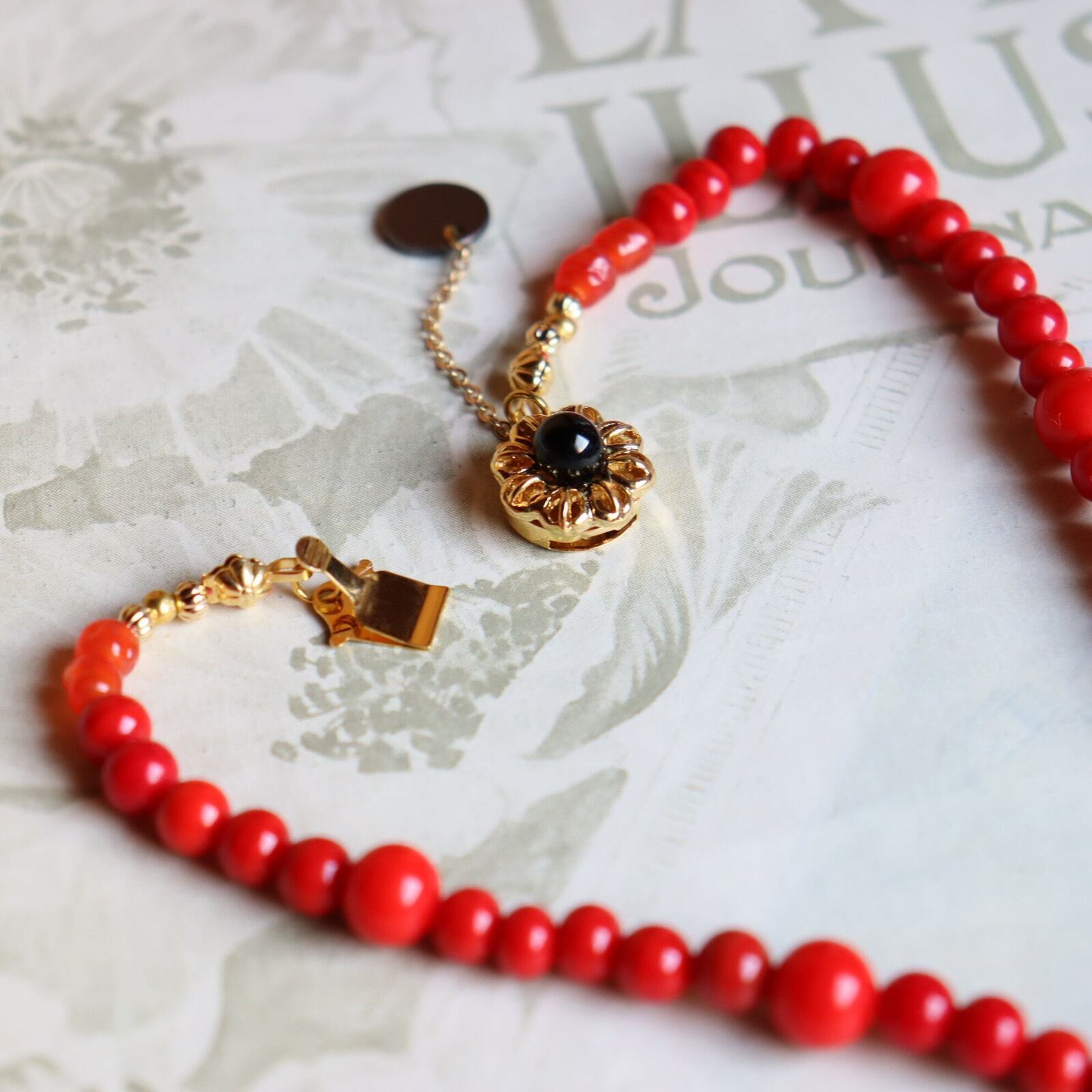 留め具には、金色のお花型クラスプ金具を採用。