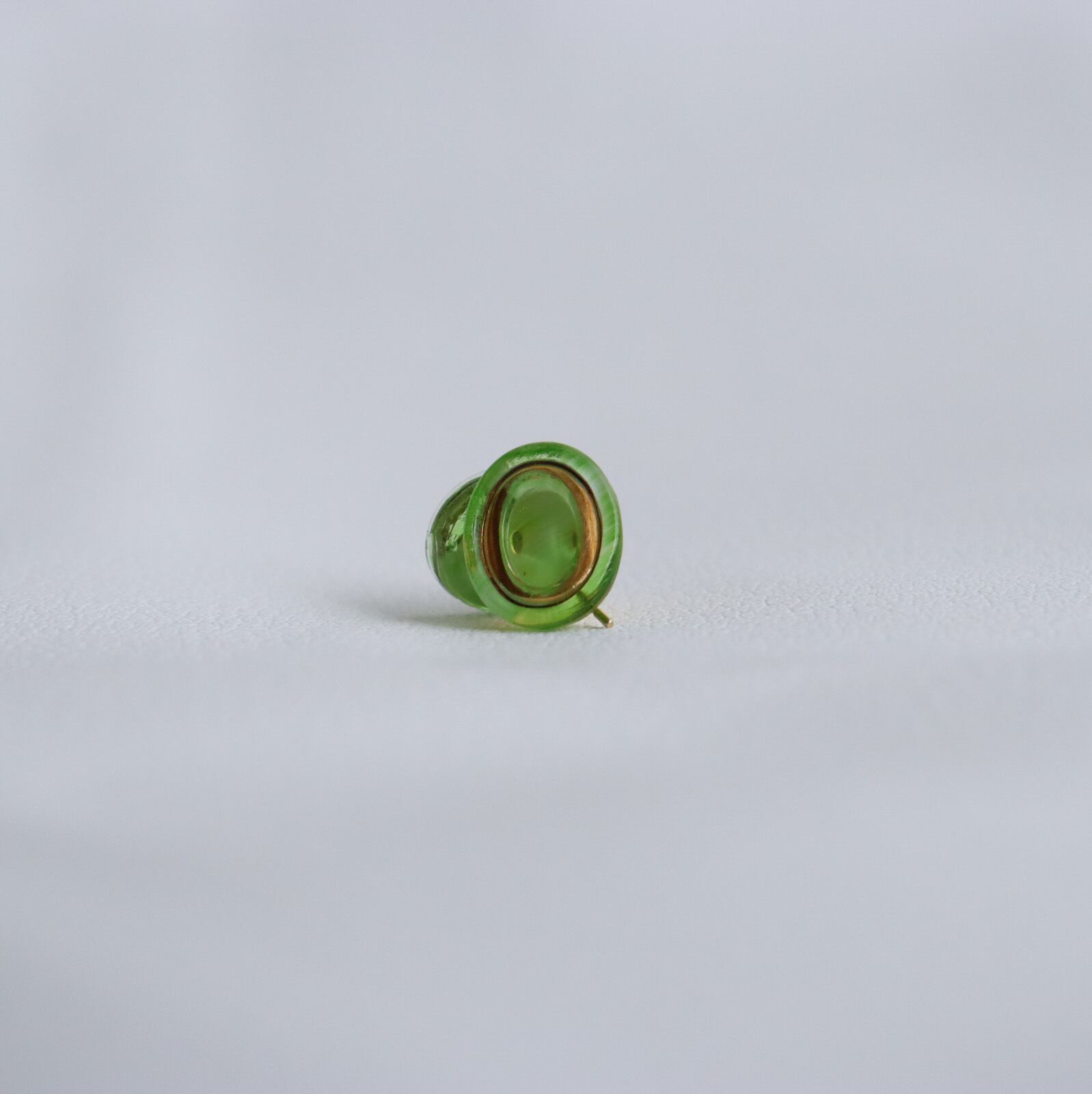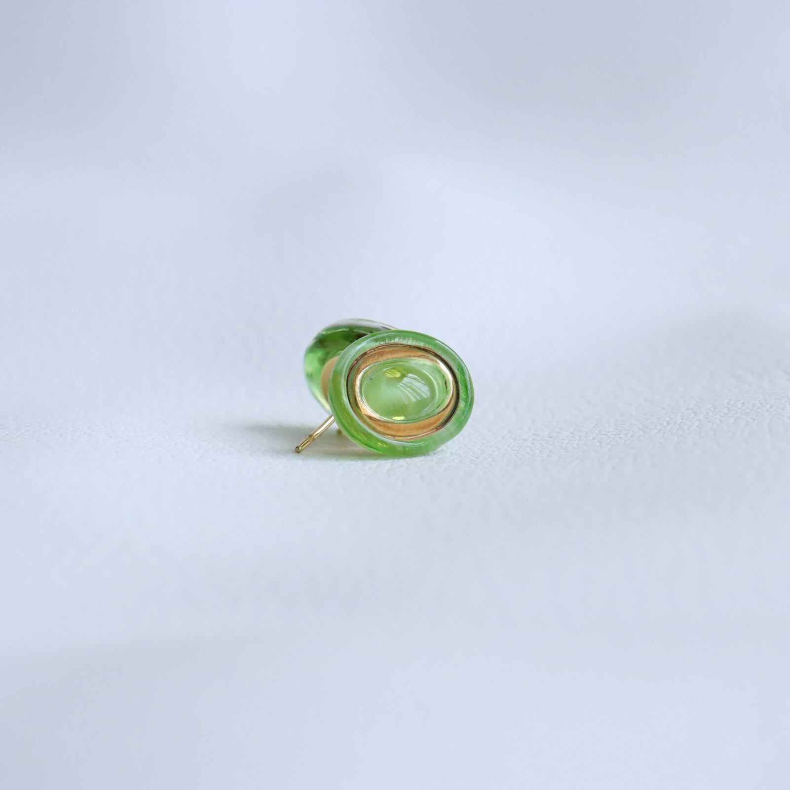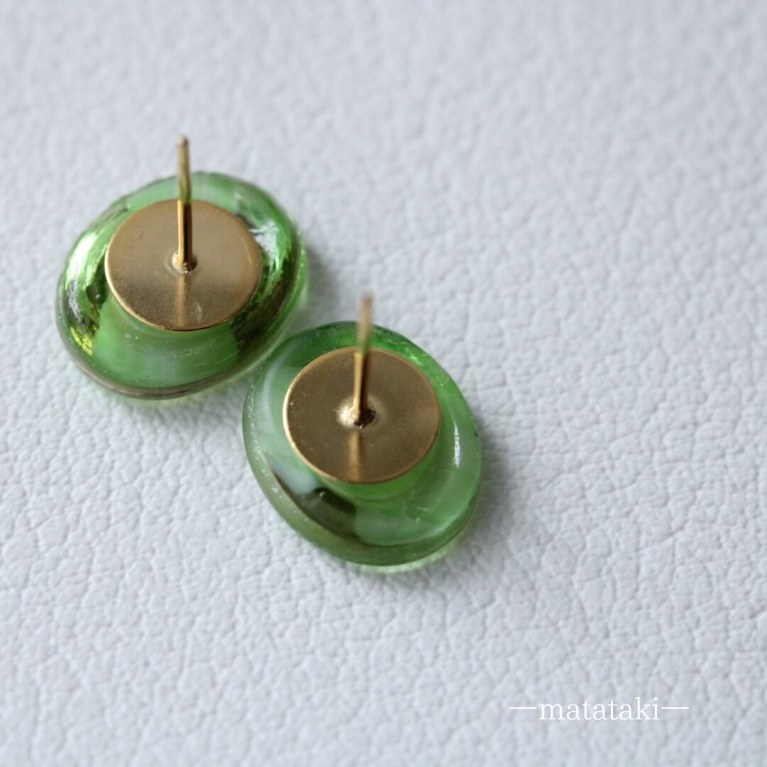 チェコに広がるモラヴィア大草原を連想させる爽やかな黄緑が美しいガラスボタンを耳飾りに仕上げました。裏面は着けていて違和感がないよう、ぎりぎりまで削り、コーティングをしています。