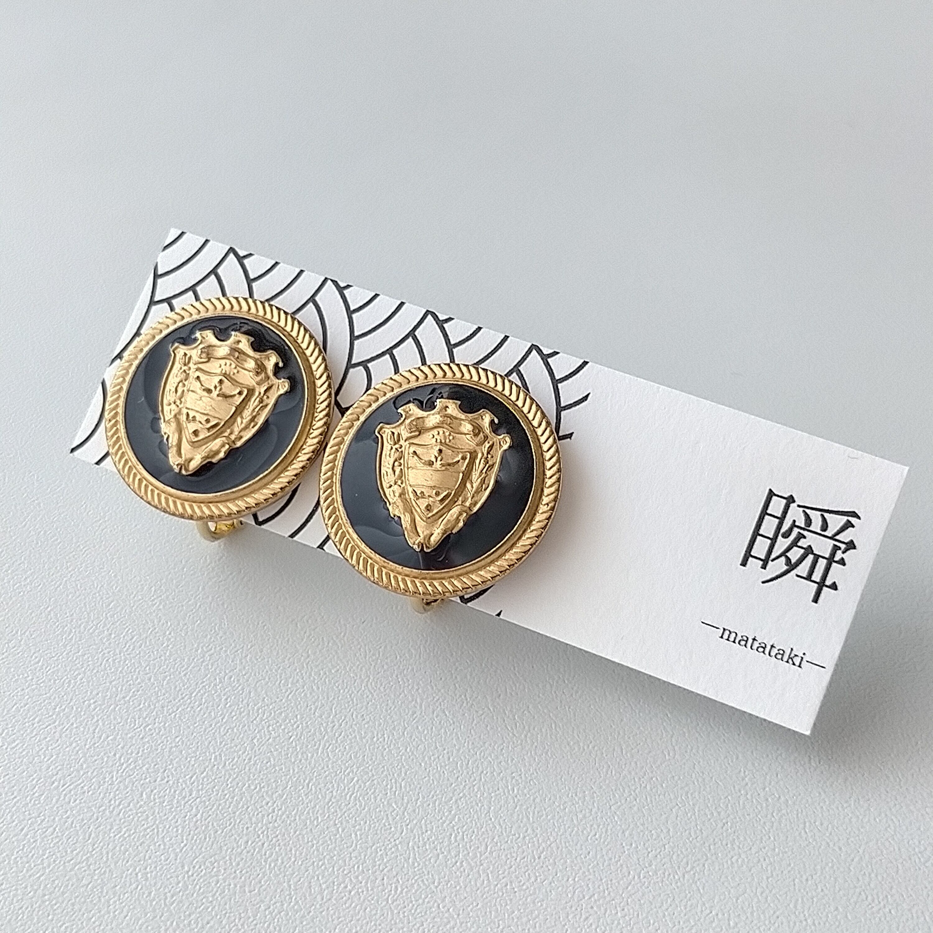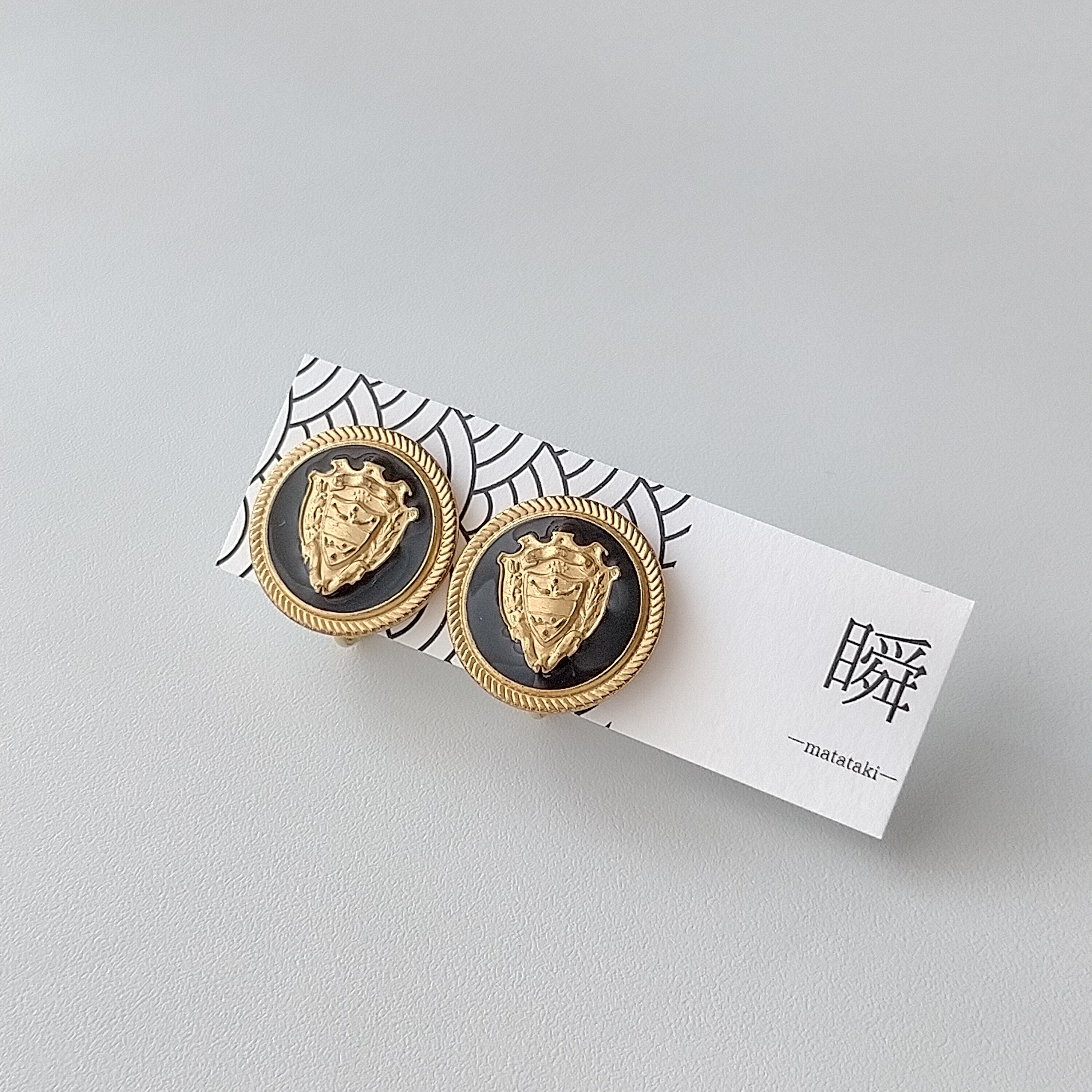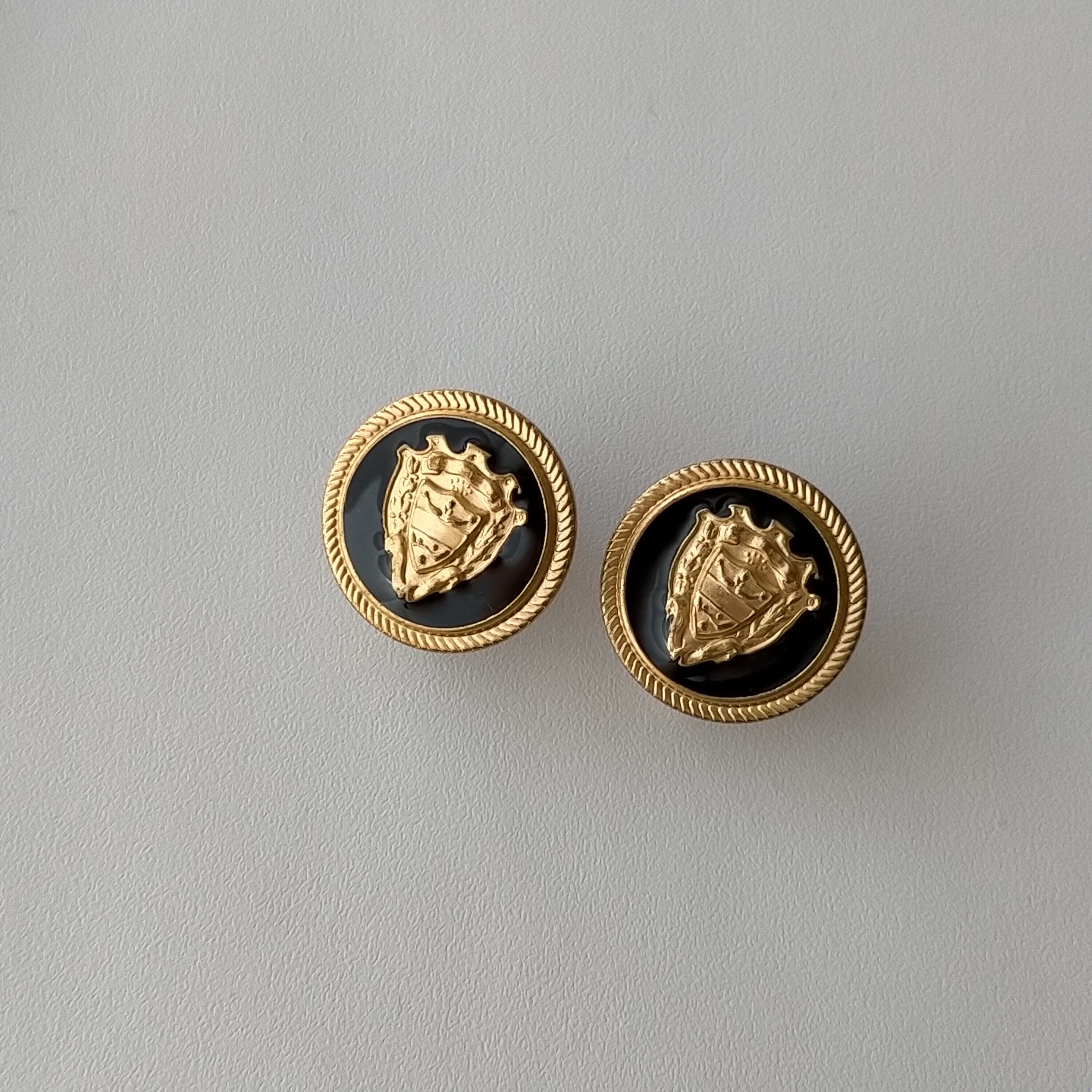 高貴な紋章が目を惹くアルミボタンをイヤリングに仕上げました。