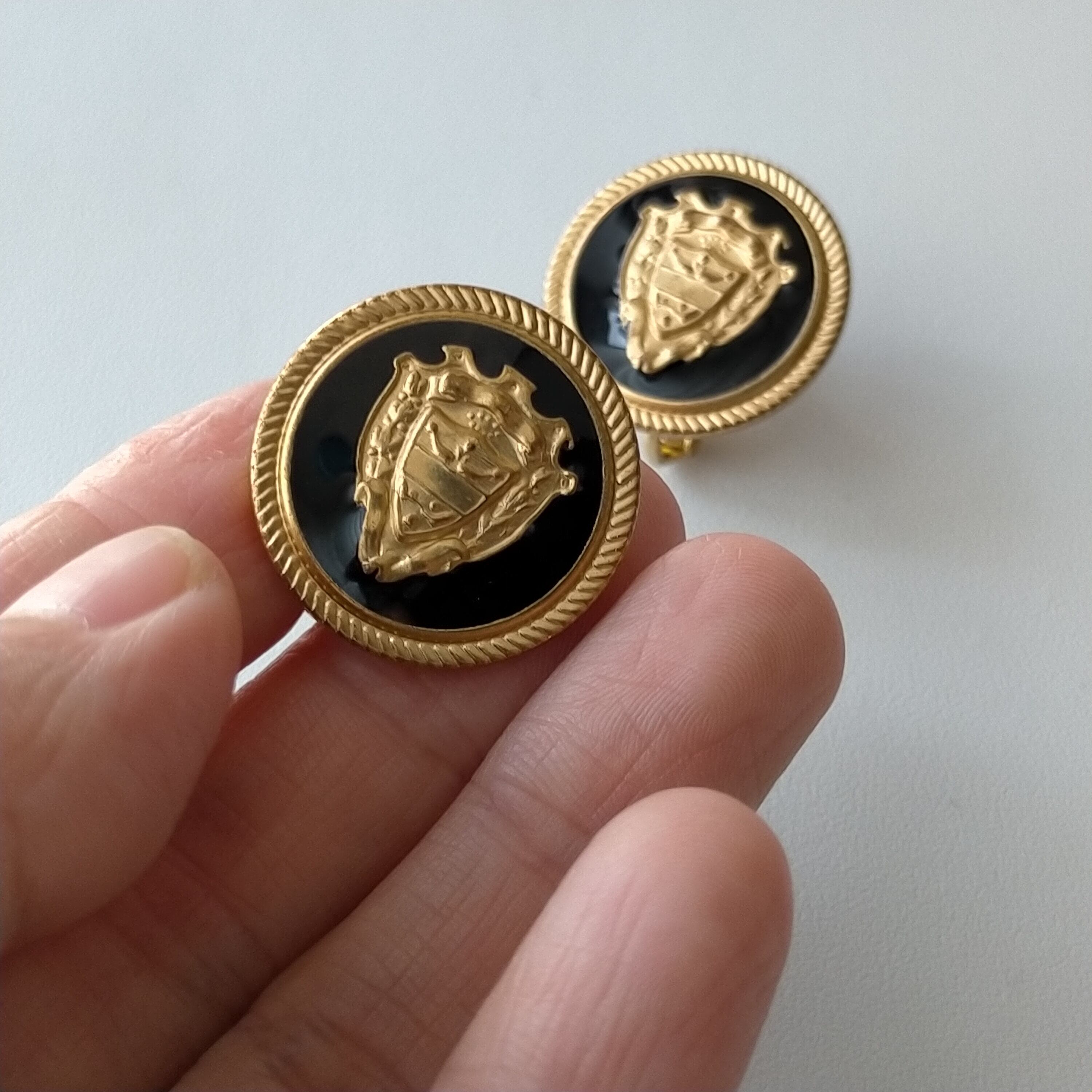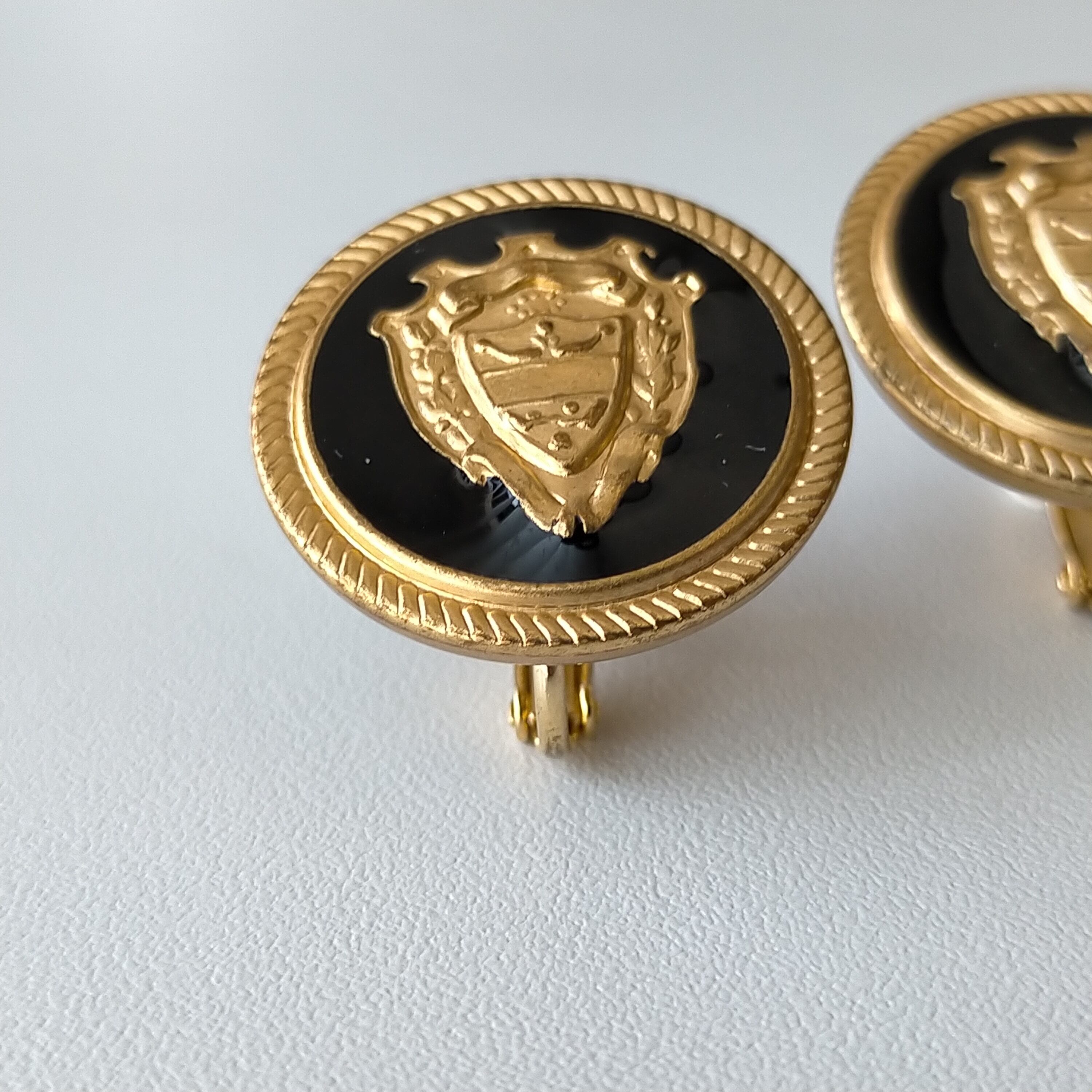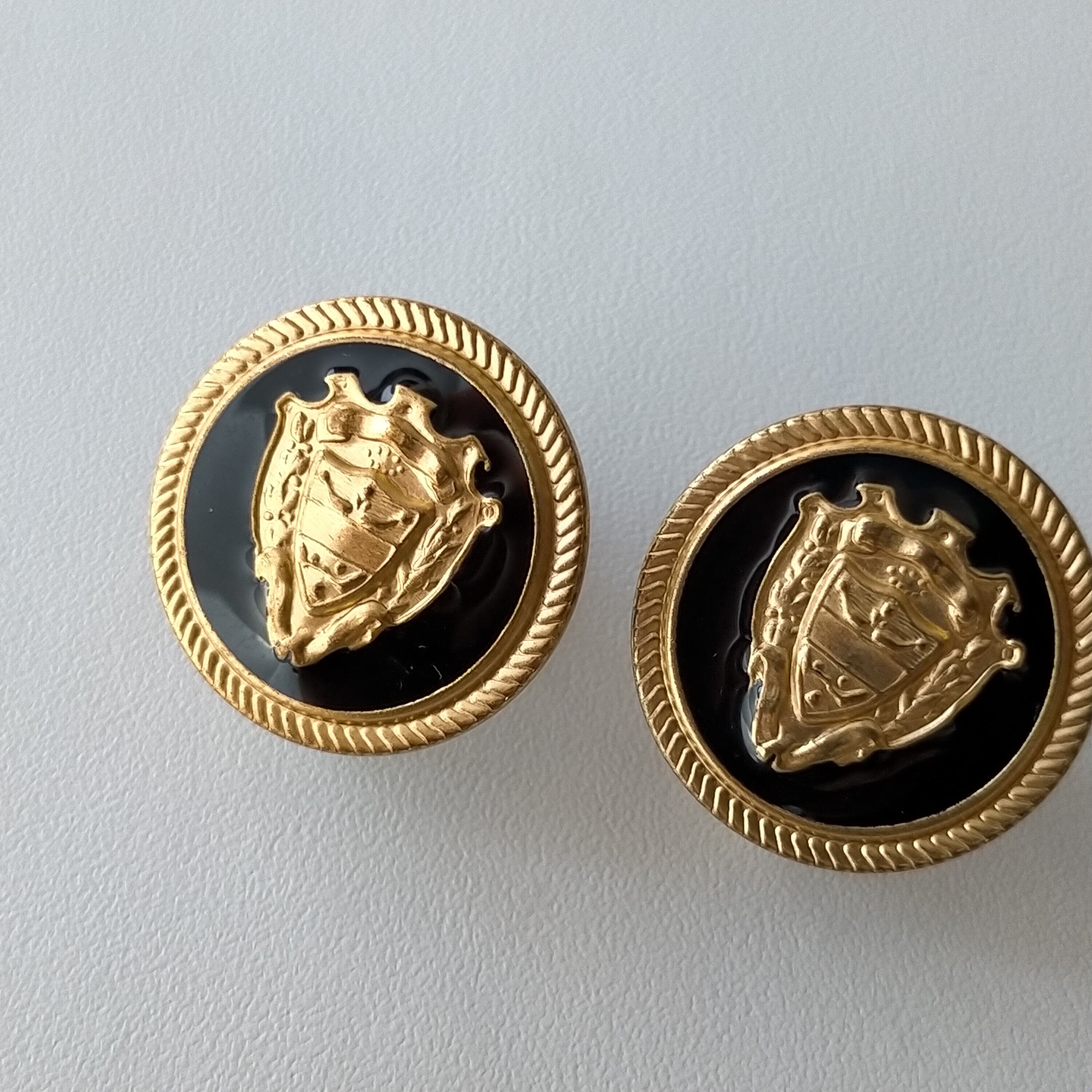 高貴な紋章が目を惹くアルミボタンをイヤリングに仕上げました。