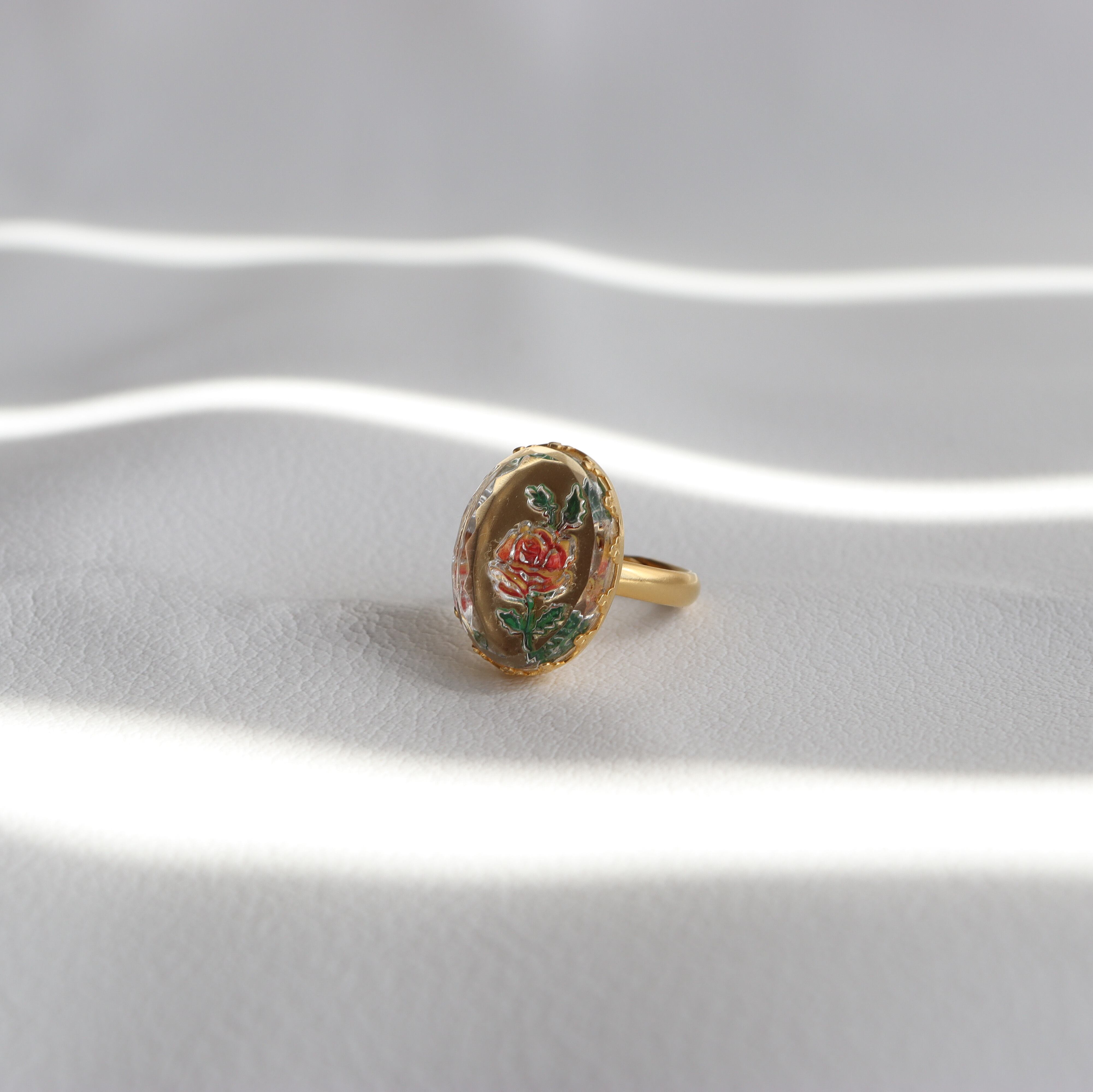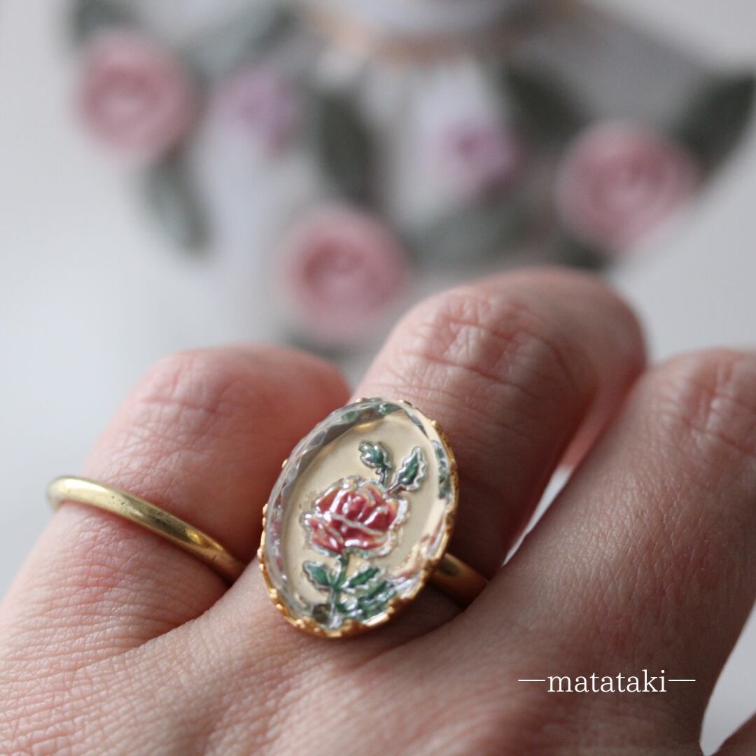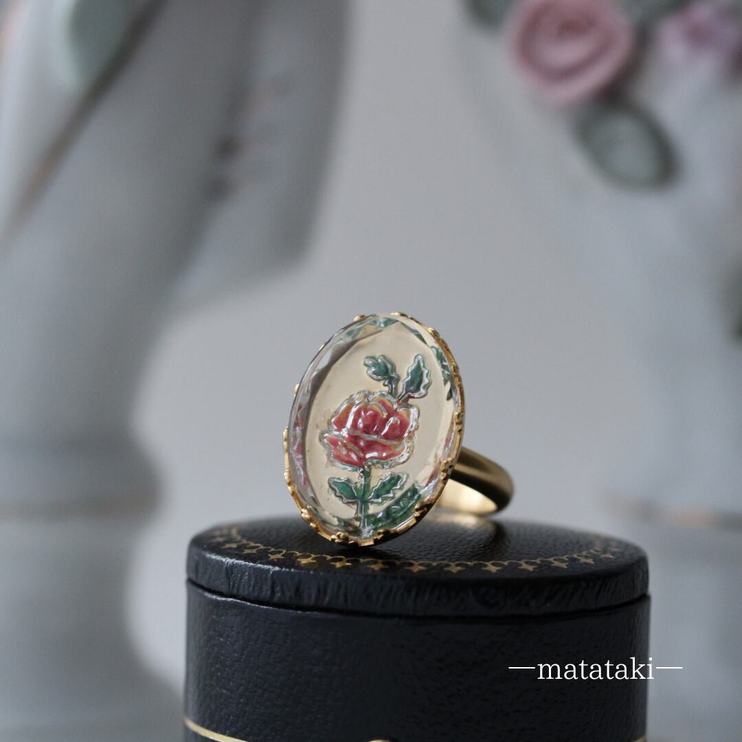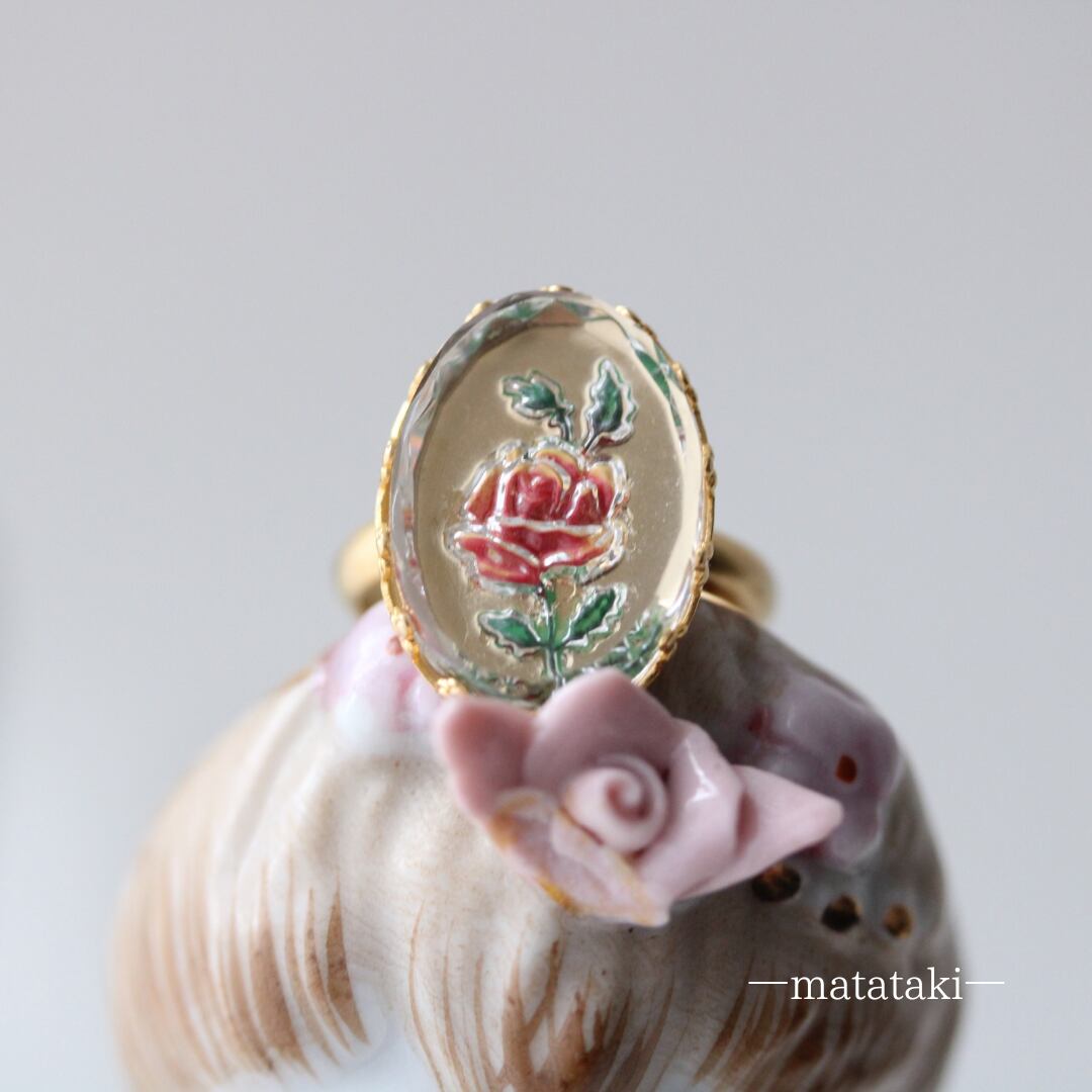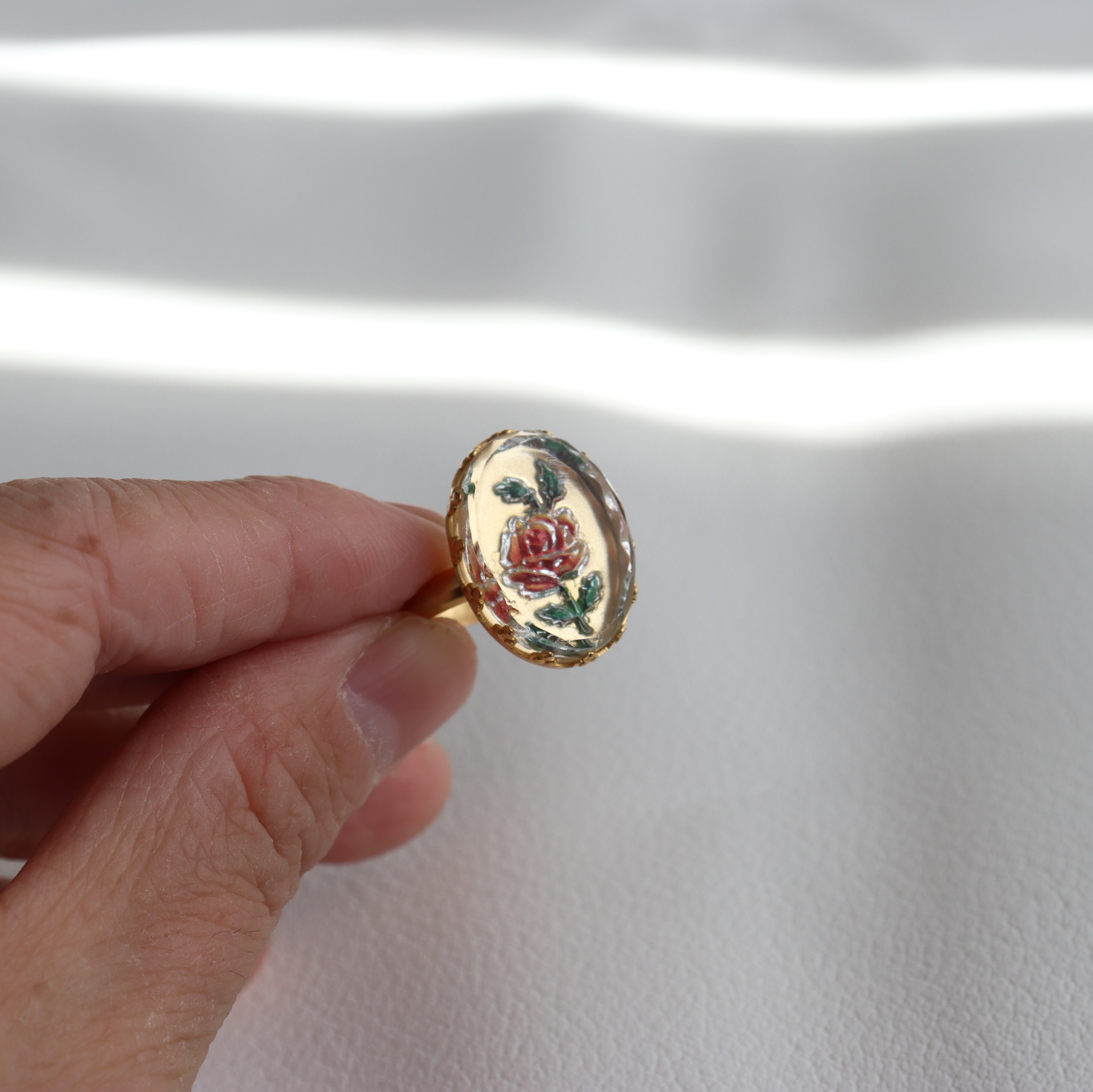 楕円形のクリアガラスの裏面から1輪のバラの彫刻が施されたらインタリオ