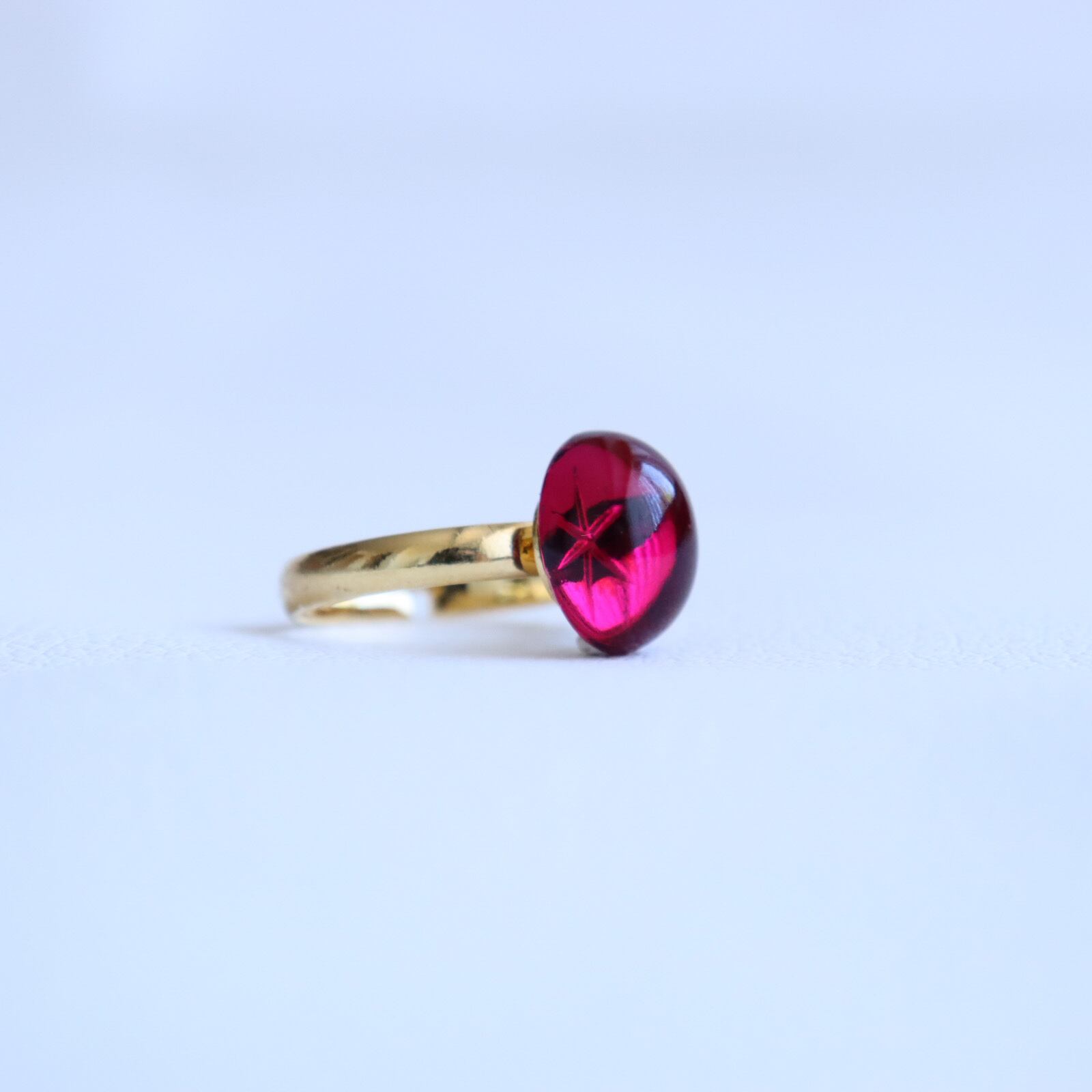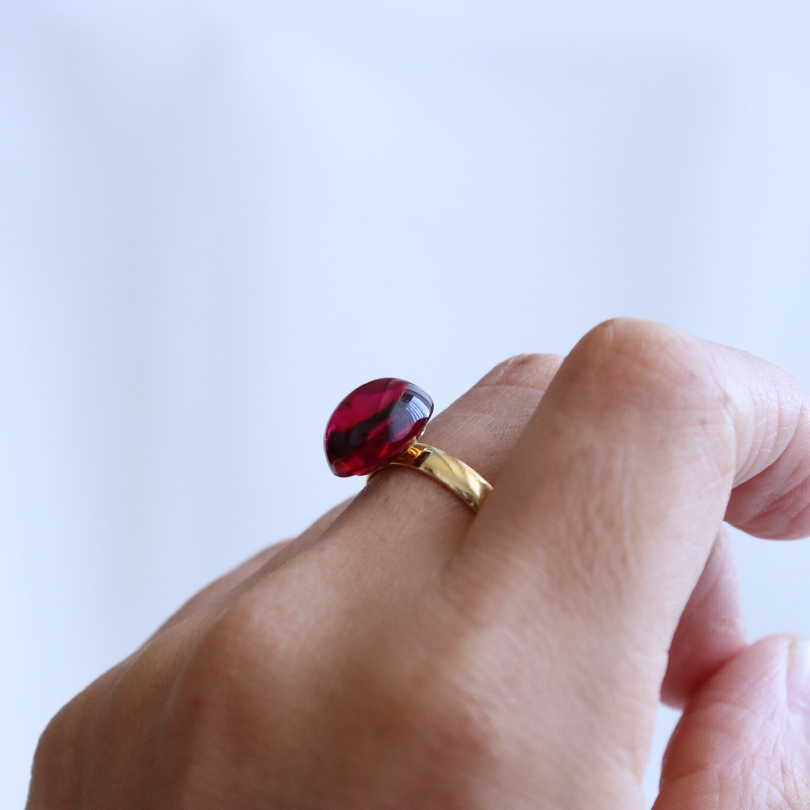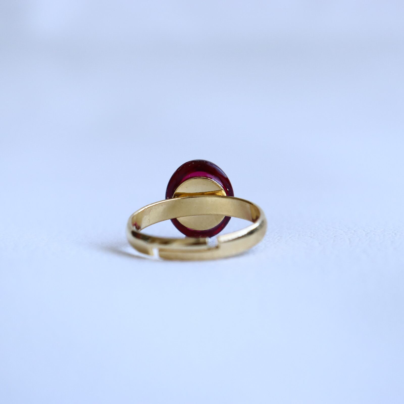 上質な赤のガラスカボションを使用した指輪です