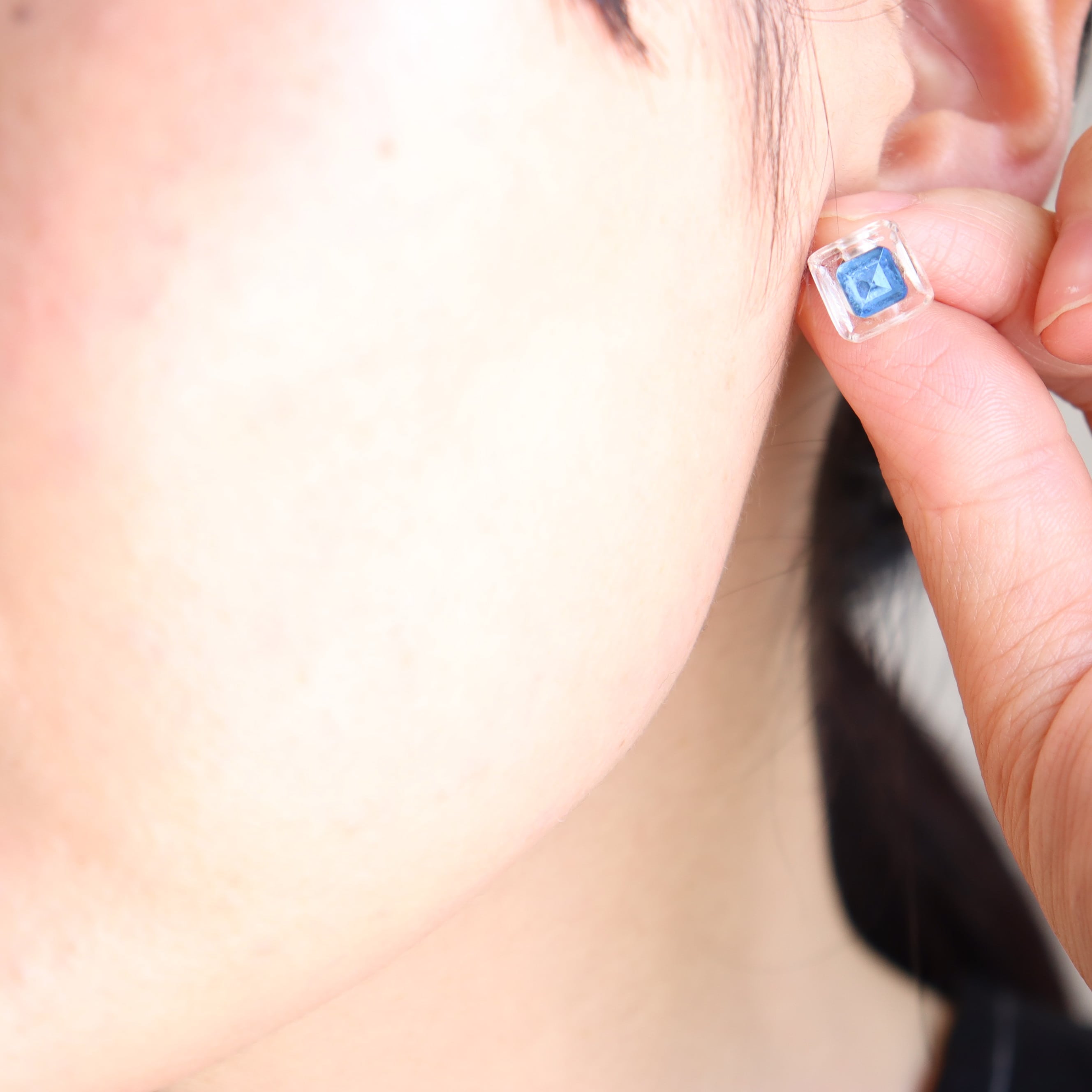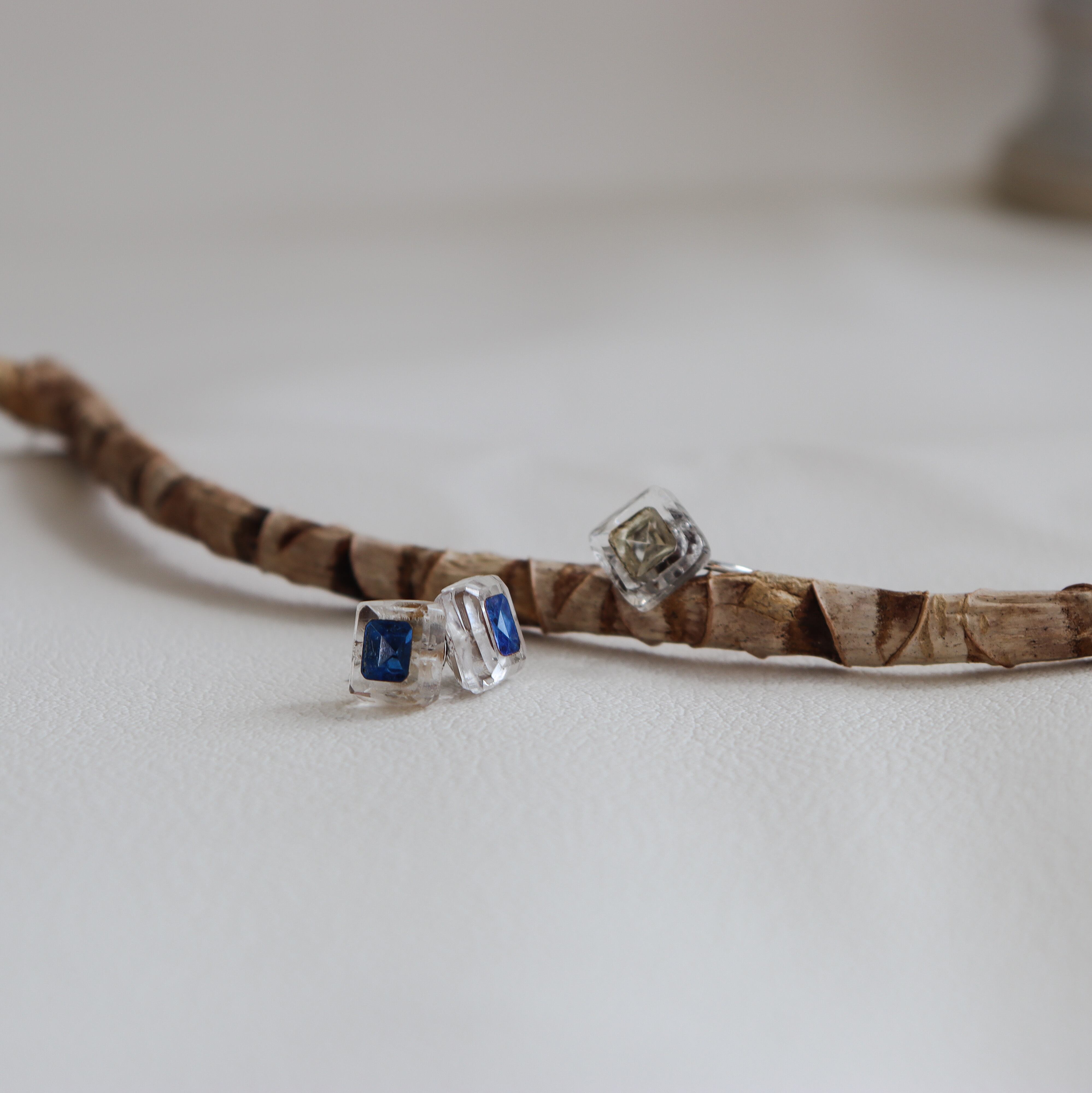 8mmの透明なボタンの中に透明の四角いラインストーンの入った珍しいガラスボタンを使用した耳飾りです。