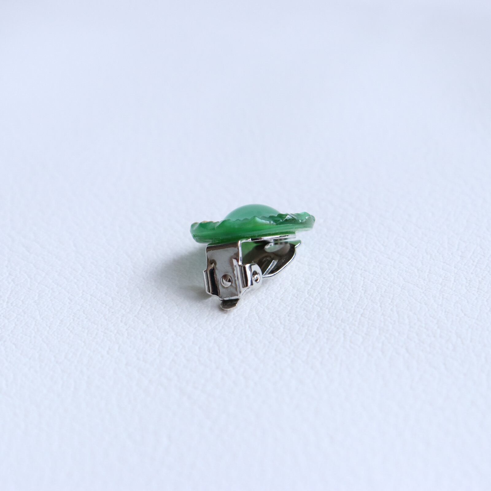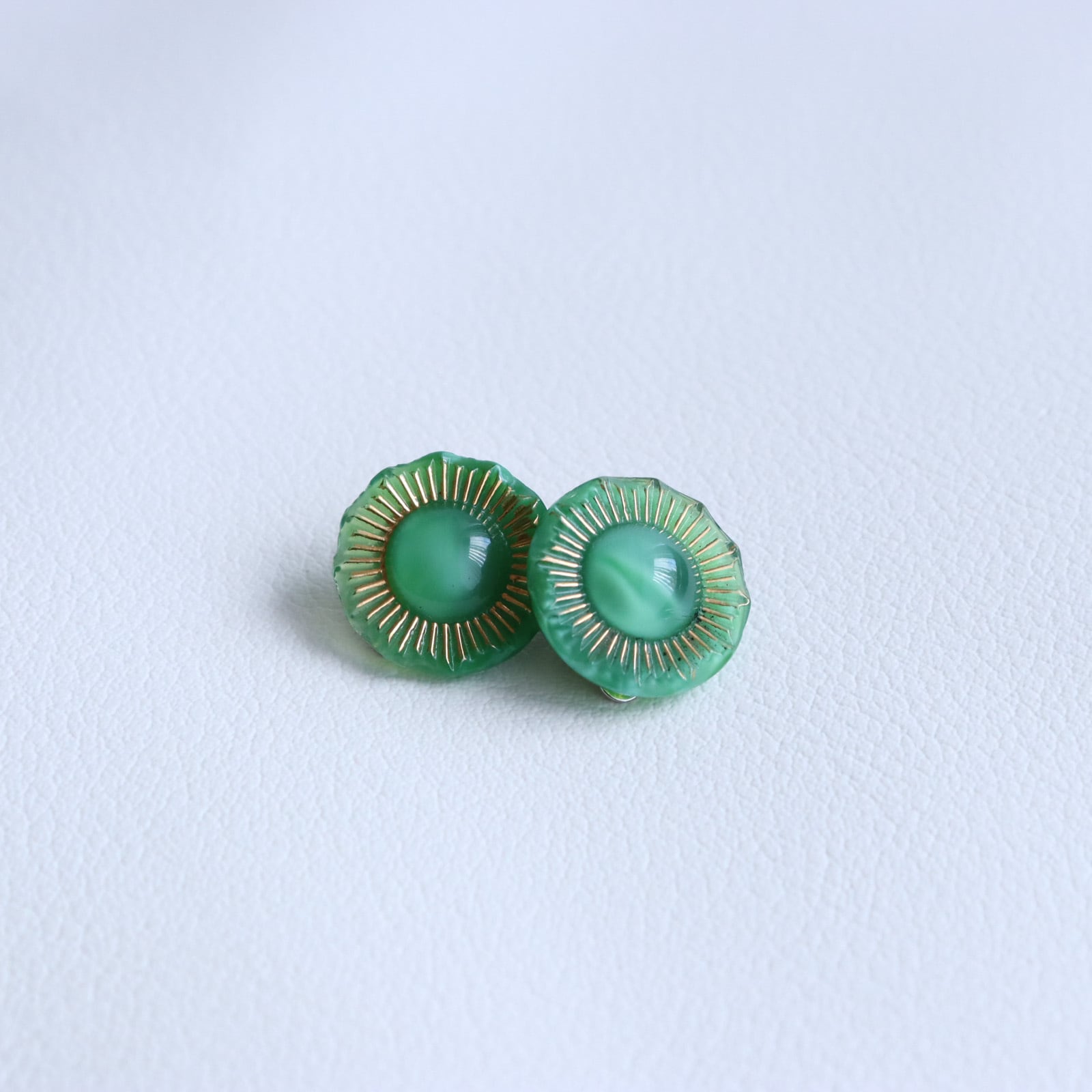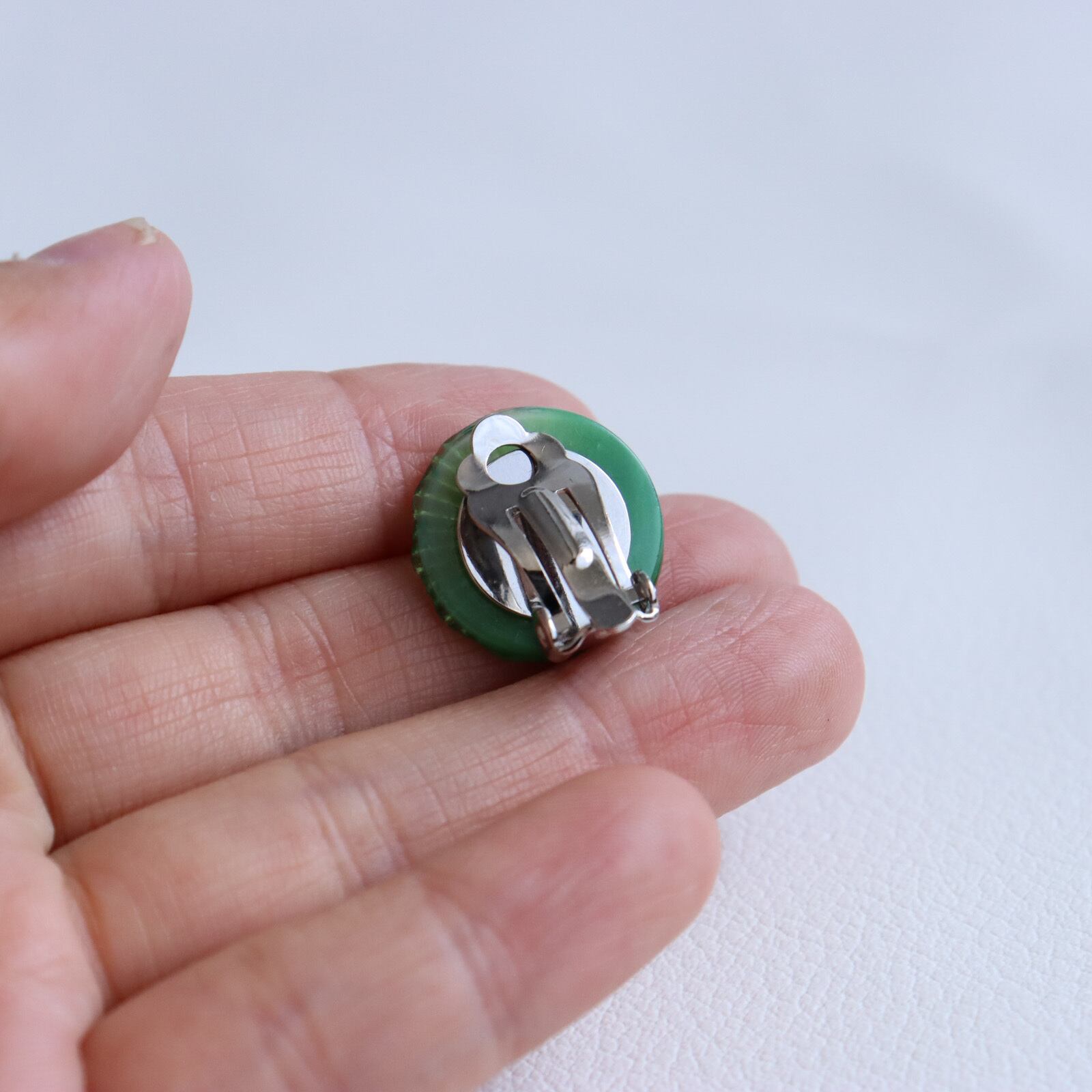 深緑と透明、白のガラスが重なり合って作られた、ムーングロウガラスボタンを使用したイヤリングのご紹介です。