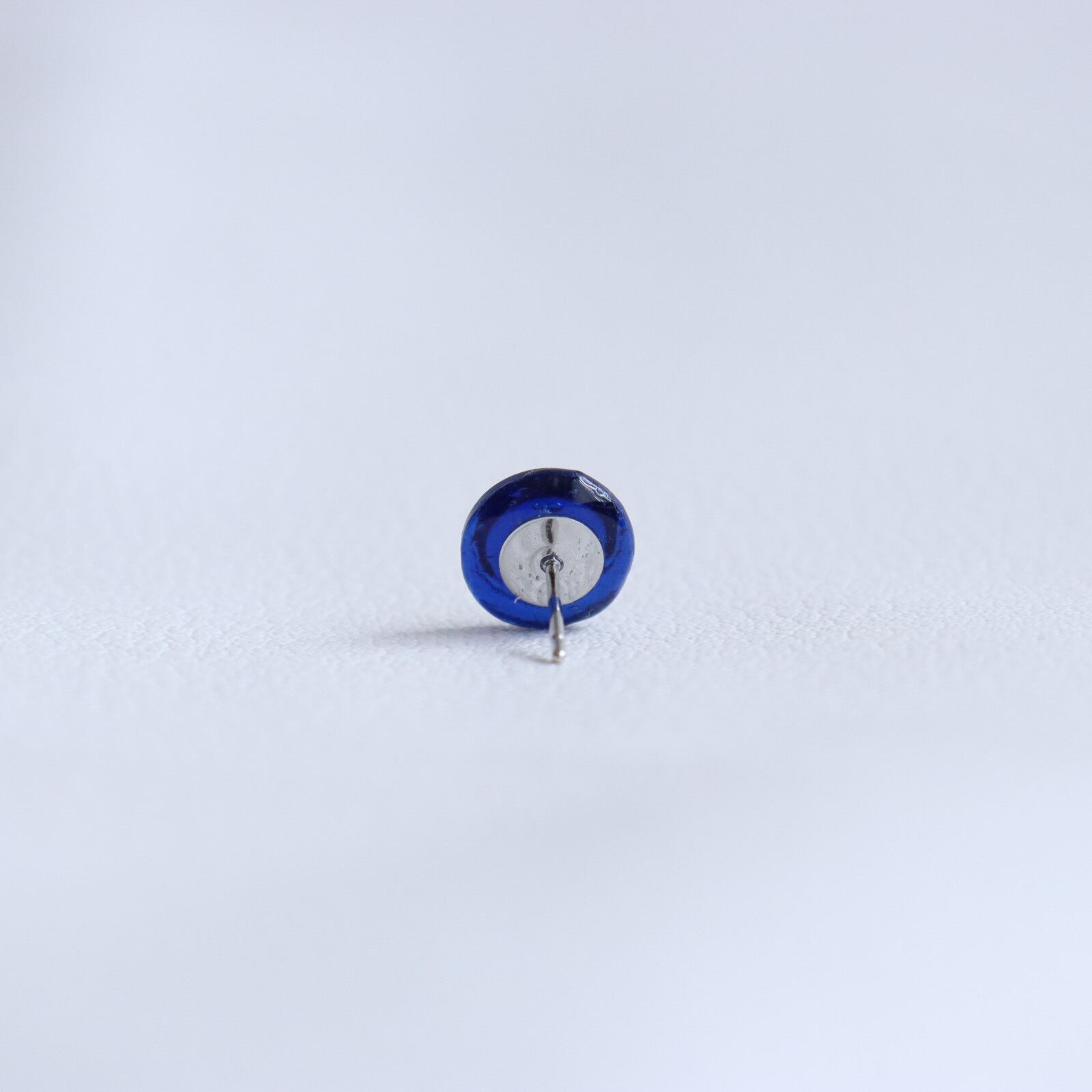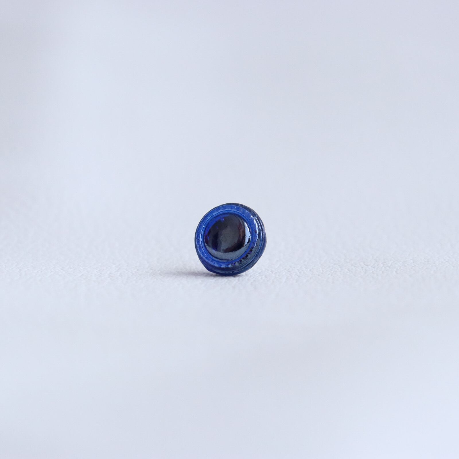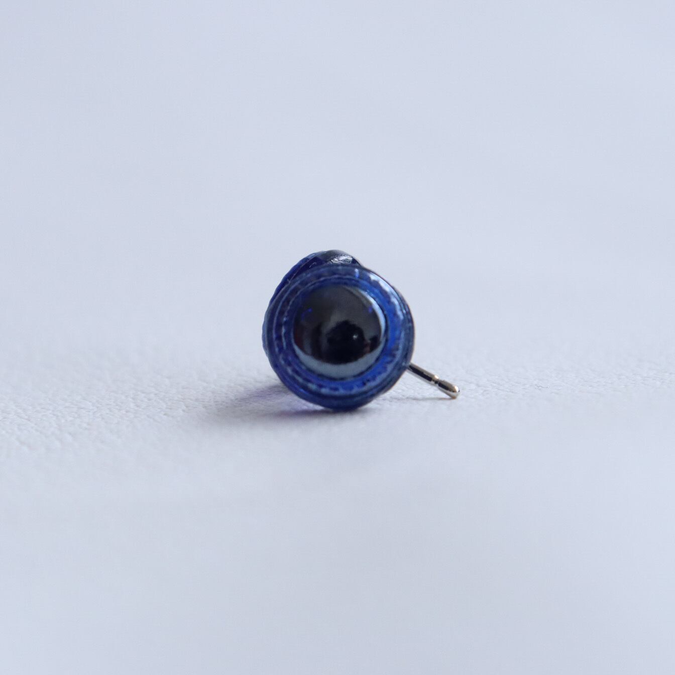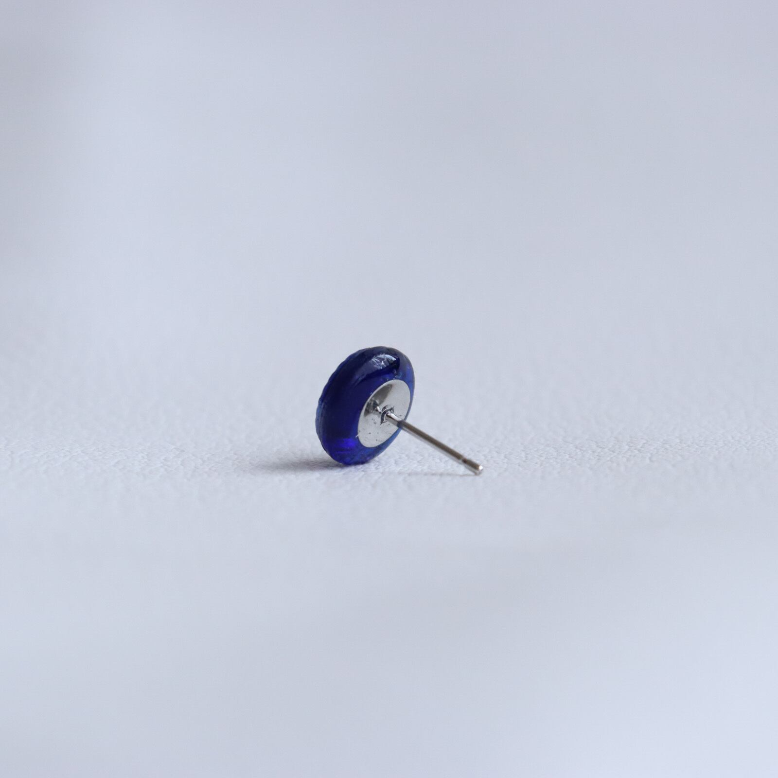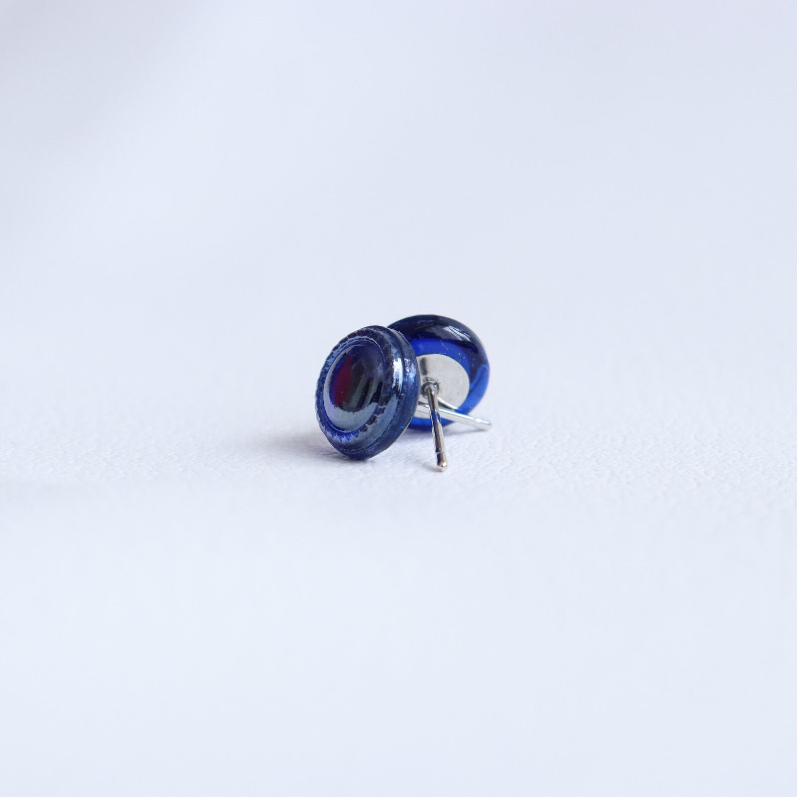1㎝以下の小さなボタンを加工して耳飾りを作成しました。深い青に透明感のあるガラス。まるで、底のない海が、ボタンの中に広がっているようで、吸い込まれてしまいそうなボタンの耳飾りです。ボタンの彫刻は大変シンプルで、縁取りの彫刻のみ。だからでしょうか?光沢感が良く目立ち、上品な印象を与えてくれます。