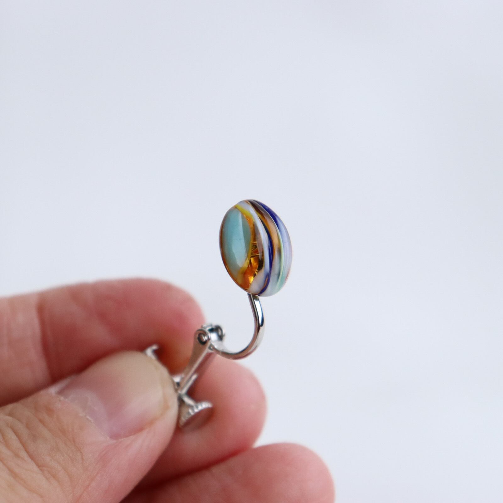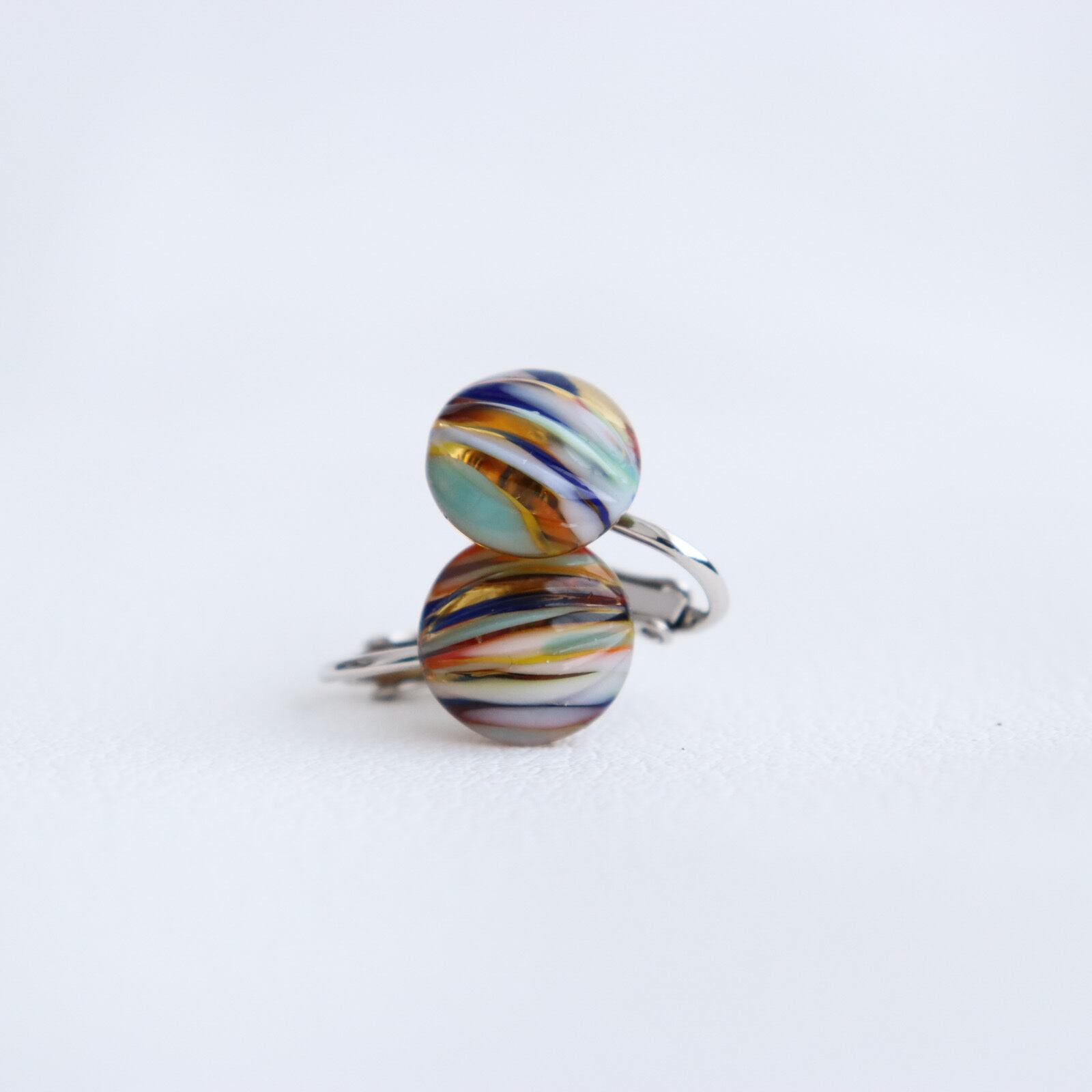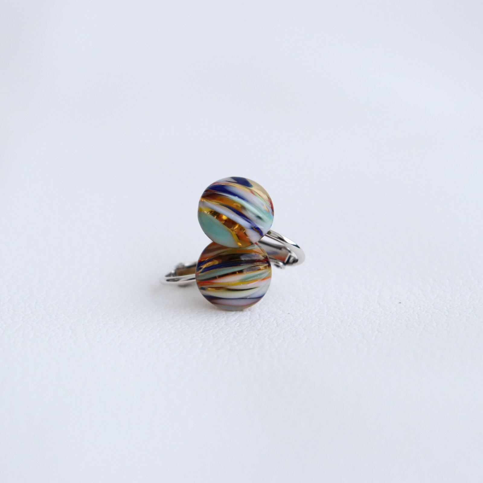 ガラス全体は淡いオレンジ色。そのオレンジを覆うように青、白、水色、赤、、、様々な色が重なり合い、まるで夕焼けの空にかかる幻想的な虹の様なガラスカボションをし用意したイヤリングのご紹介です。