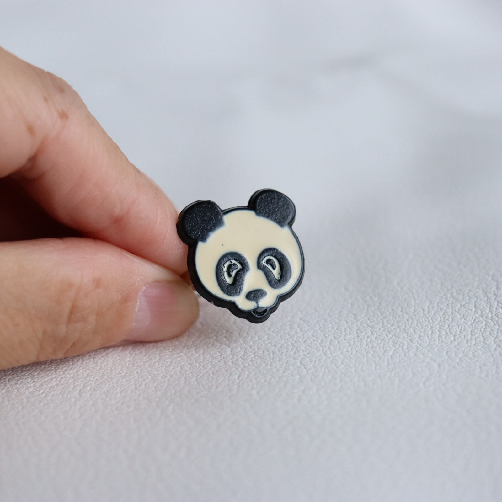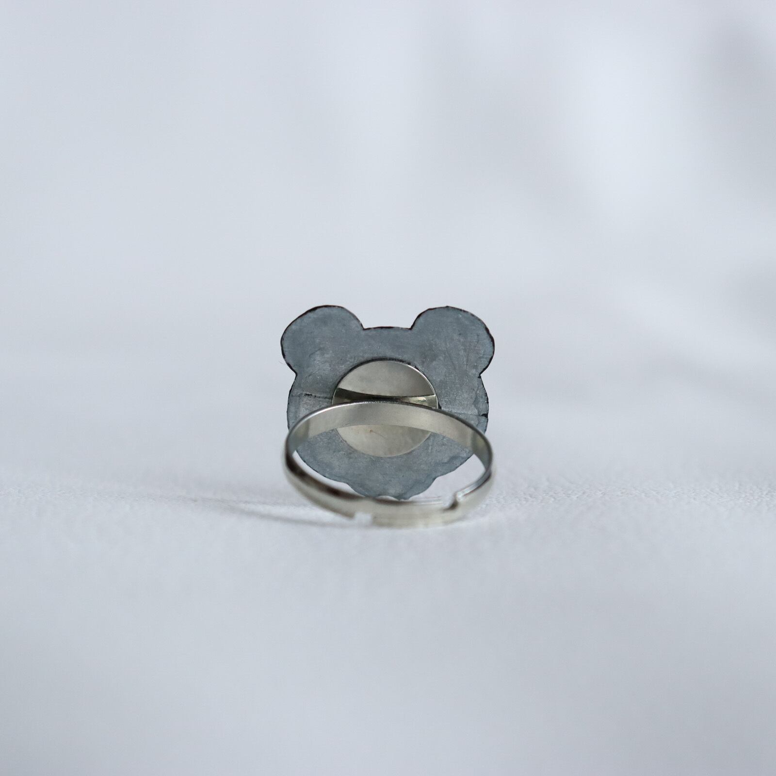 ゆるく垂れた目。少し微笑んでいるような口元。癒し系パンダのメタルボタンリングのご紹介です。ボタンの素材はメタル。平たいボタンです。
