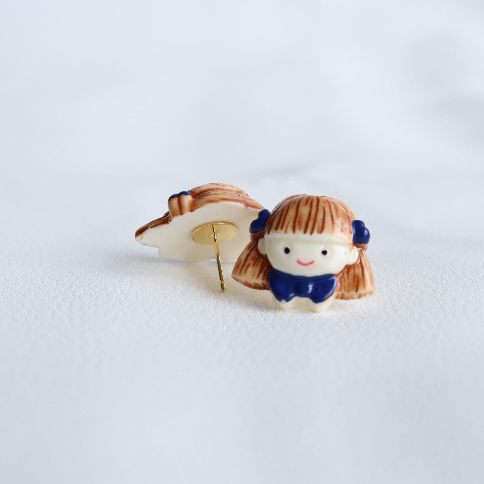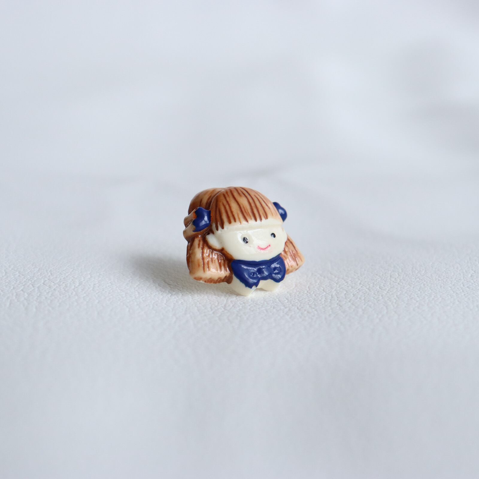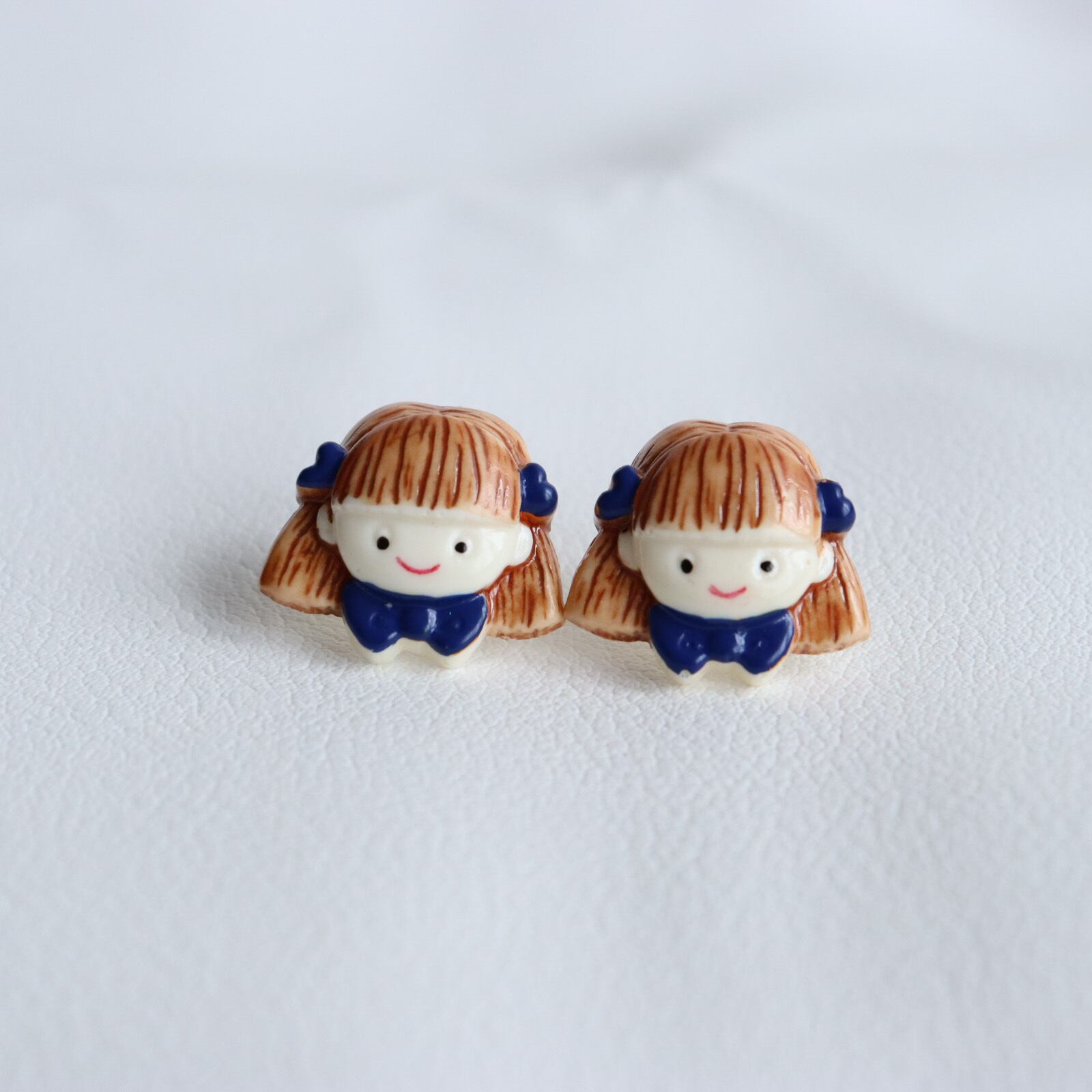 にこっと可愛い双子の女の子がこちらを見て微笑んでいます。フランスからやってきた双子の姉妹ボタンを使用した耳飾りのご紹介です。茶色の髪を紺色のリボンで左右で束ねて、紺色の蝶ネクタイ。お揃いってとても可愛いですね。見ているだけで微笑んでしまうボタンジュエリーです。