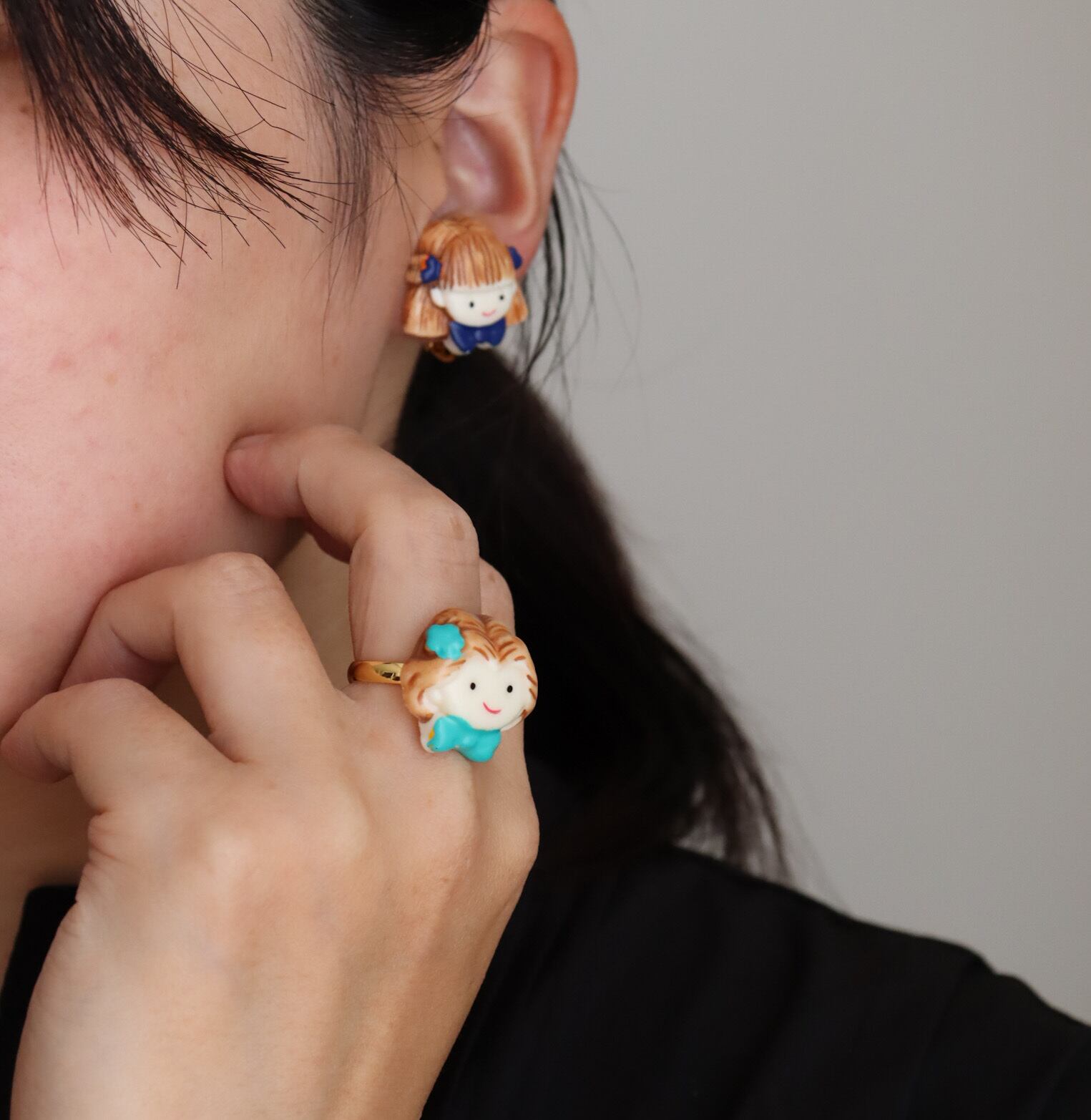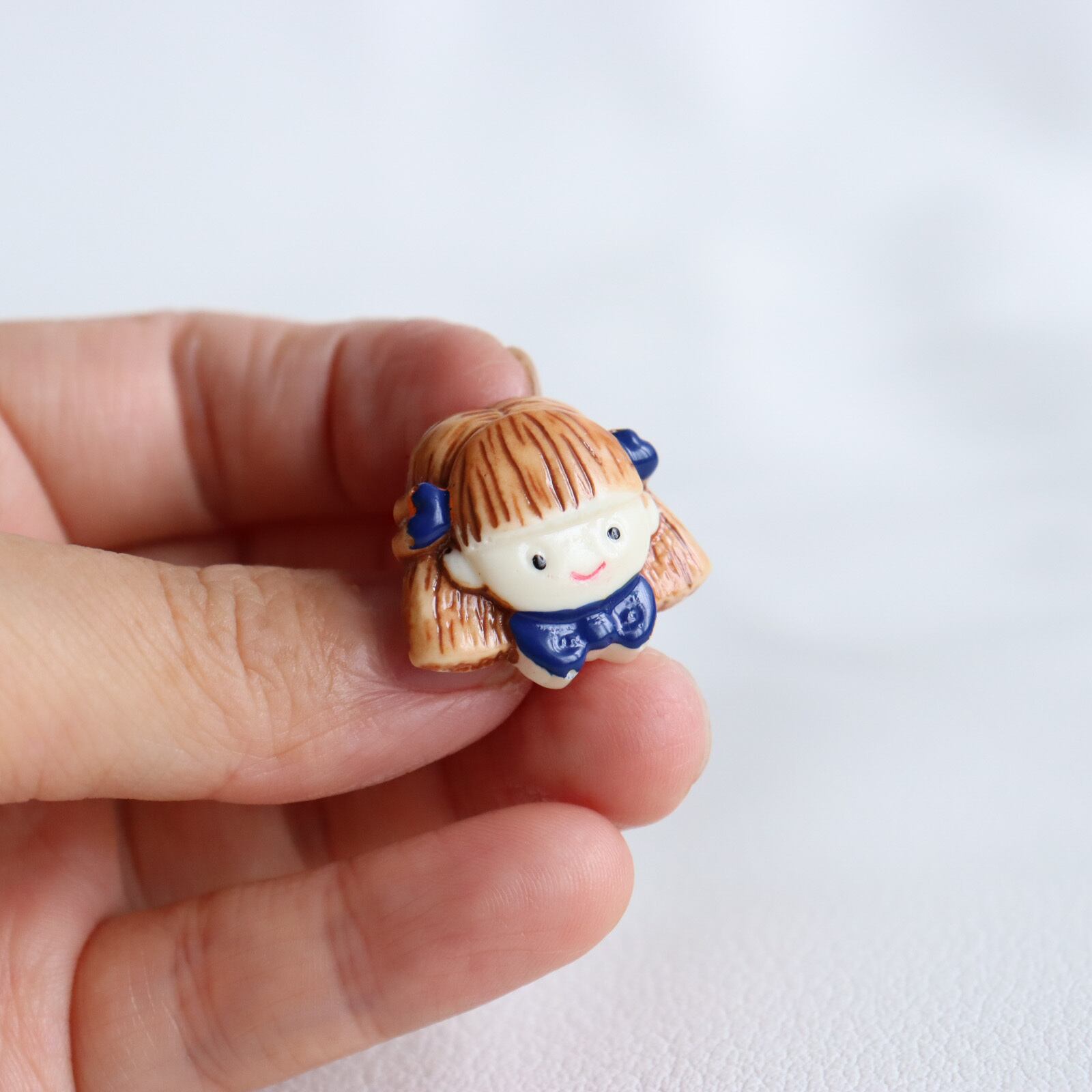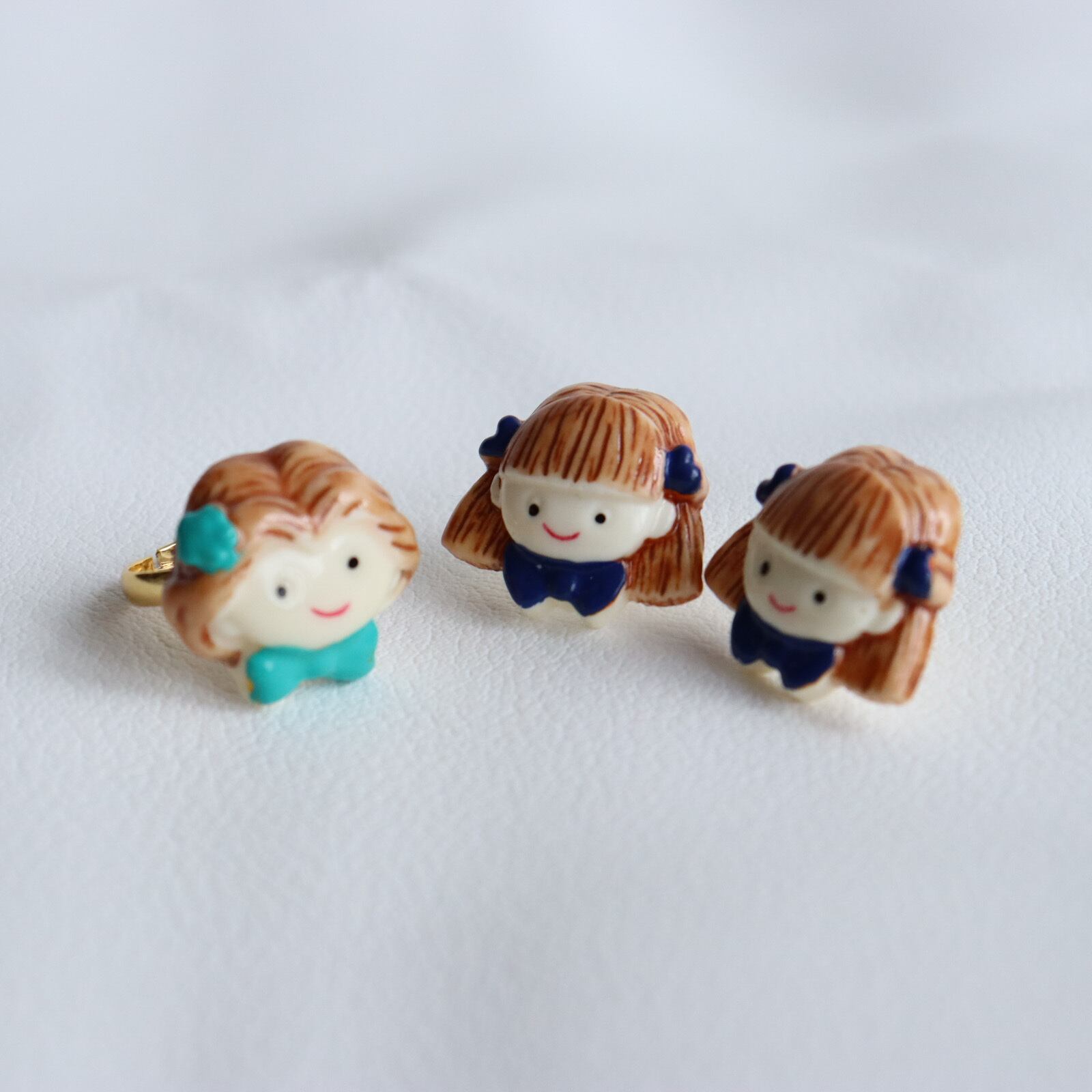 にこっと可愛い双子の女の子がこちらを見て微笑んでいます。フランスからやってきた双子の姉妹ボタンを使用した耳飾りのご紹介です。茶色の髪を紺色のリボンで左右で束ねて、紺色の蝶ネクタイ。お揃いってとても可愛いですね。見ているだけで微笑んでしまうボタンジュエリーです。