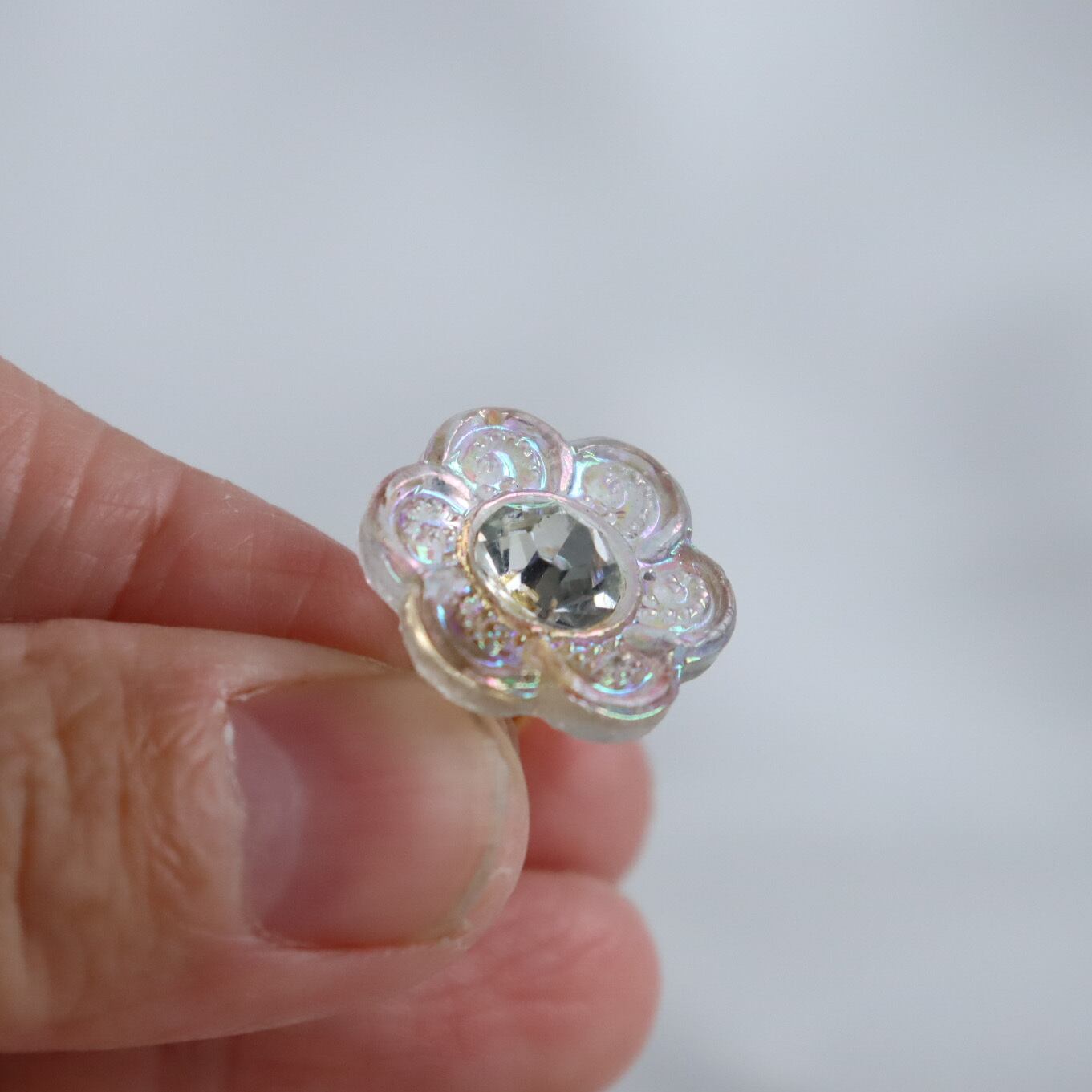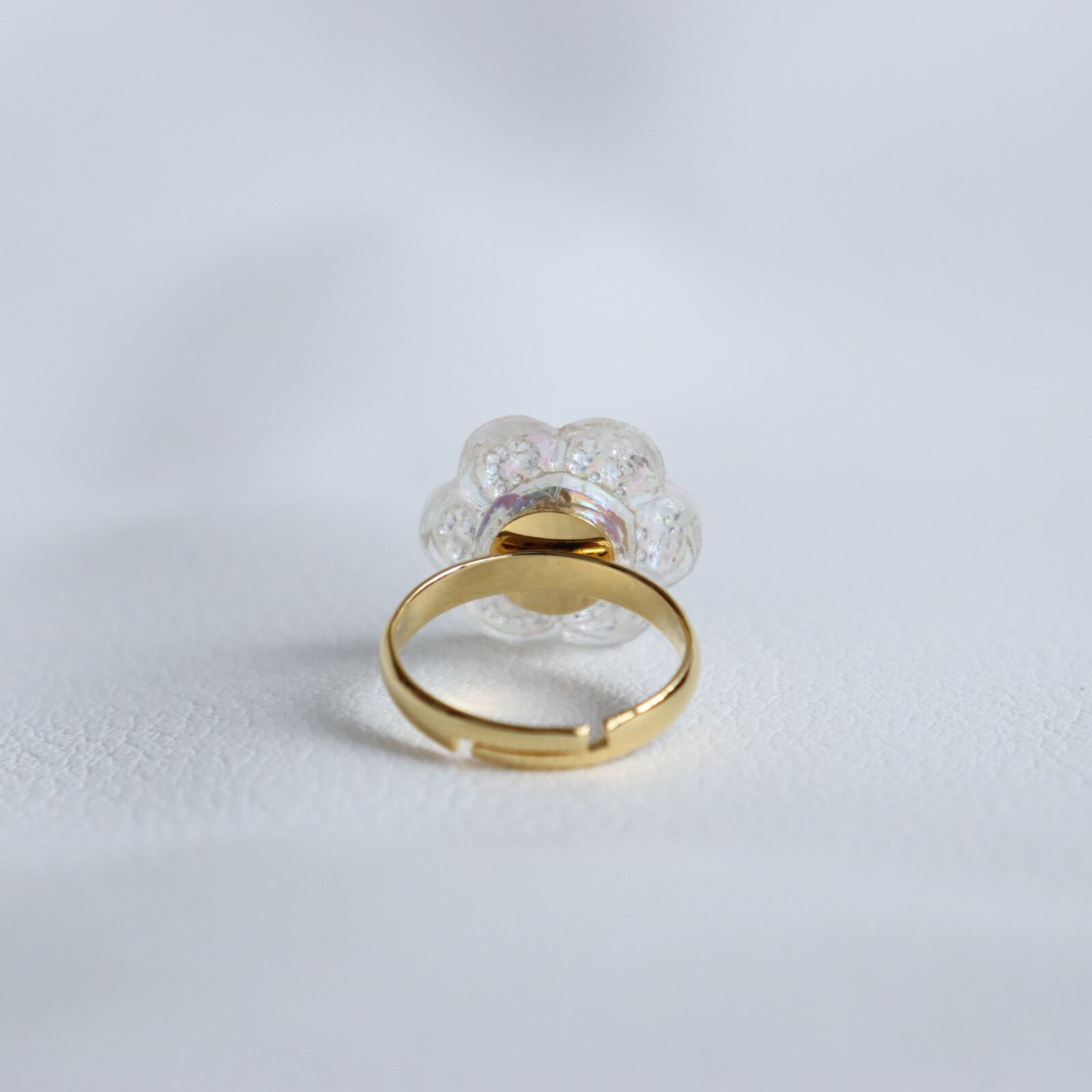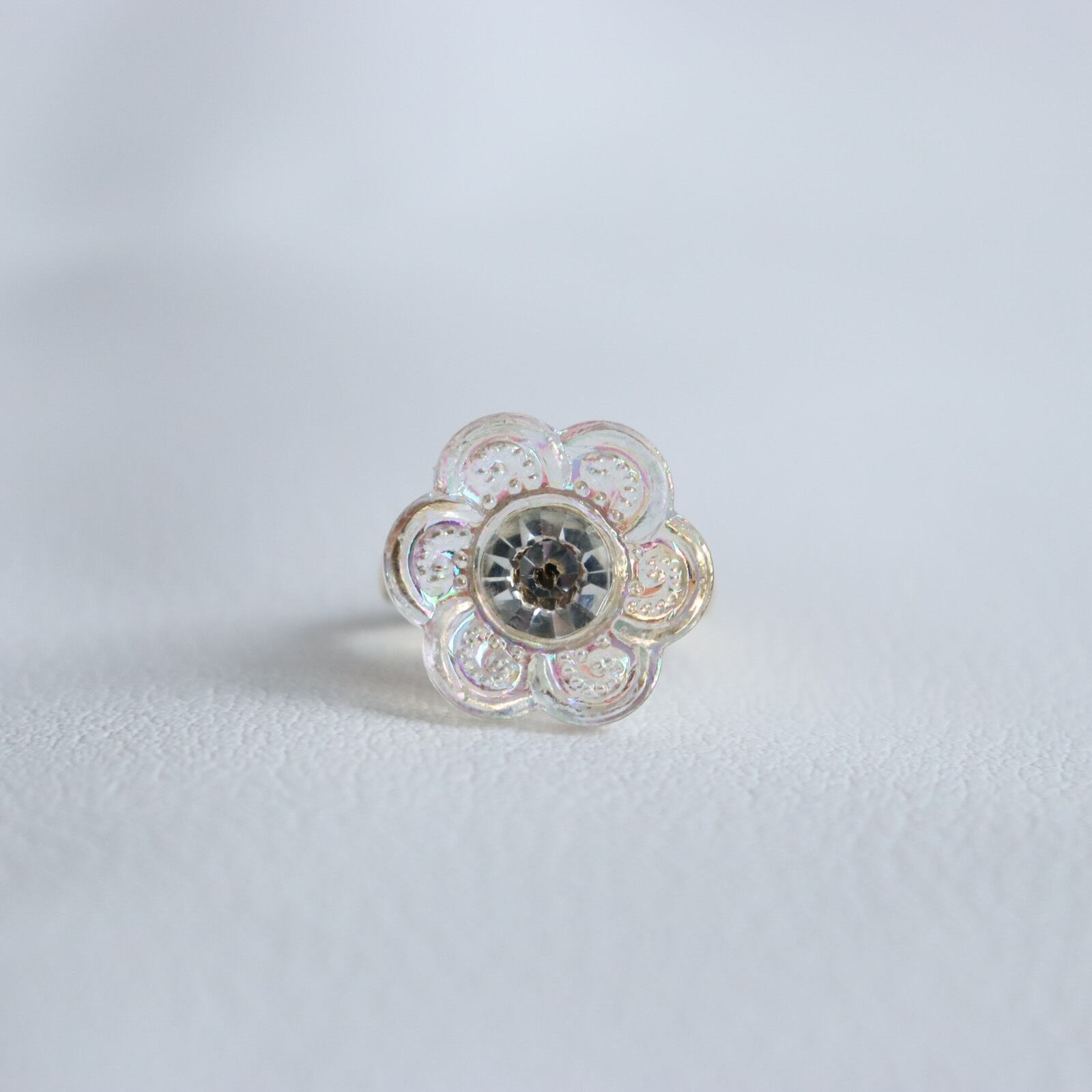 中心にクリスタル。その周りをプラスチック製の花びらが覆う。幻想世界の花のボタンを指輪に仕上げました。クリスタルはダイヤモンドカットの様で、キラキラと光る姿がとても豪華です。花びら部分は全体にオーロラコーティングが施されており、可愛らしいお花の印象を与えてくれます。光と共にオーロラの濃淡が変化するのも素敵です。