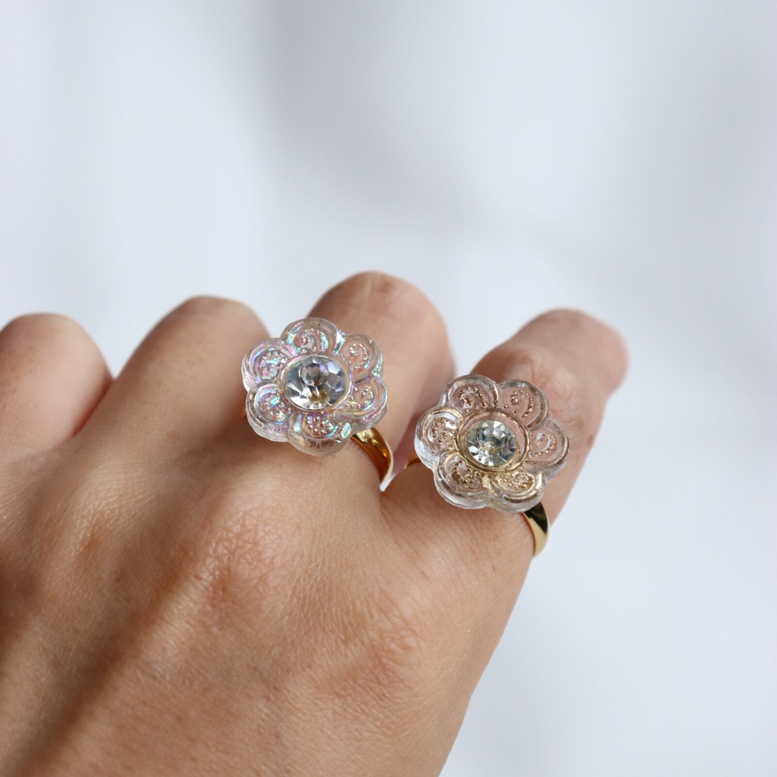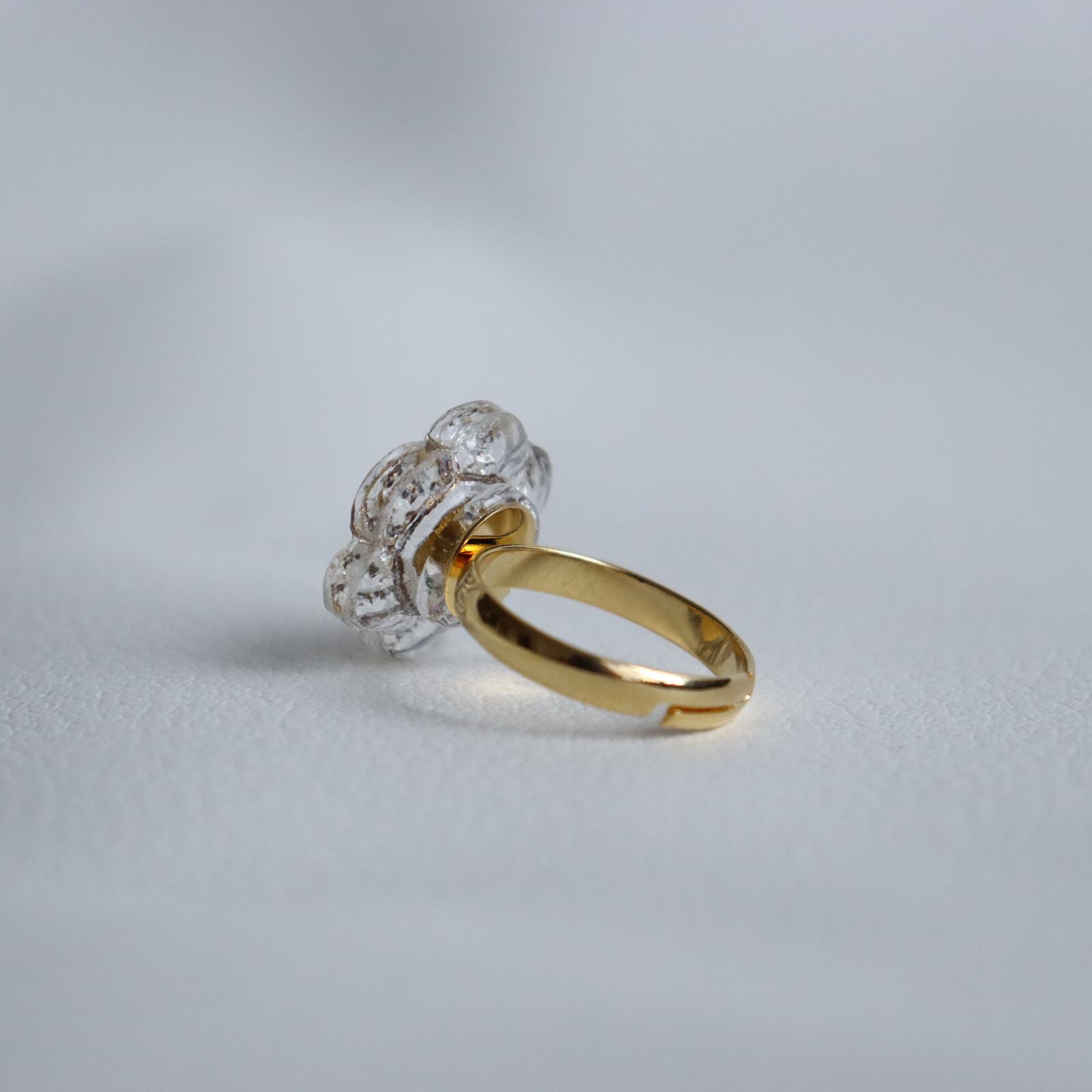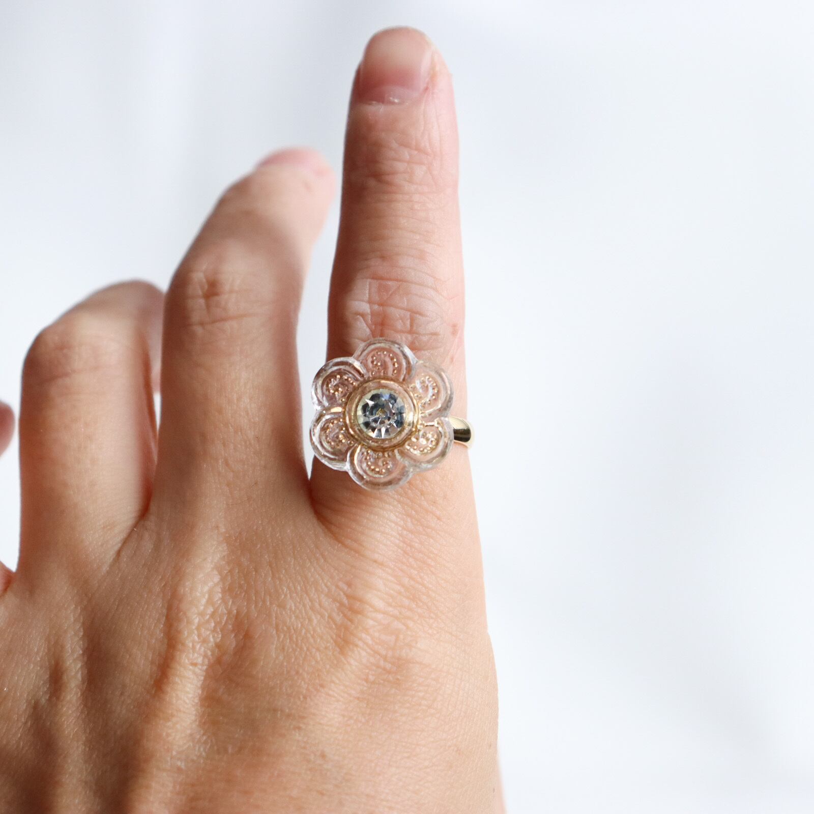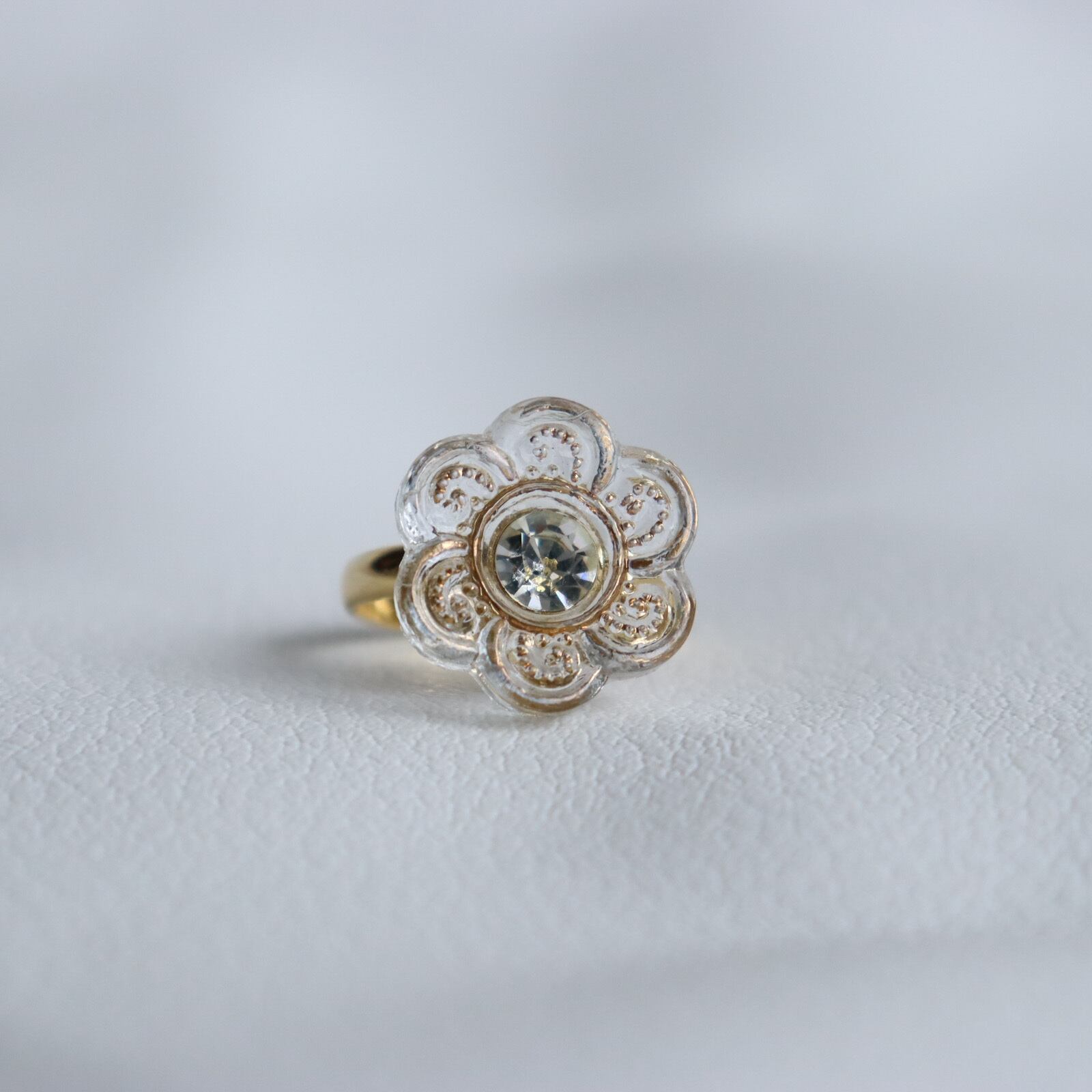 中心にクリスタル。その周りをプラスチック製の花びらが覆う。幻想世界の花のボタンを指輪に仕上げました。クリスタルはダイヤモンドカットの様で、キラキラと光る姿がとても豪華です。花びら部分は金色の塗装が施されており透明なボタンの彫刻がふわっと浮き上がり、立体的です。