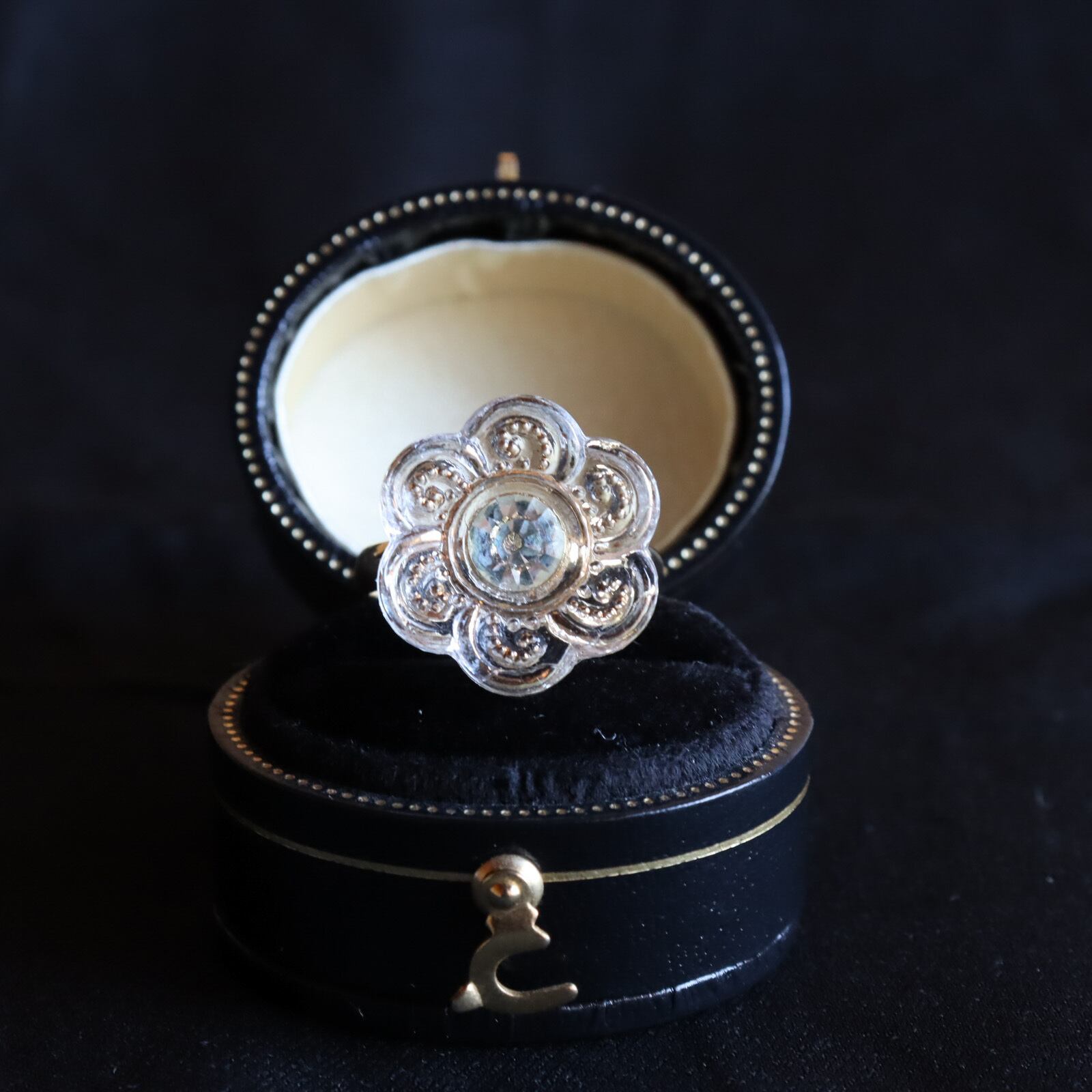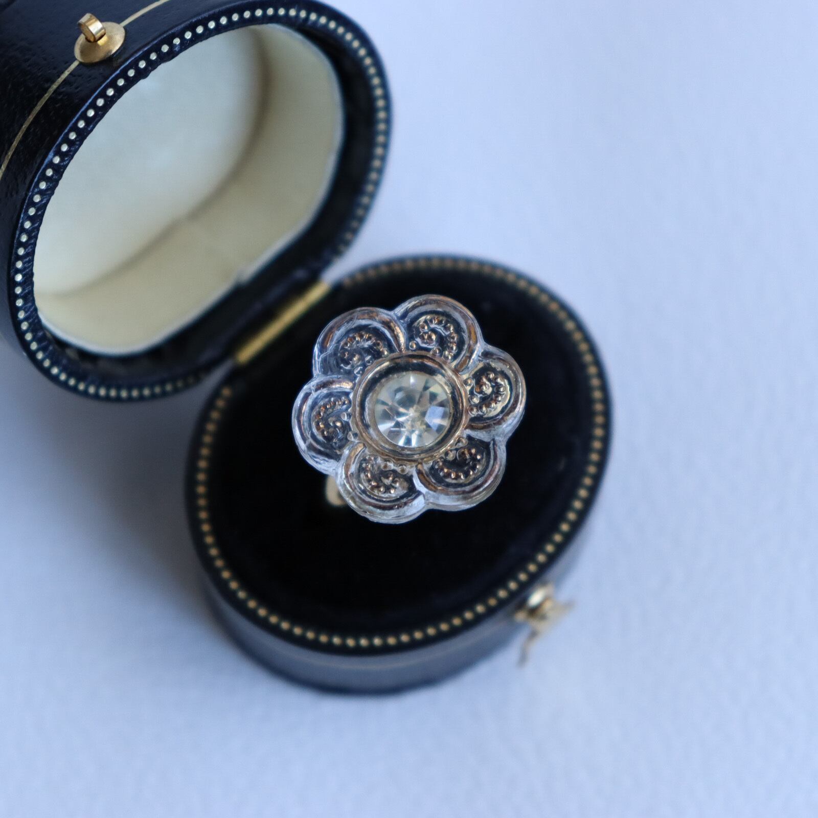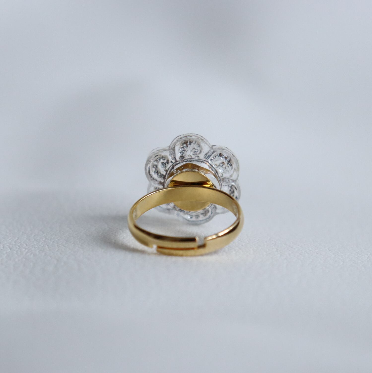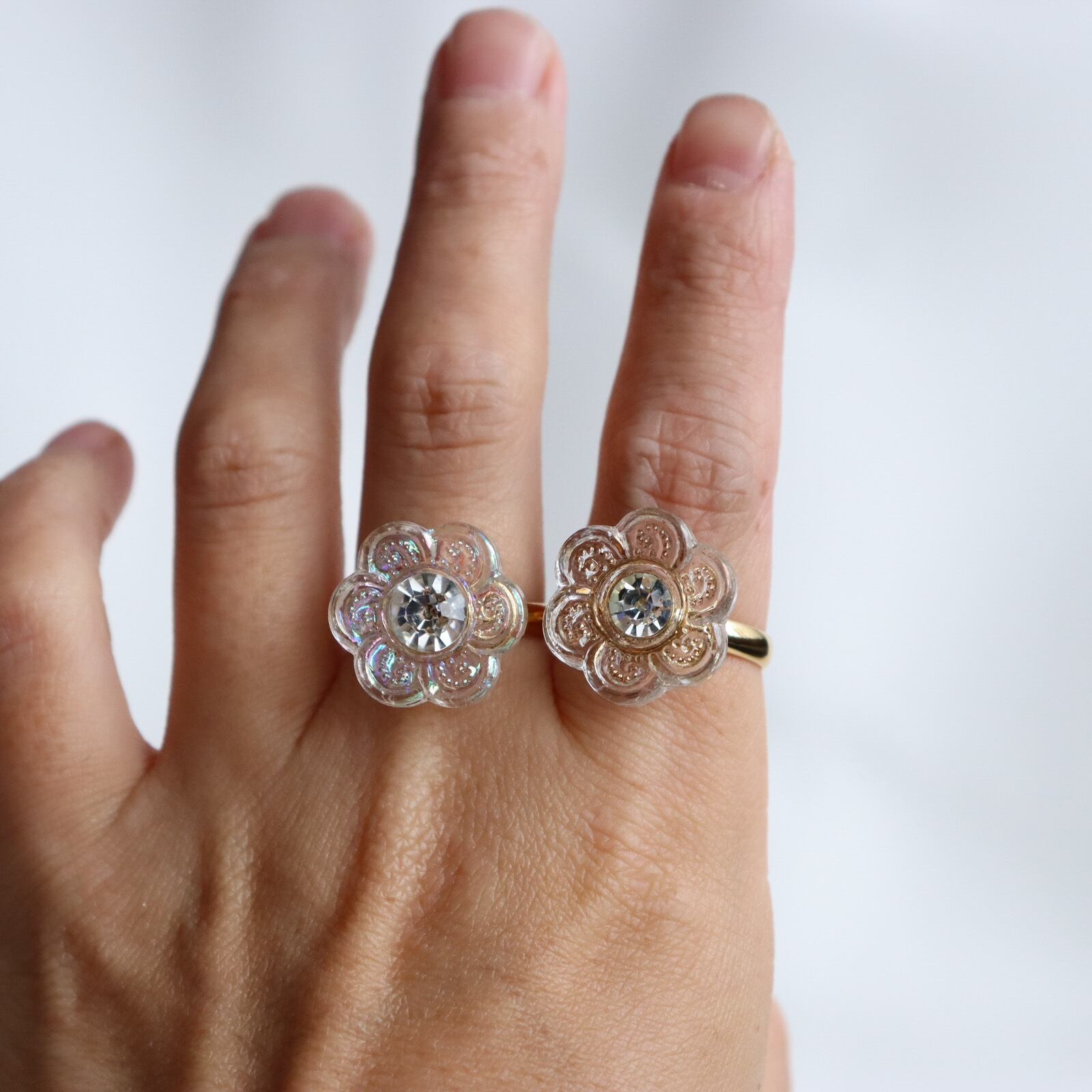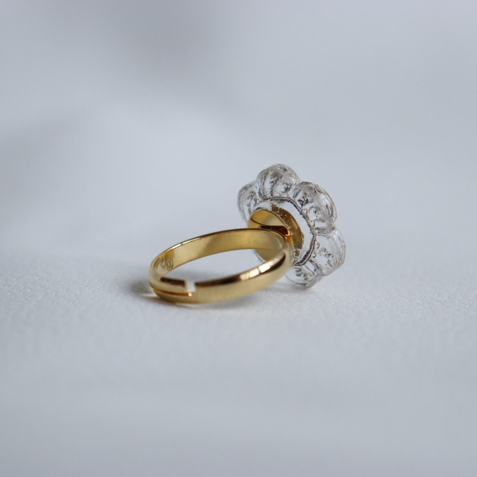 中心にクリスタル。その周りをプラスチック製の花びらが覆う。幻想世界の花のボタンを指輪に仕上げました。クリスタルはダイヤモンドカットの様で、キラキラと光る姿がとても豪華です。花びら部分は金色の塗装が施されており透明なボタンの彫刻がふわっと浮き上がり、立体的です。