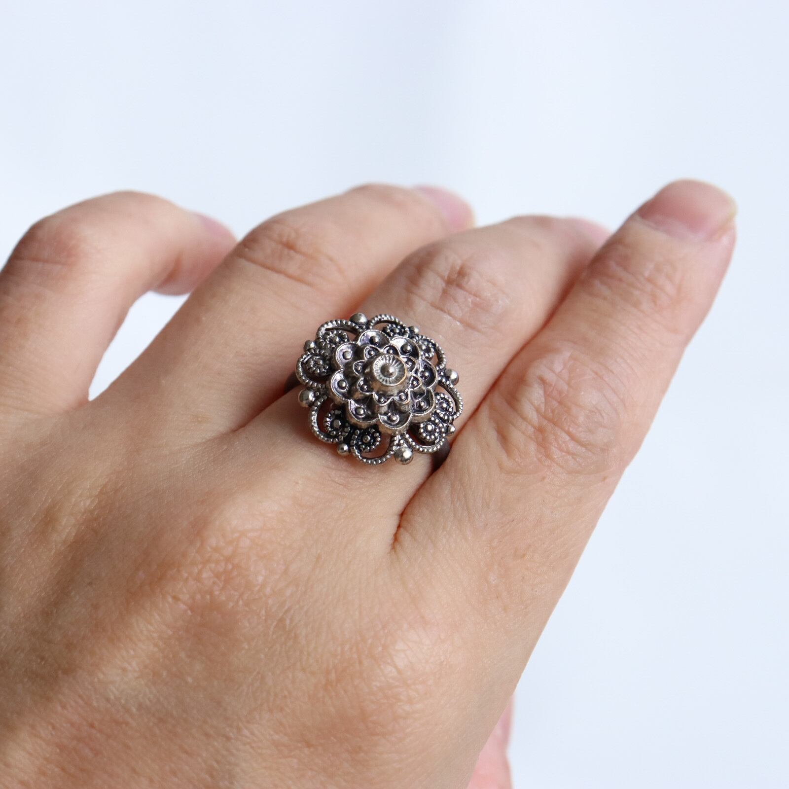 【Thank you sold!】【指輪】 銀色の花 アンティーク メタルボタン