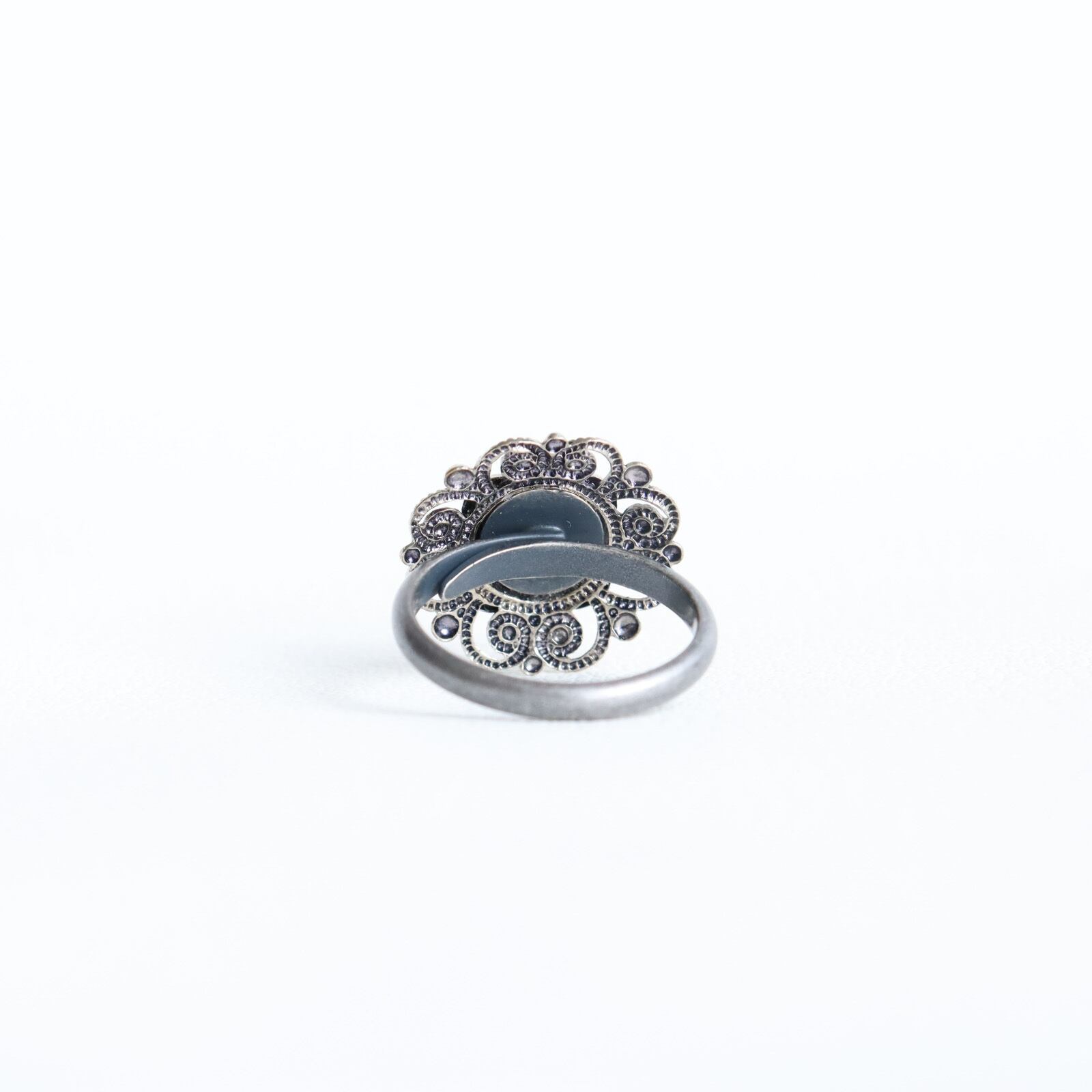 指輪のパーツは11号銀古美の物を合わせました。裏面のボタンの凹みに、リング台がすっぽりと入り、裏側はとてもシャープな仕上がりです。