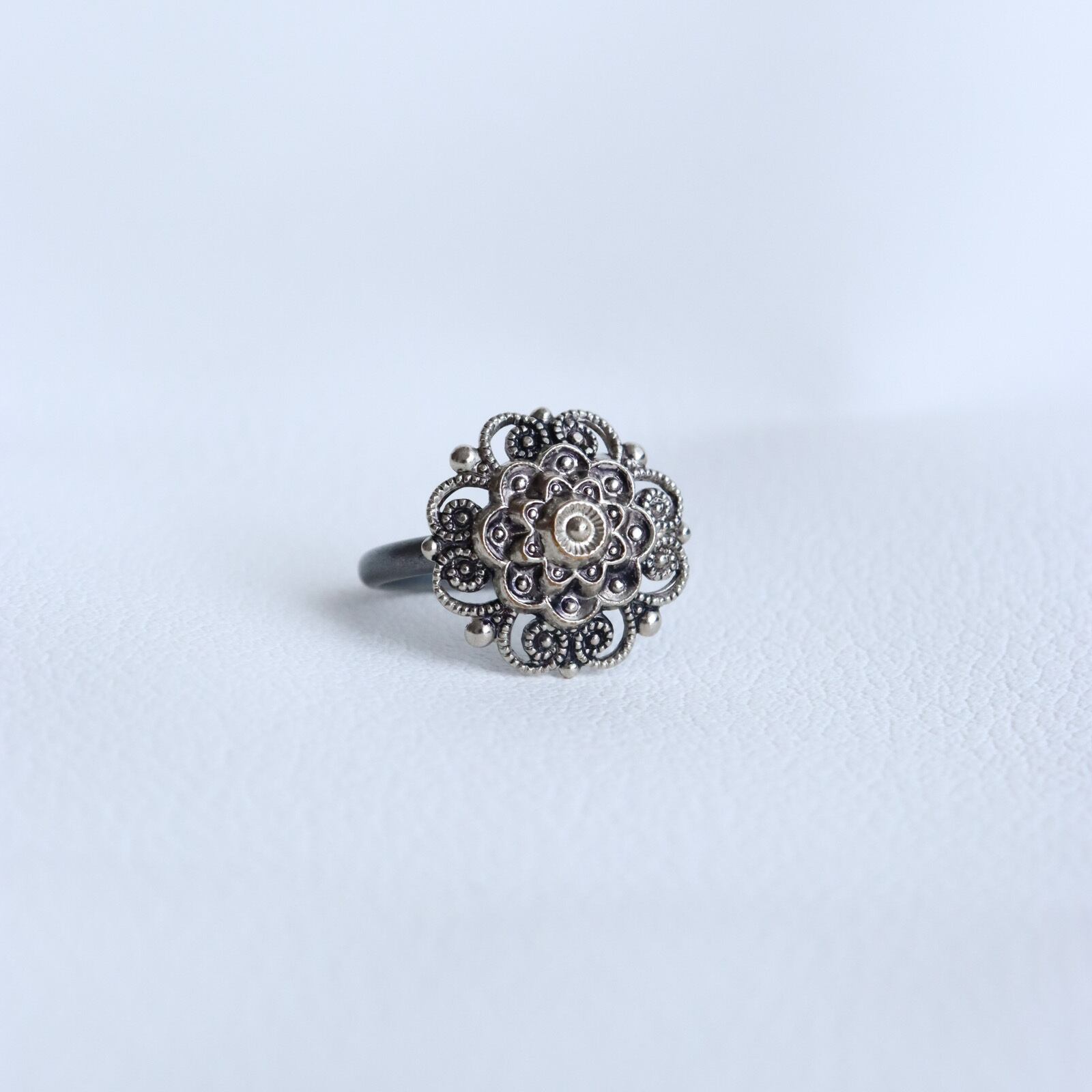 フランスアンティークのメタルボタンを加工して製作した、「銀の花の指輪」のご紹介です。