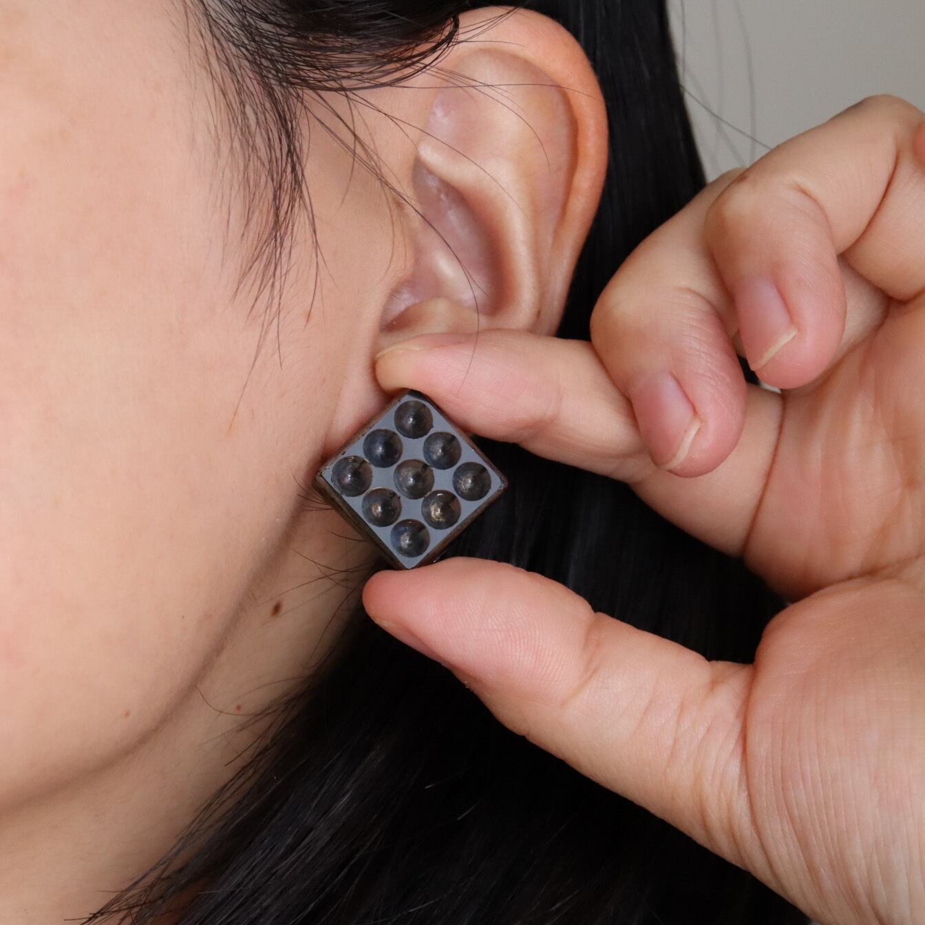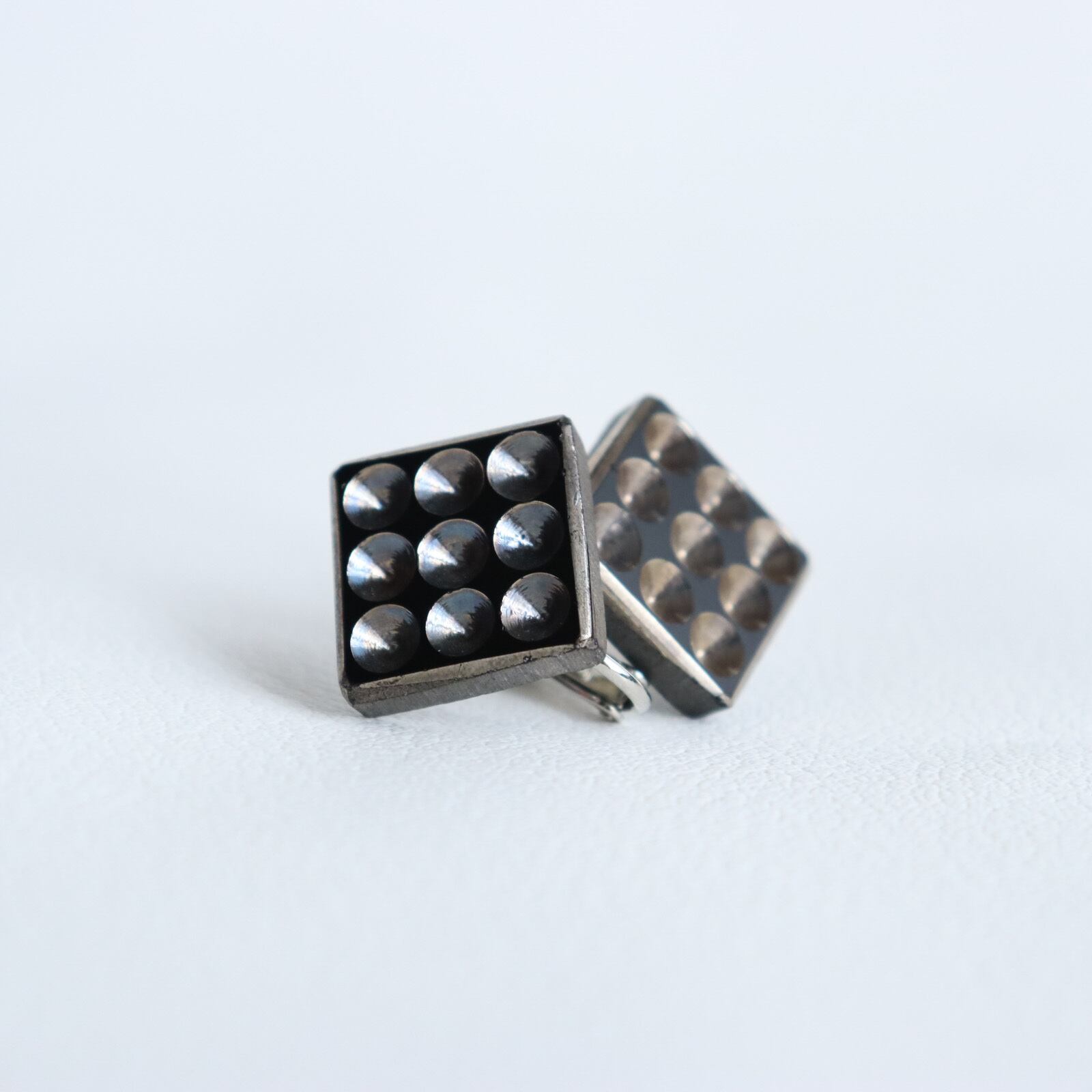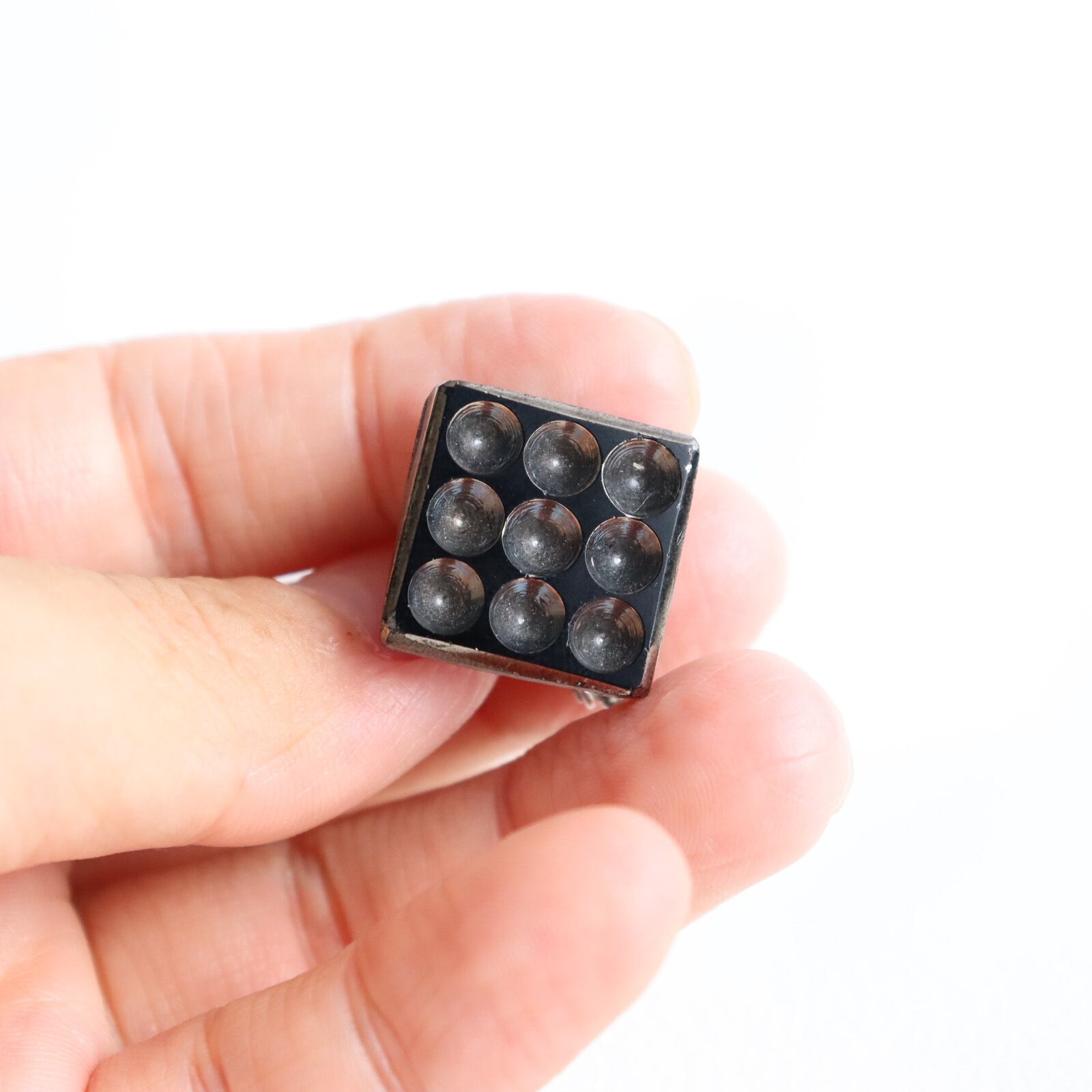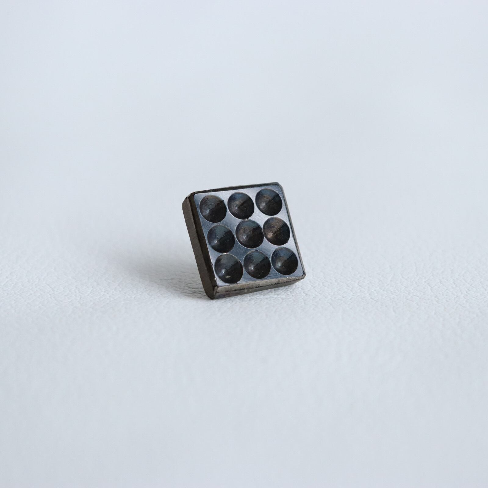 ボタンの形は、とても面白い四角。少し厚みがあり、重厚感のある黒です。そのボタンの表面に9個の円錐形の穴が開いており、個性的なボタンです。