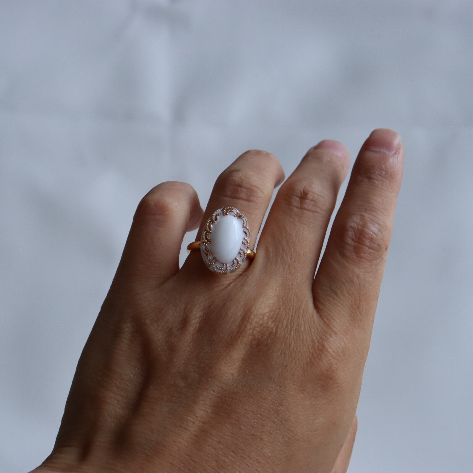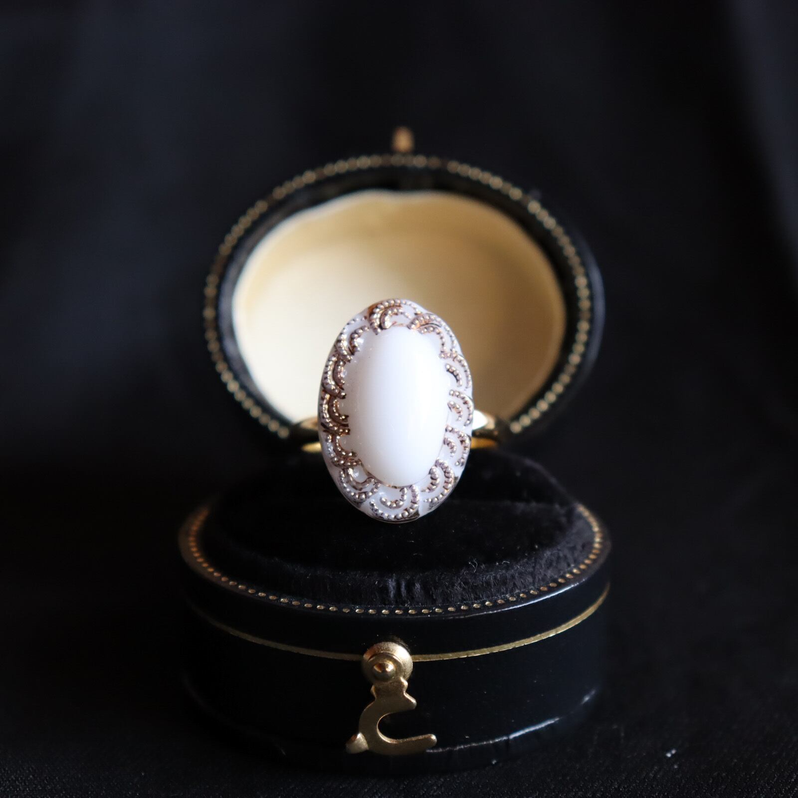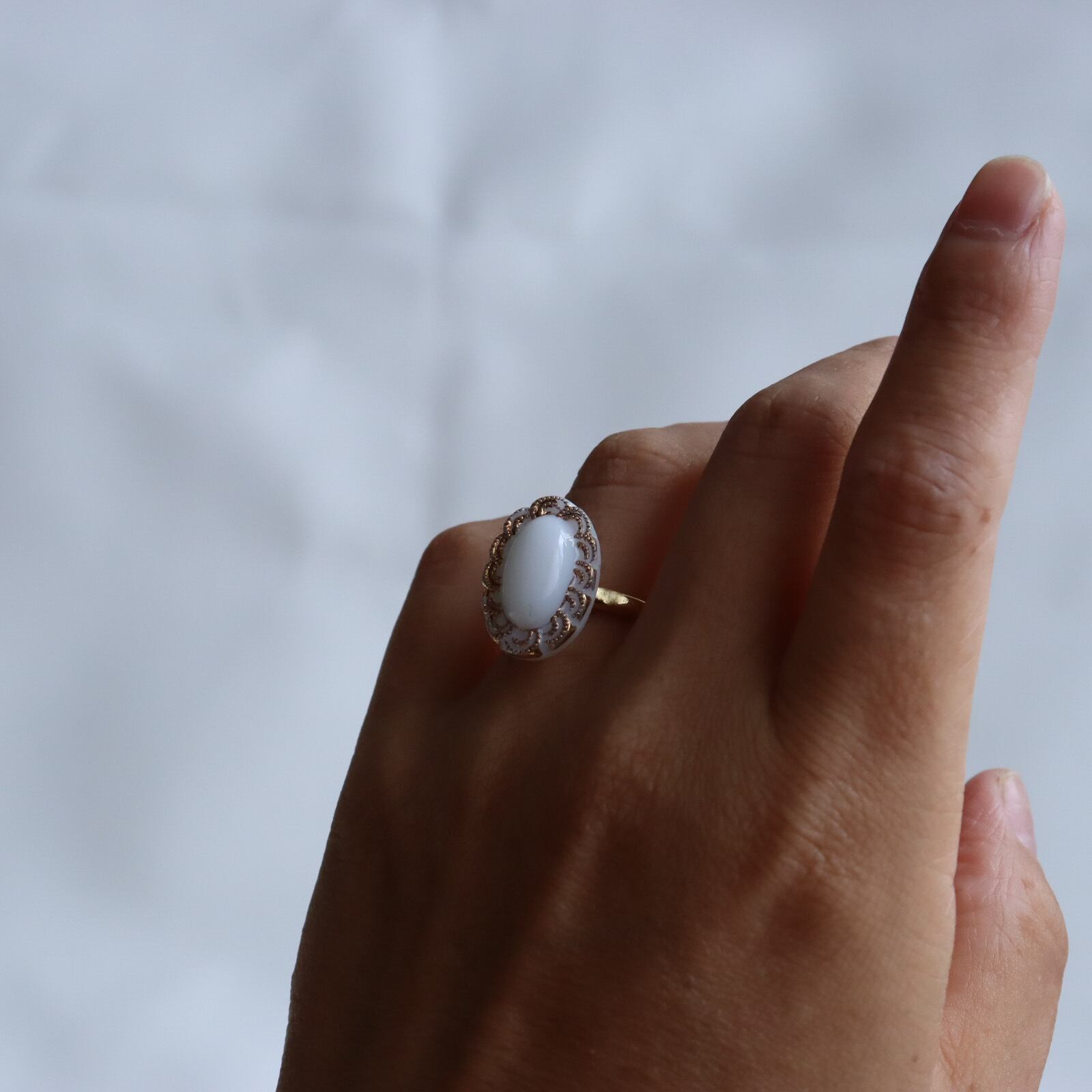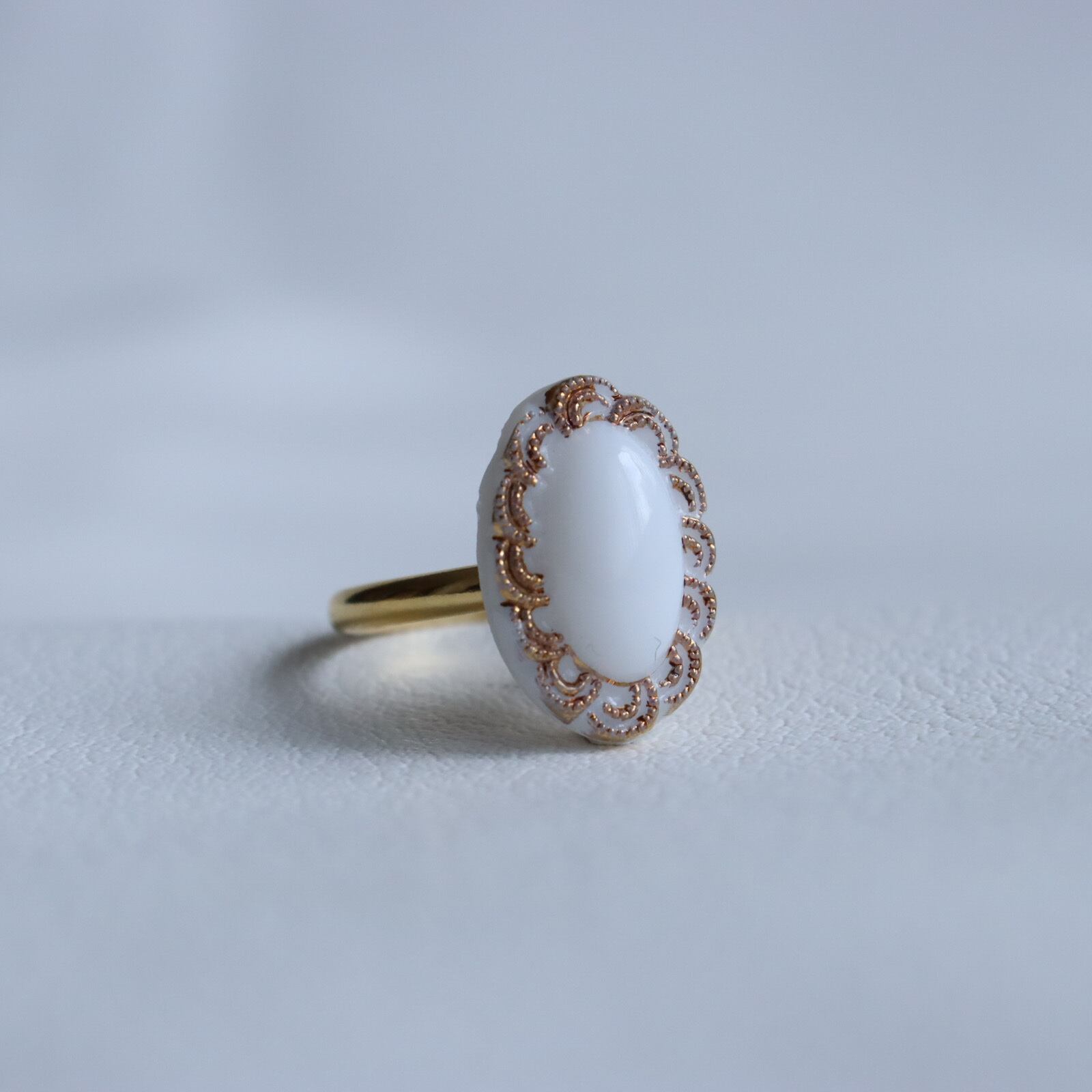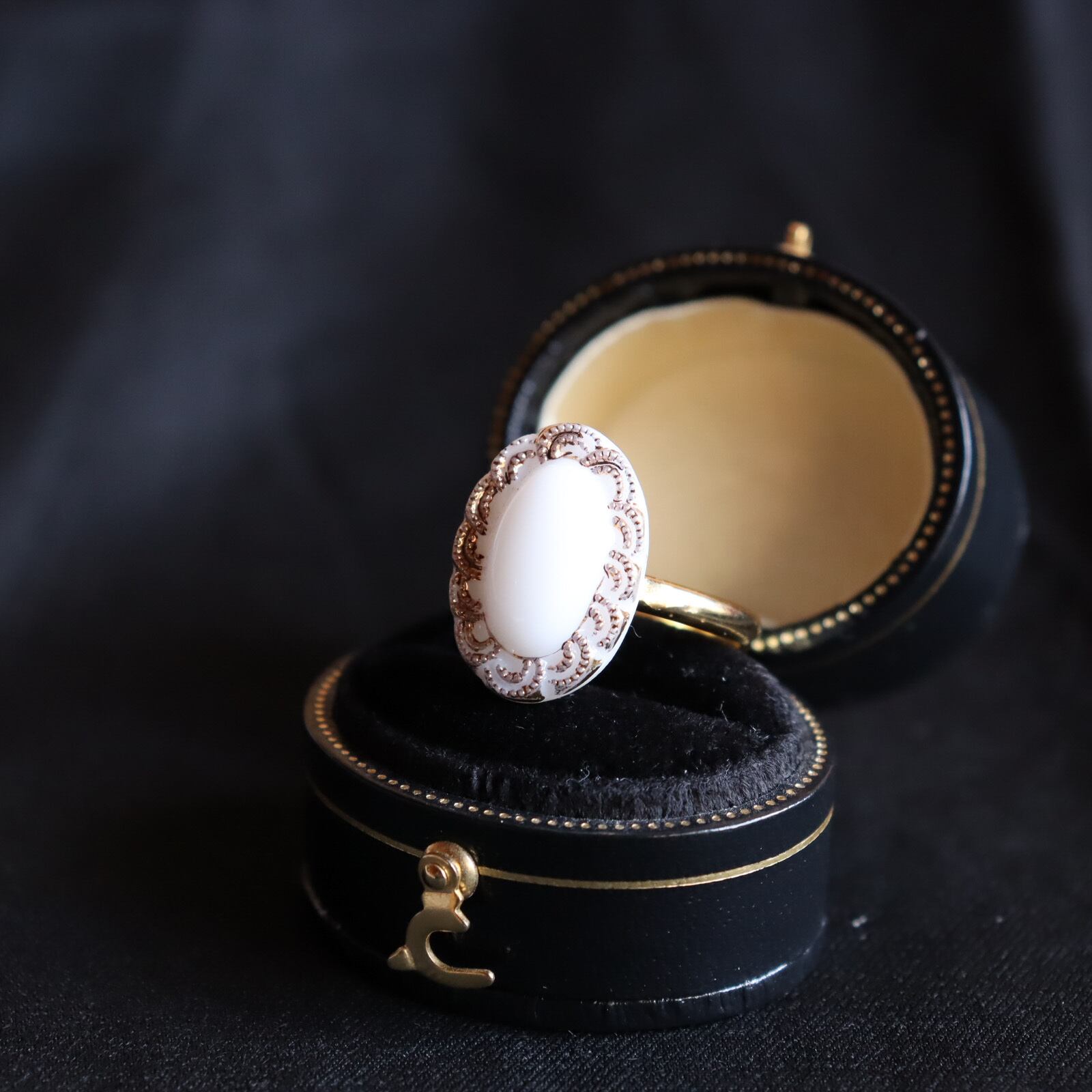 フランス製造のアンティークガラスボタンを加工して、可憐な姿の指輪を作成しました。