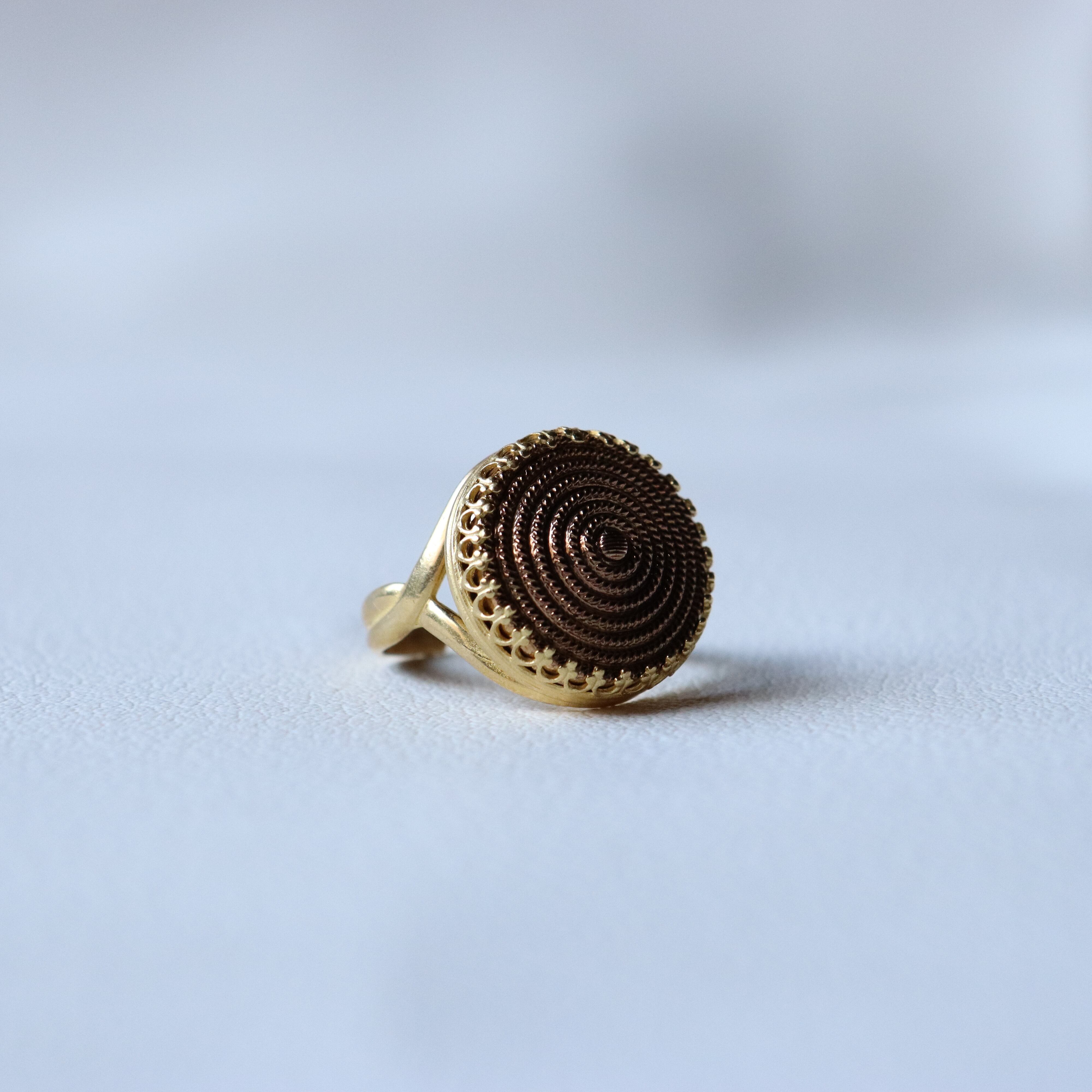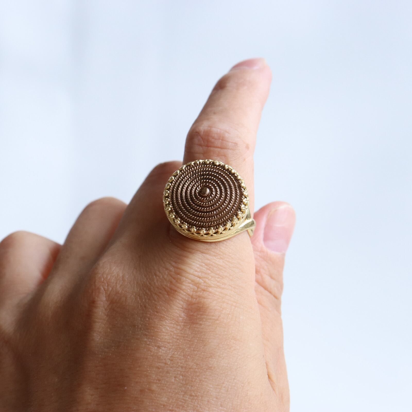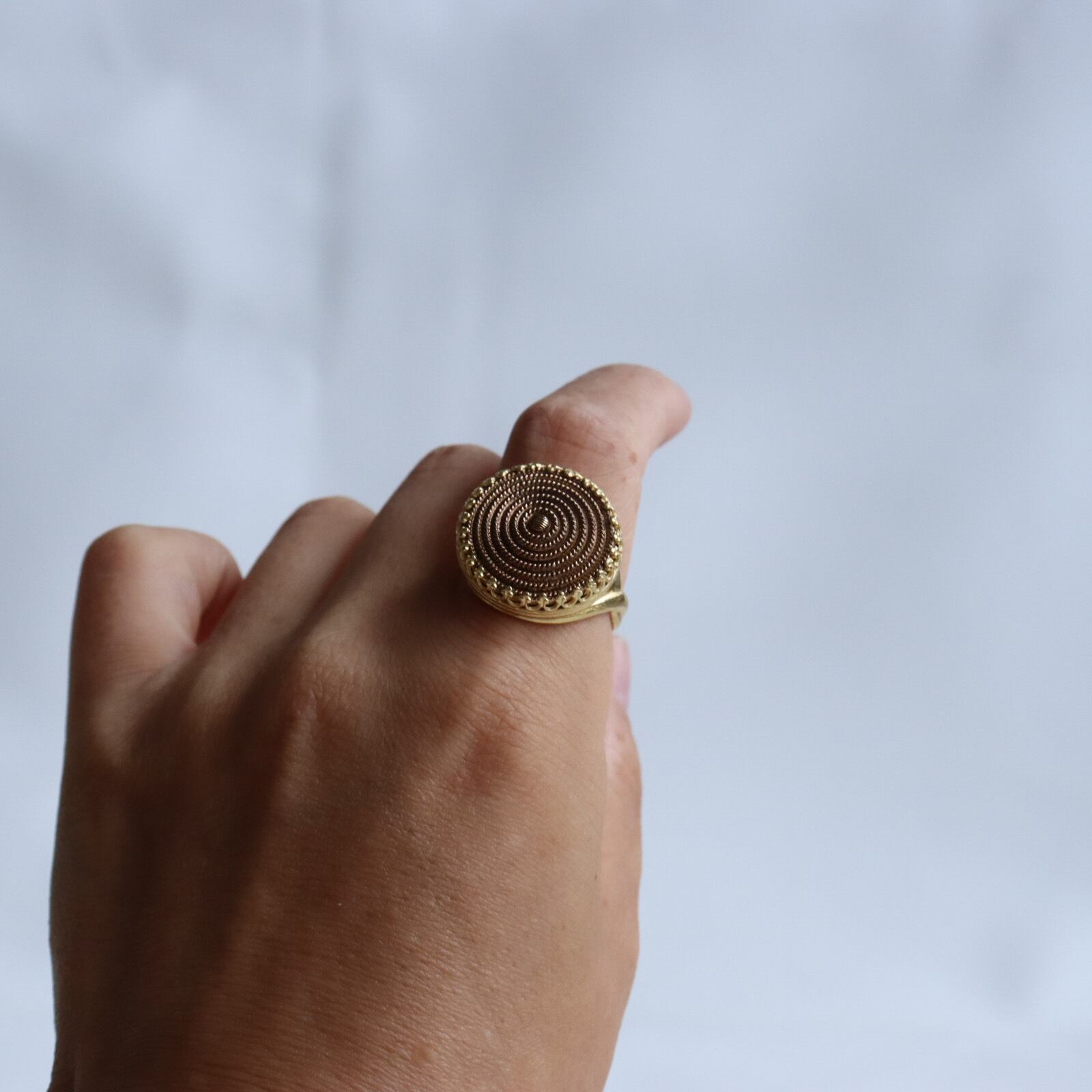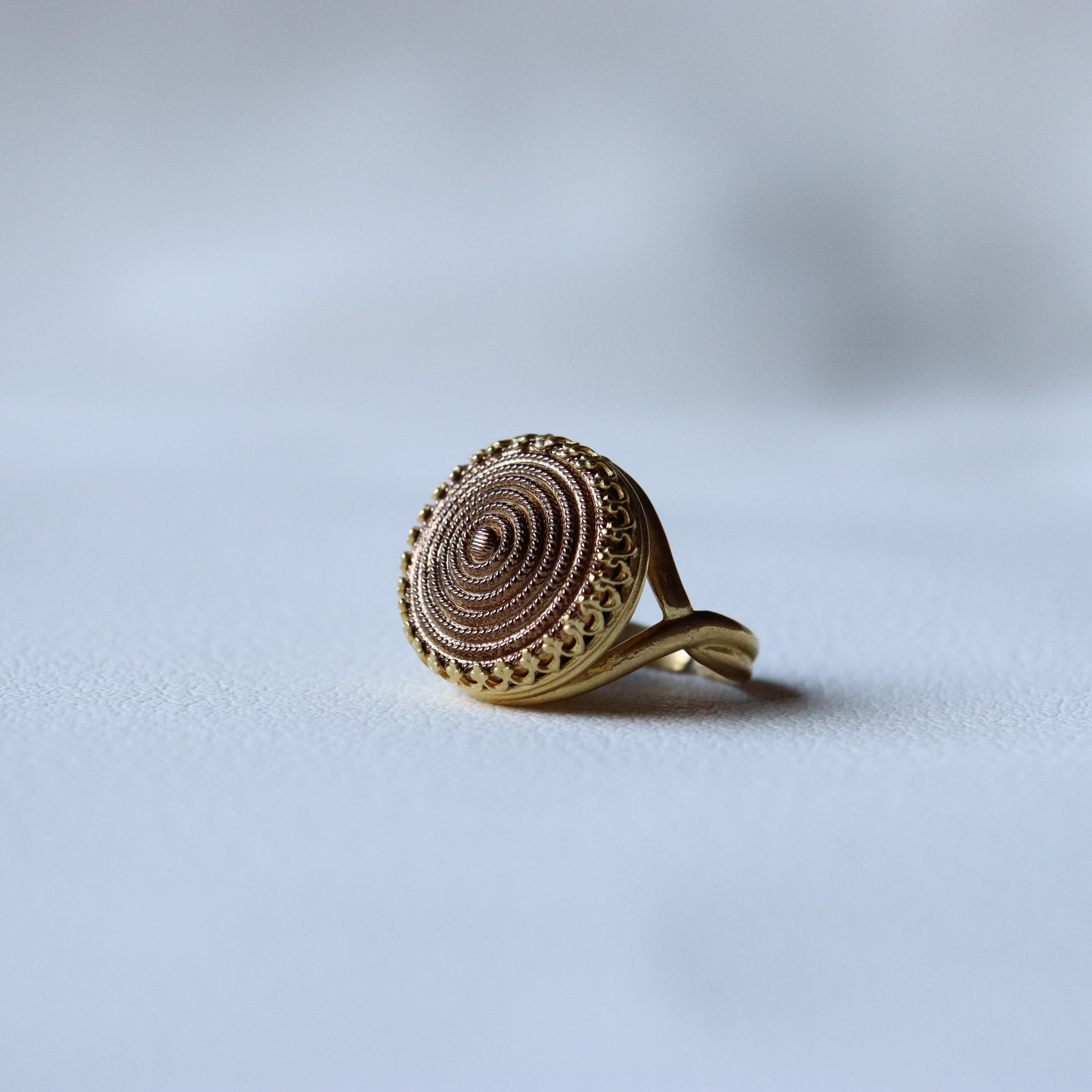 金色でありながら、優しい光を放つアンティークゴールドの指輪。