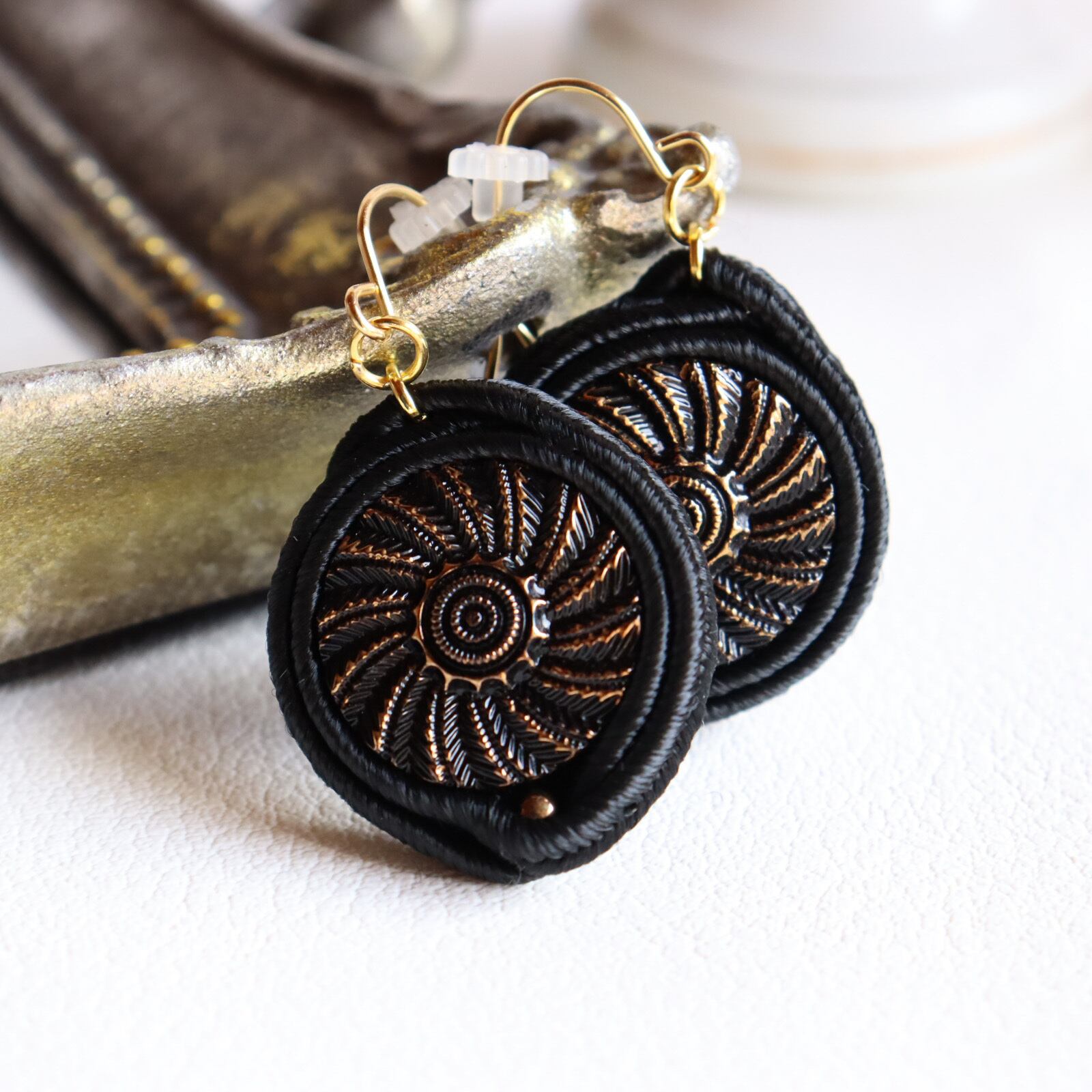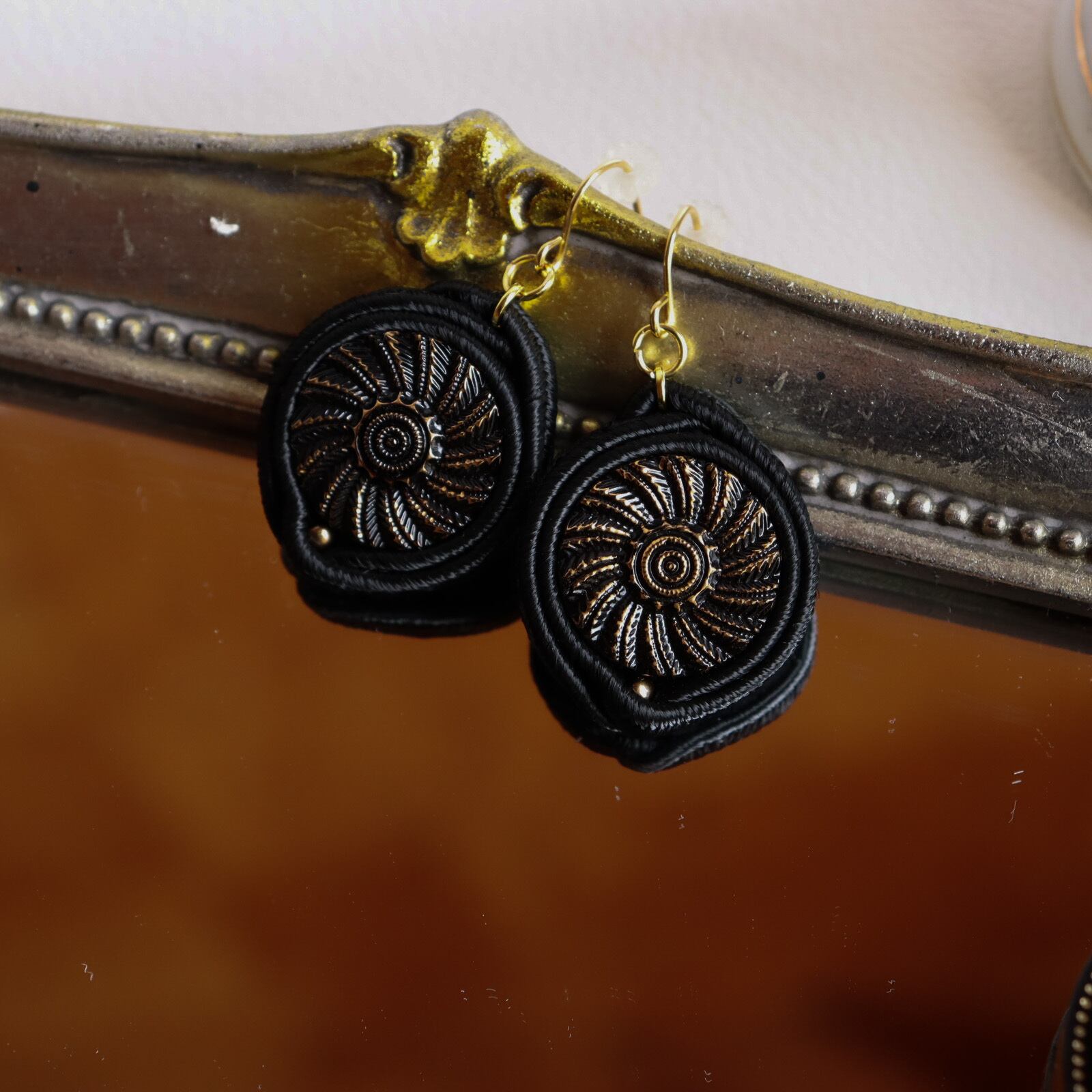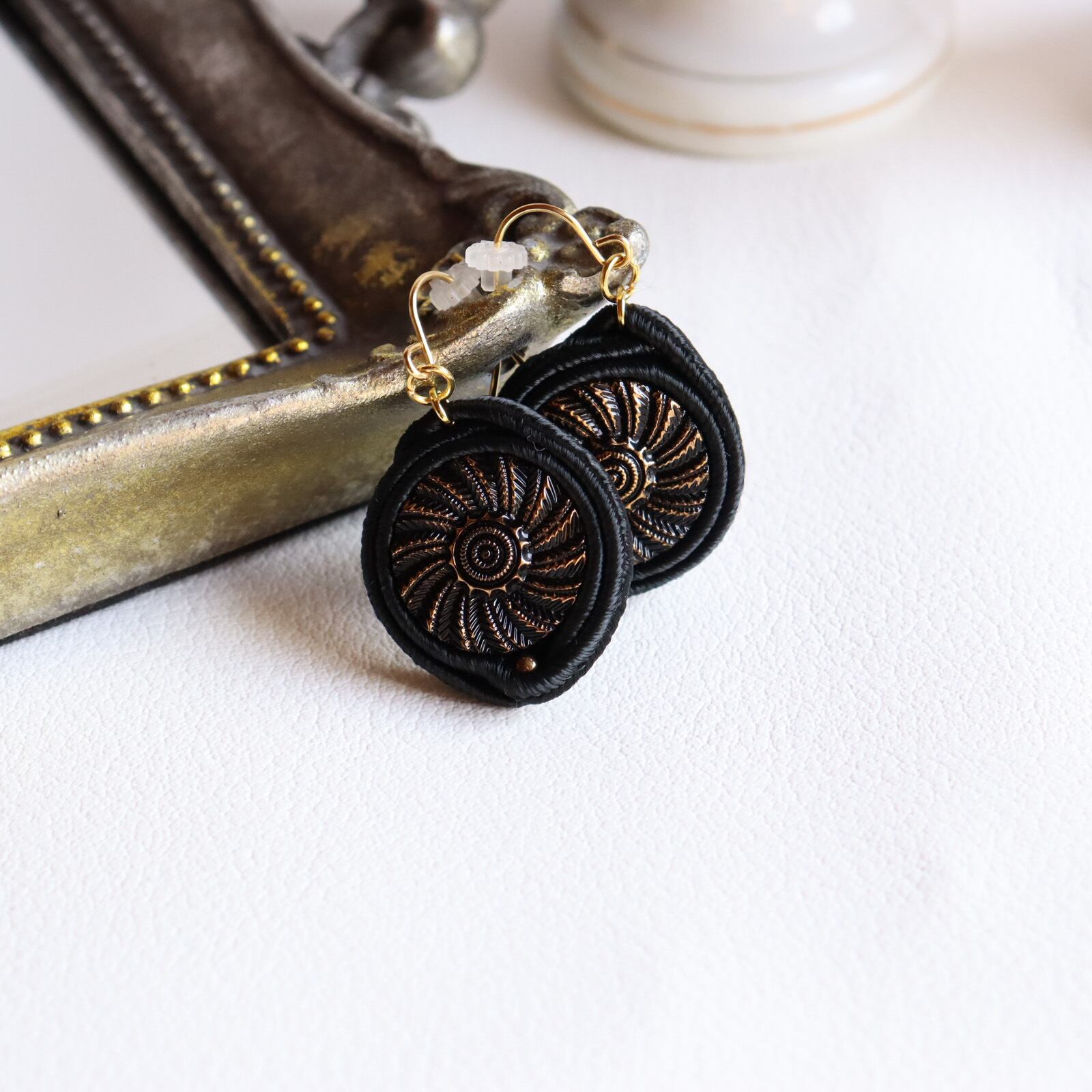 裏面加工したガラスボタンと、ソウタシエという刺繍を組み合わせた上品で個性的なボタンジュエリーを製作しました。