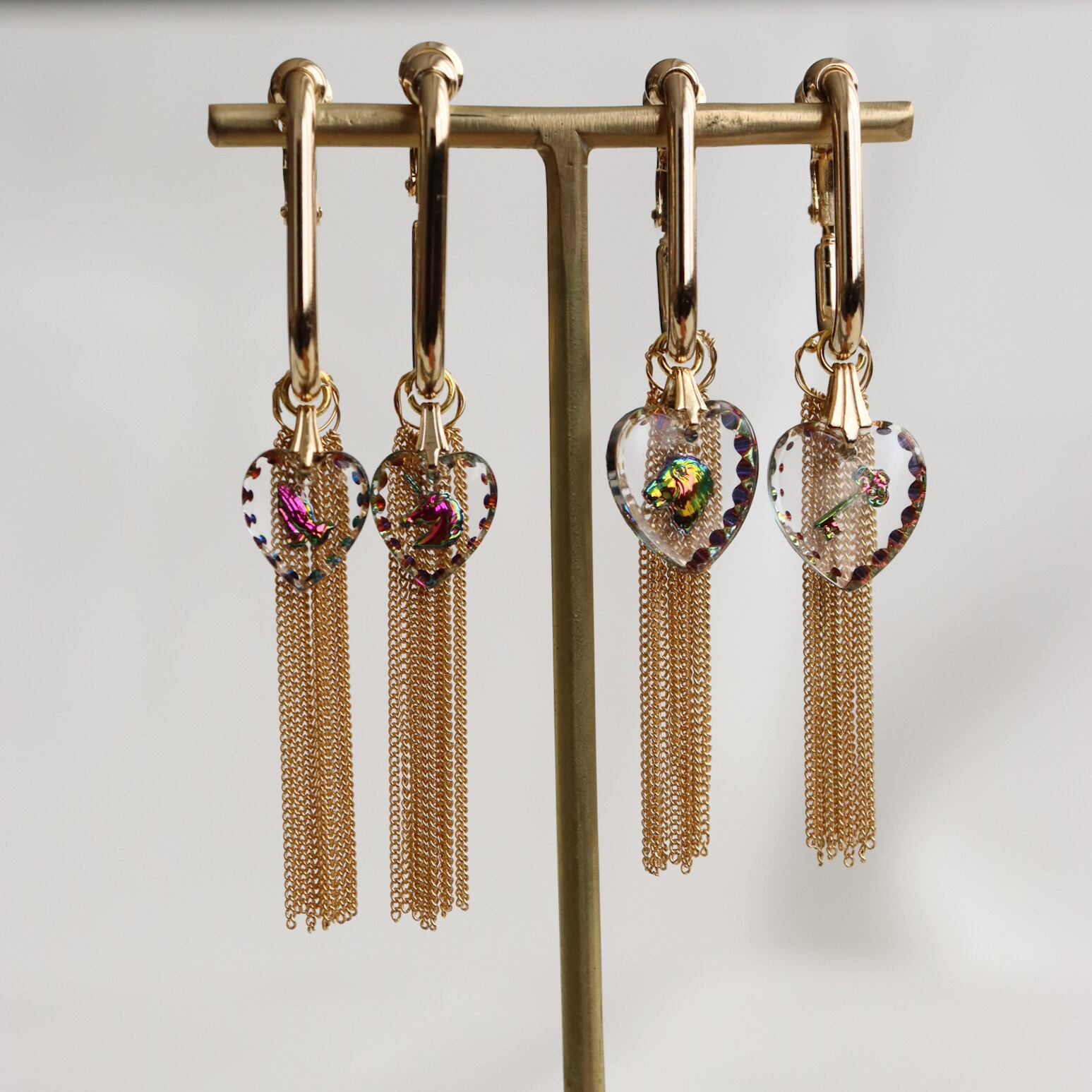 小さなハートのインタリオと、極細のチェーンを合わせた揺れる姿が美しいフープタイプのイヤリングのご紹介です。