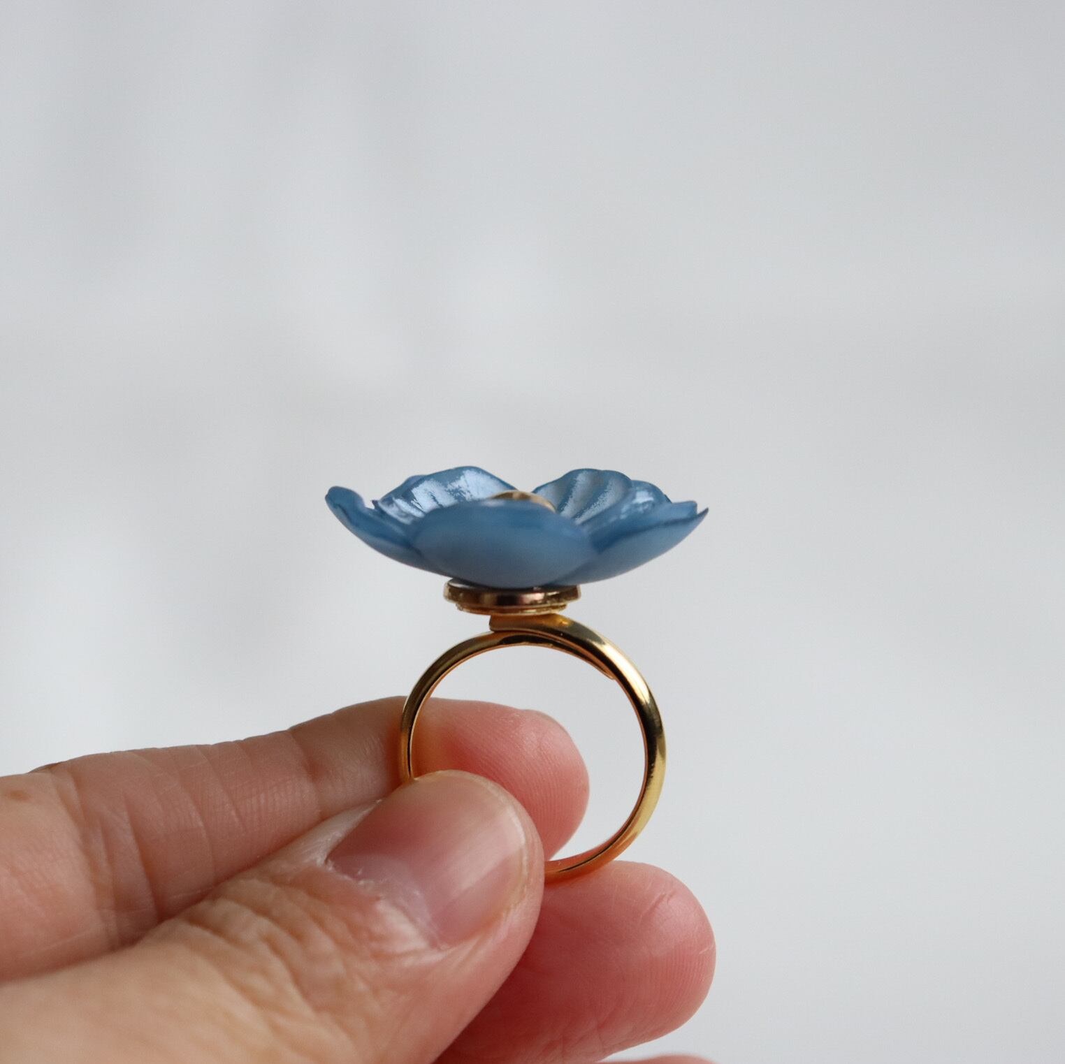 水色の花のボタンの指輪を作成しました。