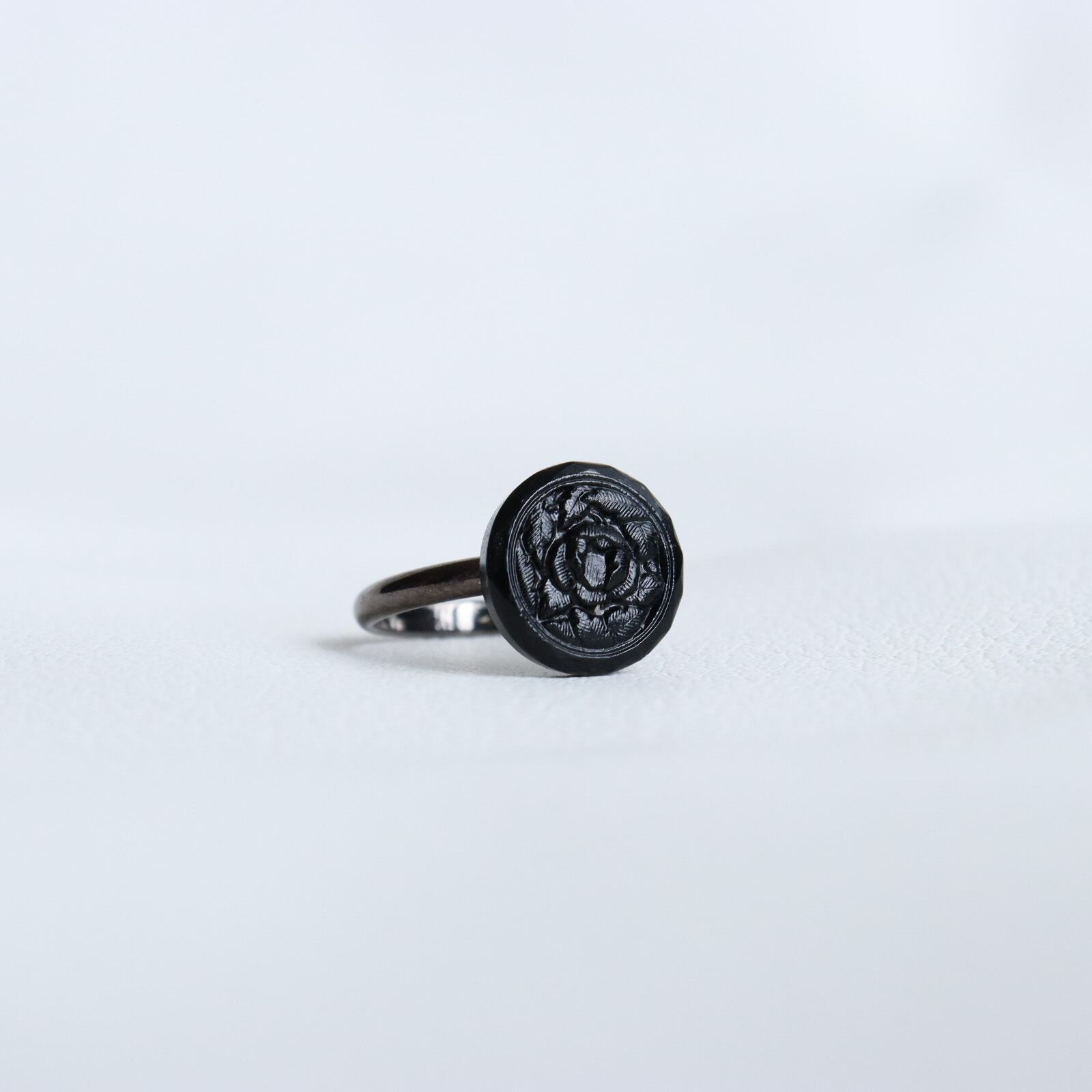 ボタンの中に咲く ”漆黒の薔薇” 真上から見るとくっきりと薔薇の彫刻が浮かび上がっているのが見えます。