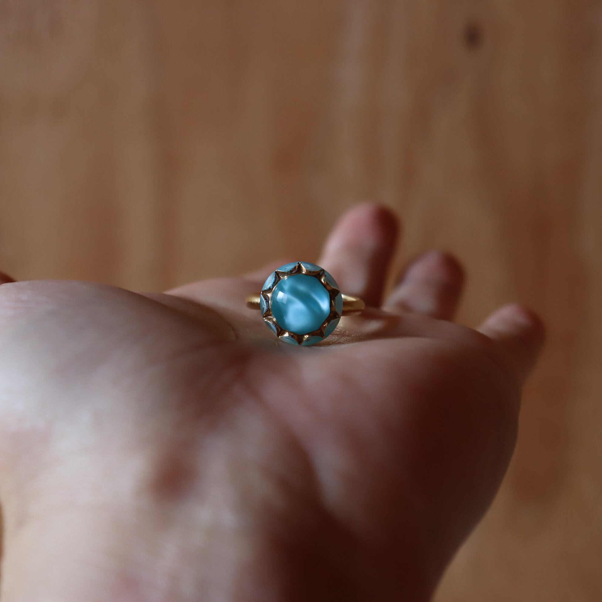 水色と金色のバランスが美しいボタンの指輪