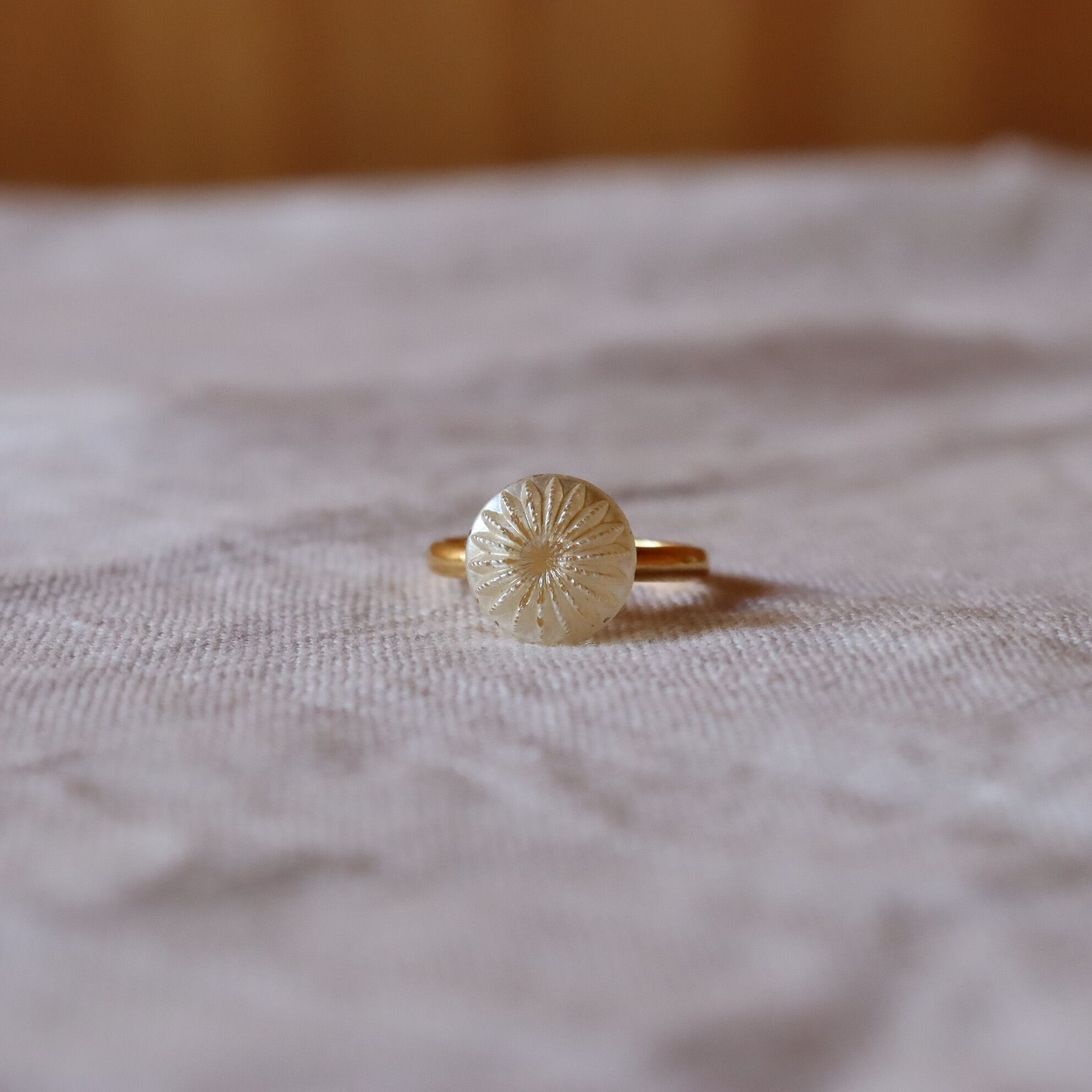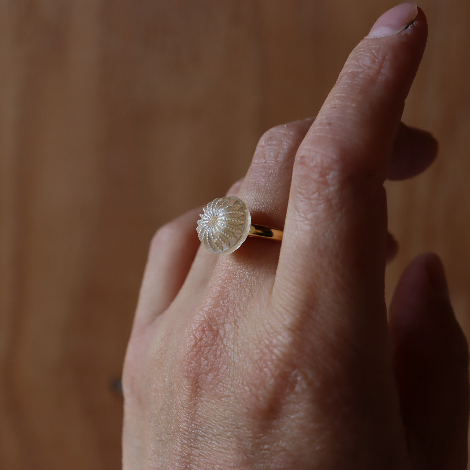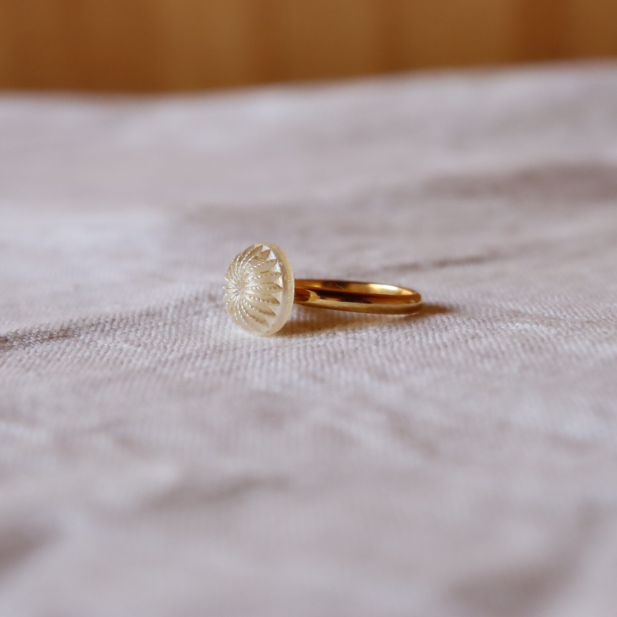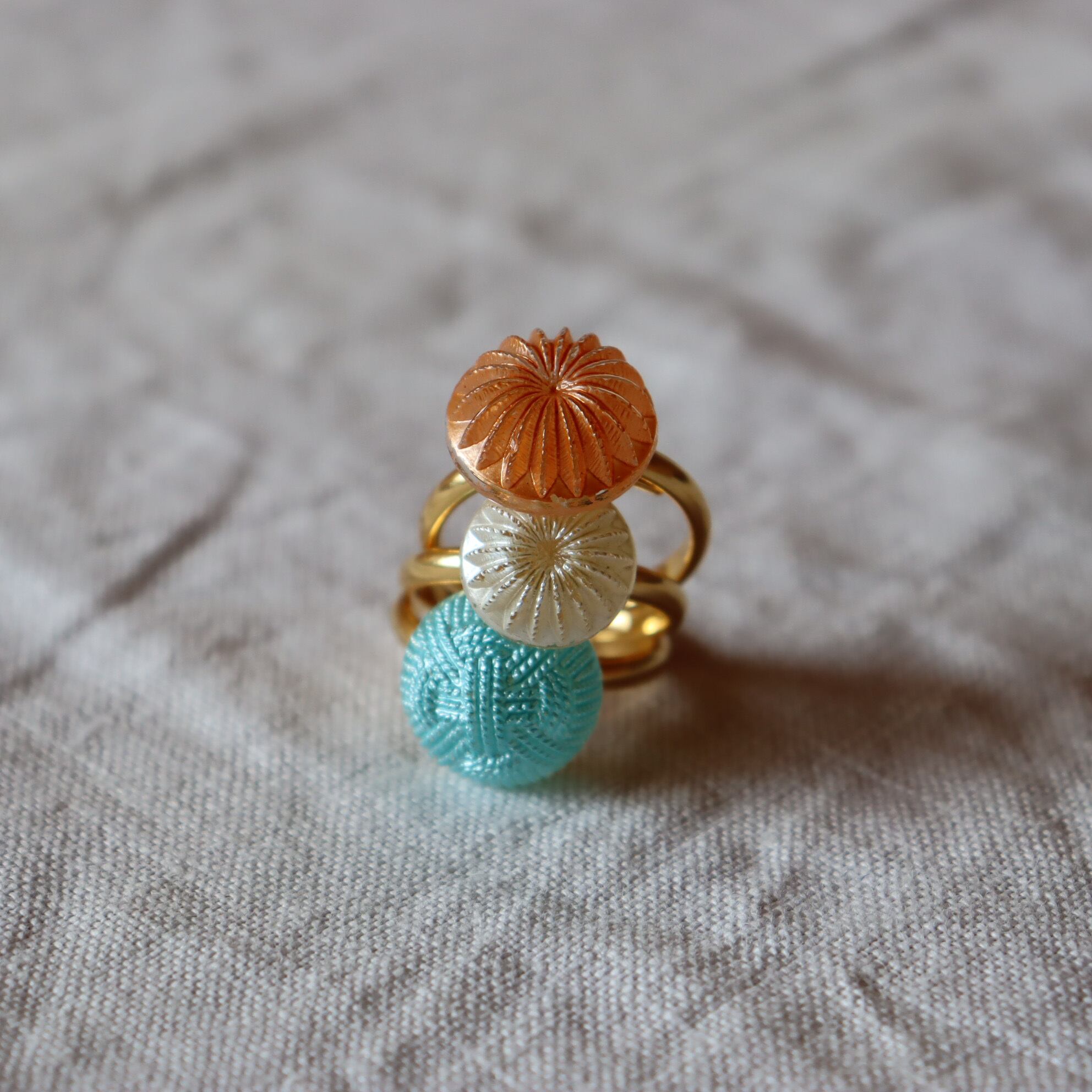海外製のヴィンテージガラスボタンを1つ1つ加工して作成した