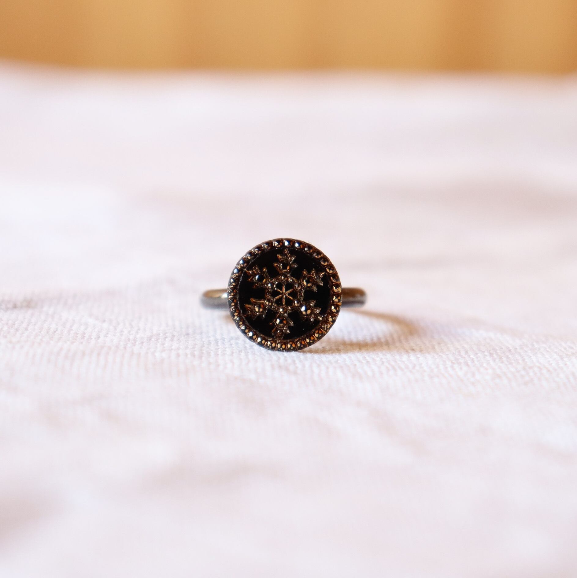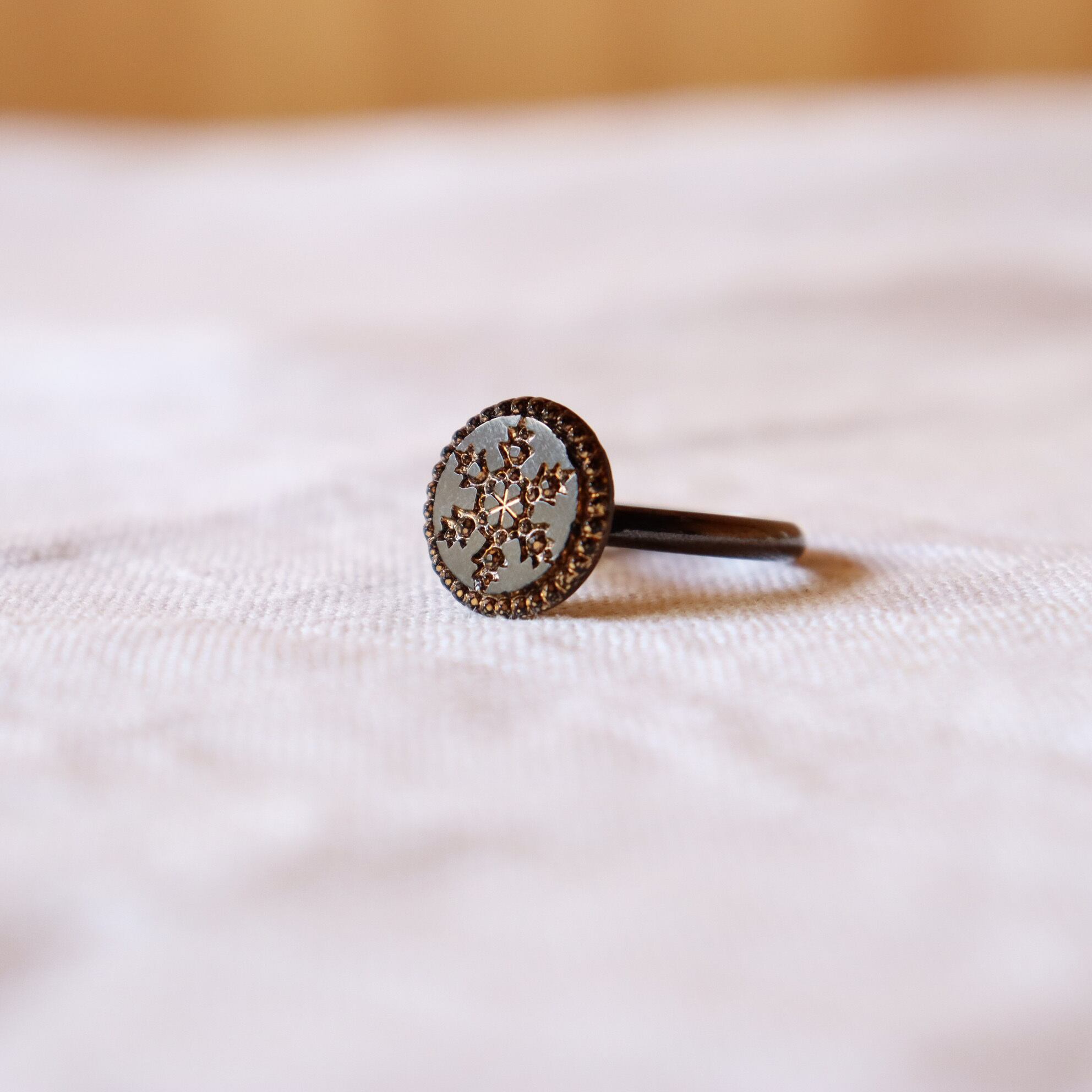 Fantastic button ring with a small snowflake design