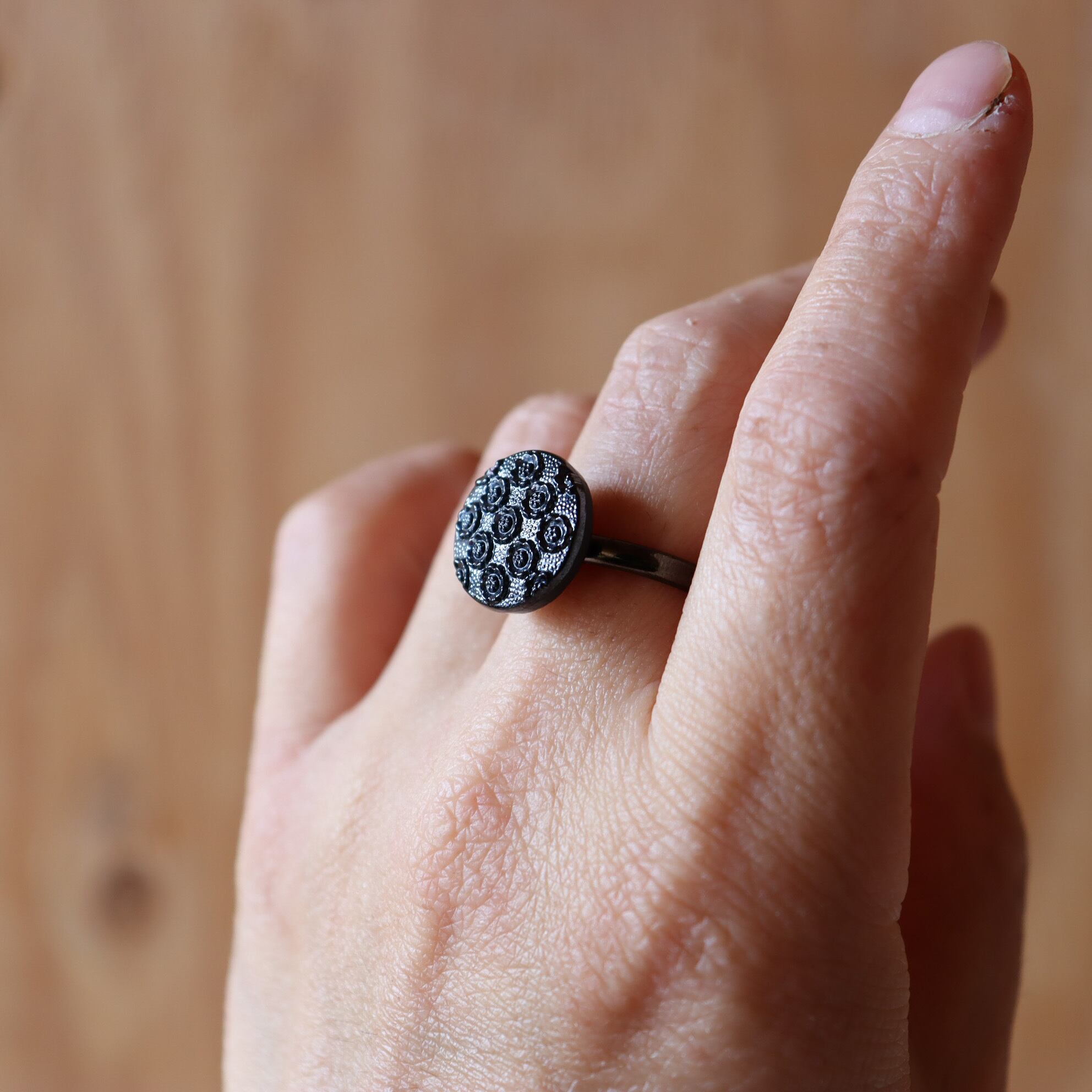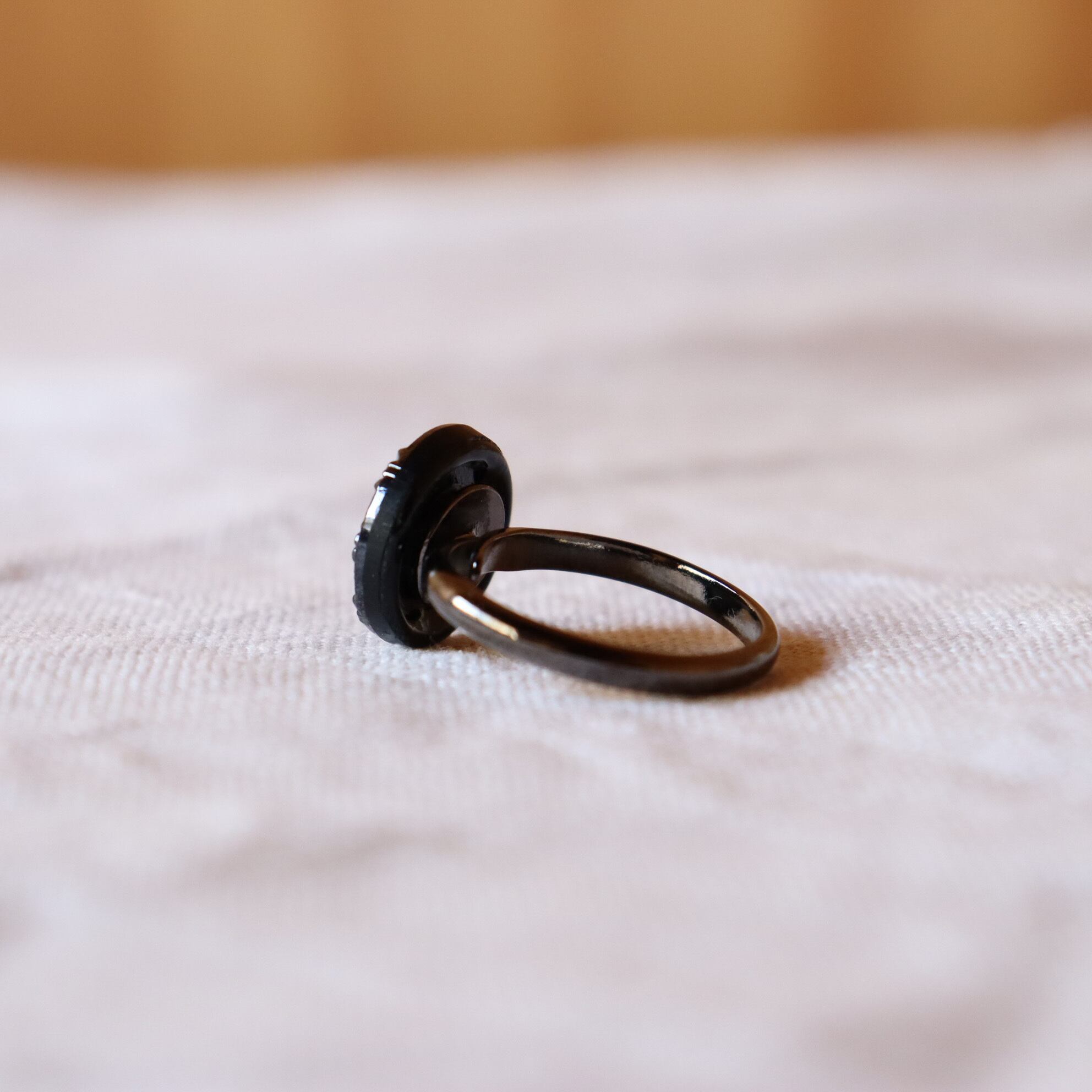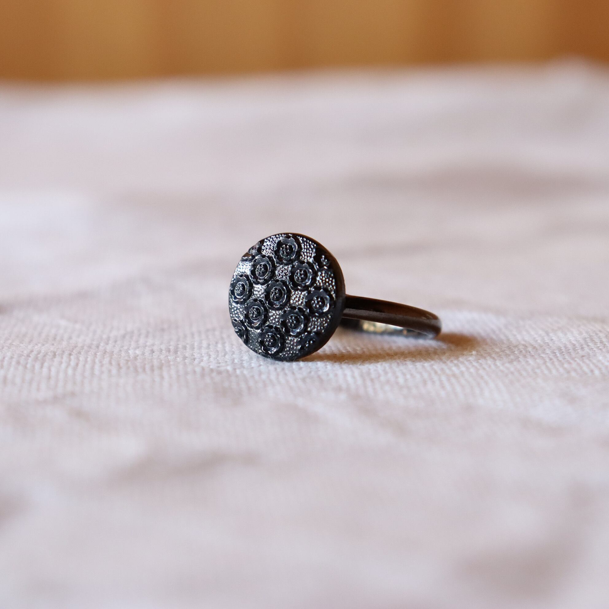海外製のヴィンテージガラスボタンを1つ1つ加工して作成した