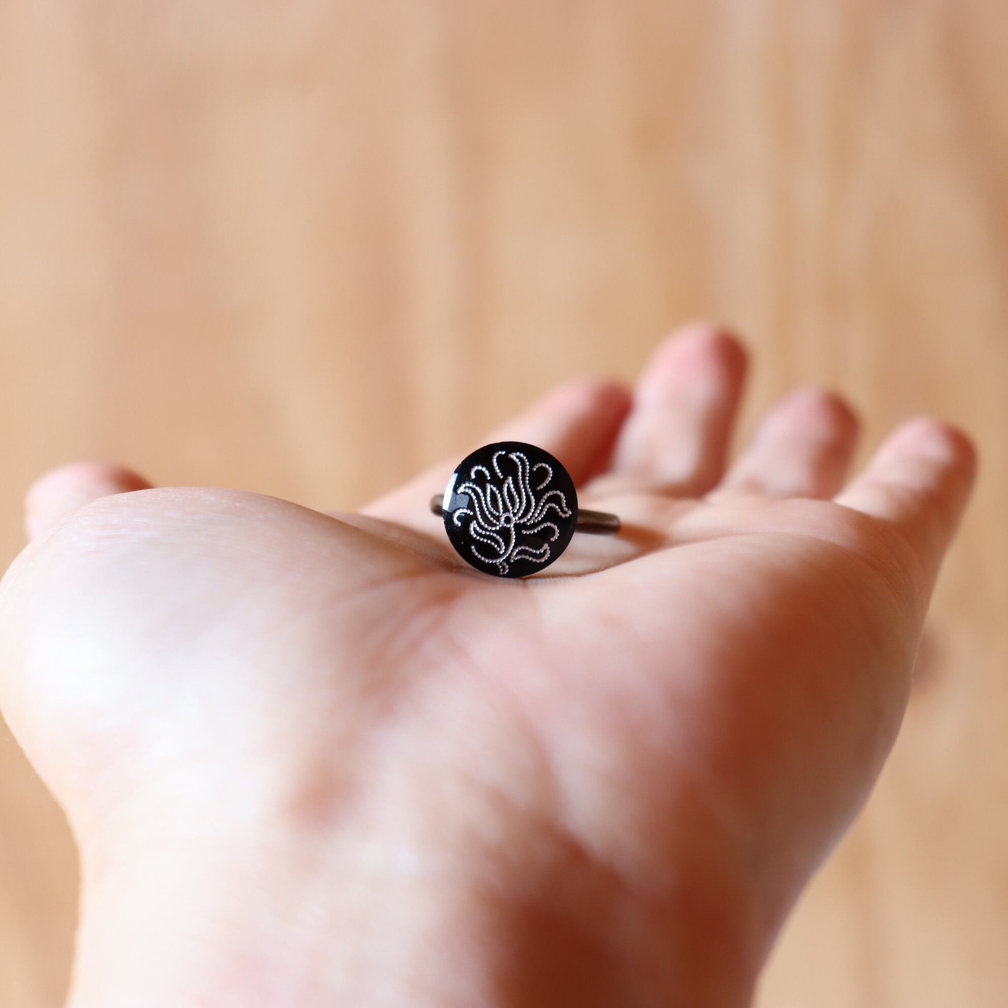 黒地に白で描かれた繊細なお花のデザインの指輪