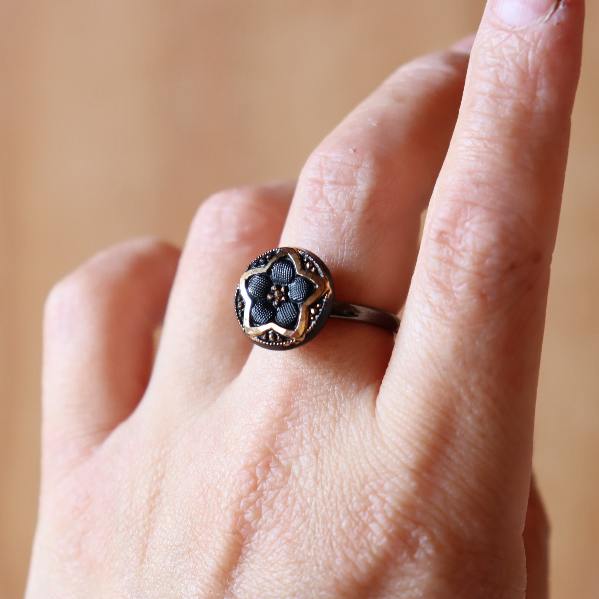 海外製のヴィンテージガラスボタンを1つ1つ加工して作成した