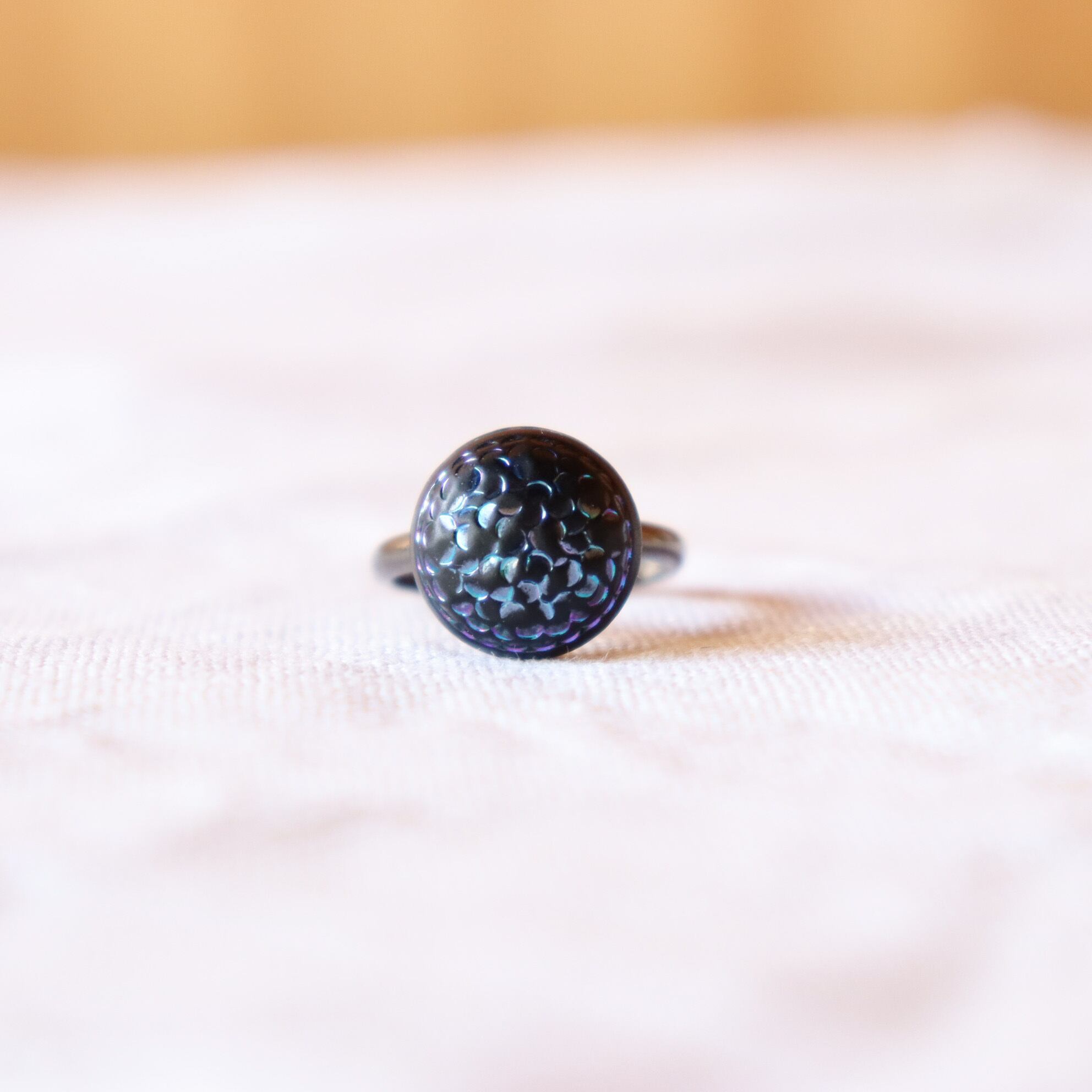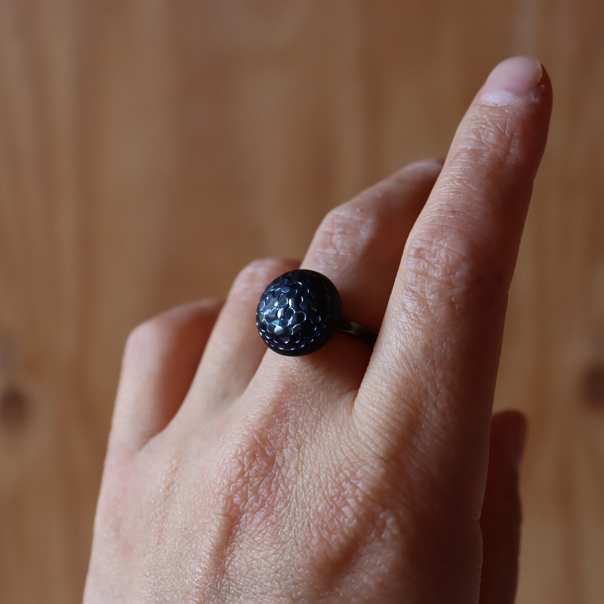 It is a fantastic button ring, like a black hydrangea blooming