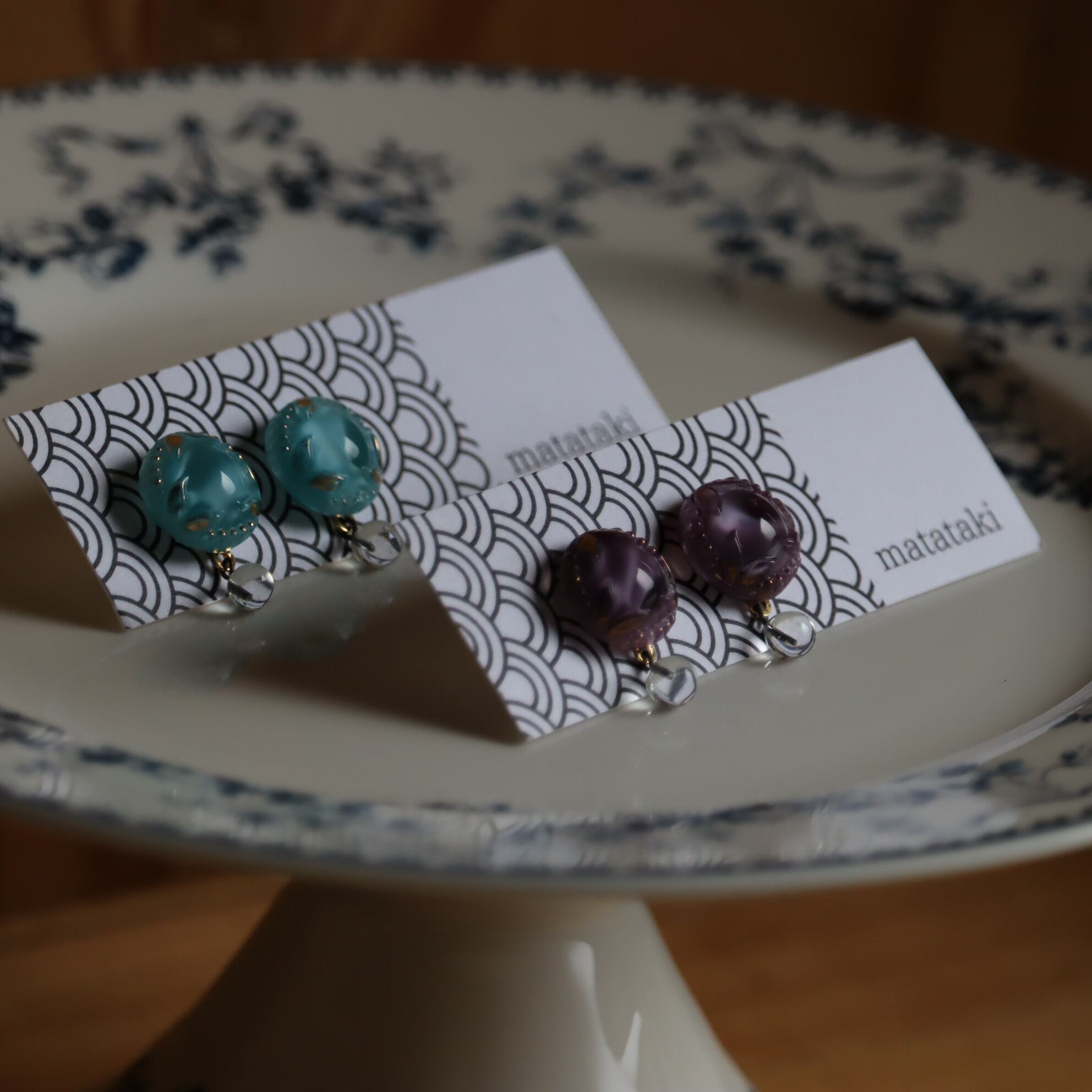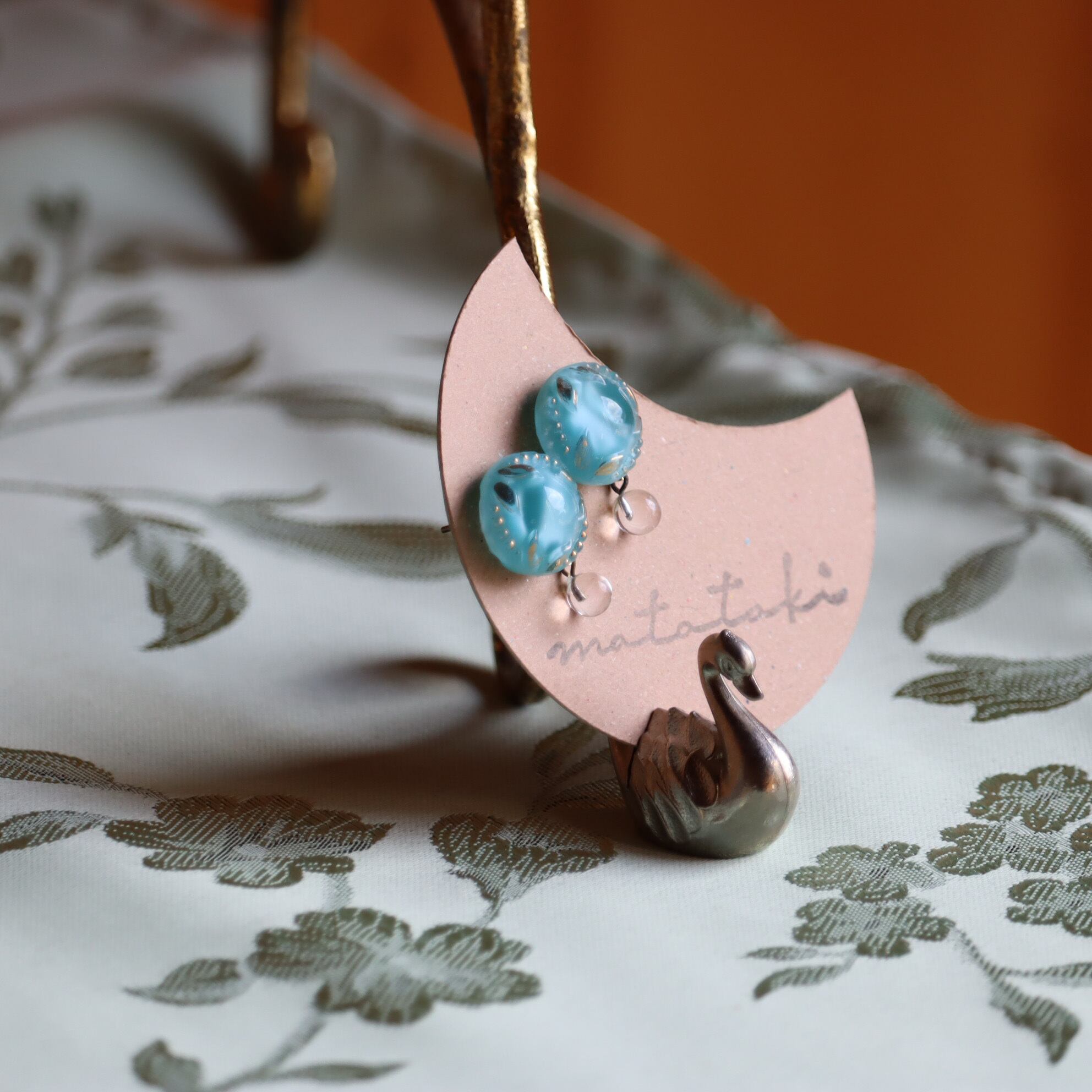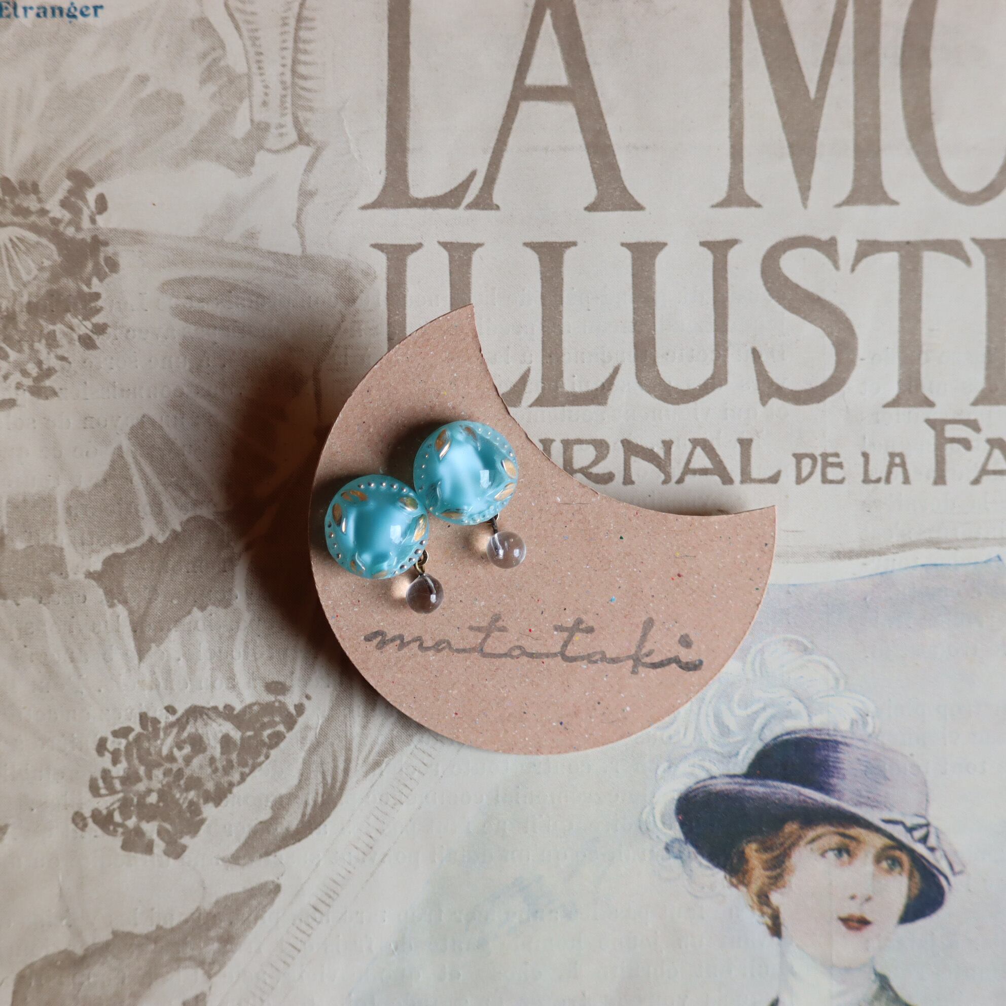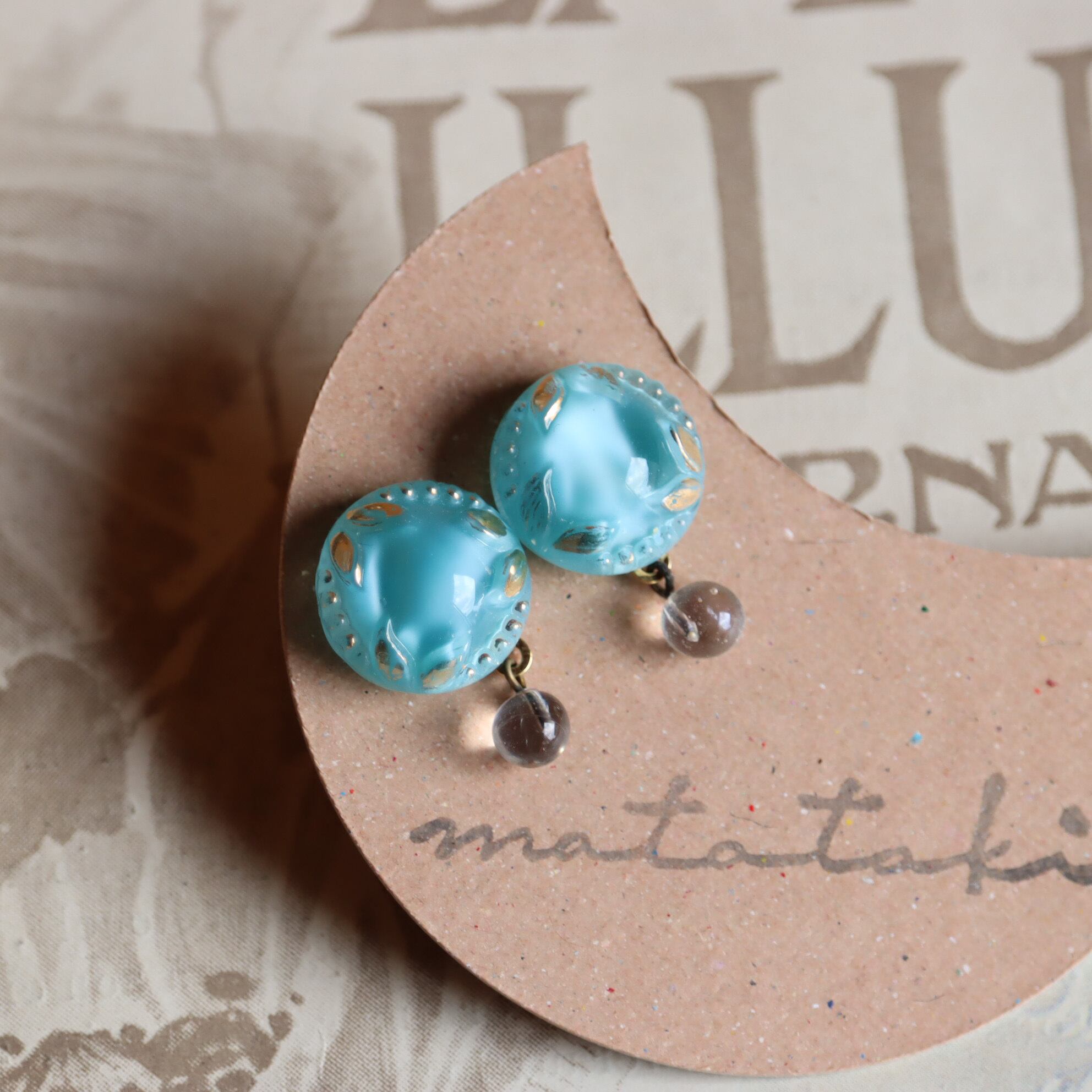 ドイツ製ヴィンテージガラスボタンを加工して作成した耳飾り「月輝」